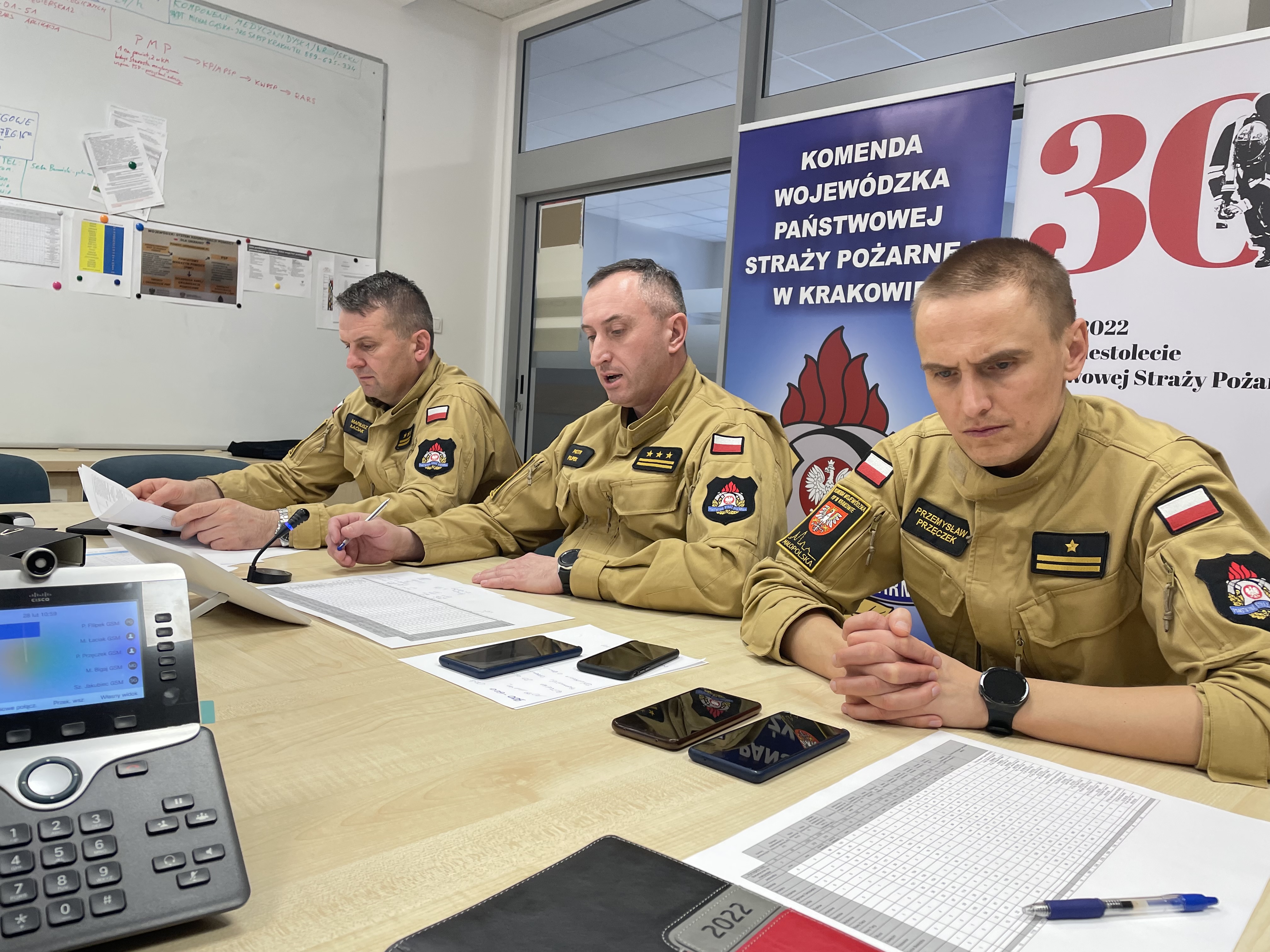 W codziennych odprawach sztabu oprócz małopolskiego komendanta wojewódzkiego PSP uczestniczą również jego zastępcy pełniący funkcję szefa sztabu – st. bryg. Mariusz Łaciak i mł. bryg. Przemysław Przęczek oraz poszczególni funkcyjni – funkcjonariusze Komendy Wojewódzkiej PSP w Krakowie. Również codziennie odbywają się odprawy służbowe w formie wideokonferencji.