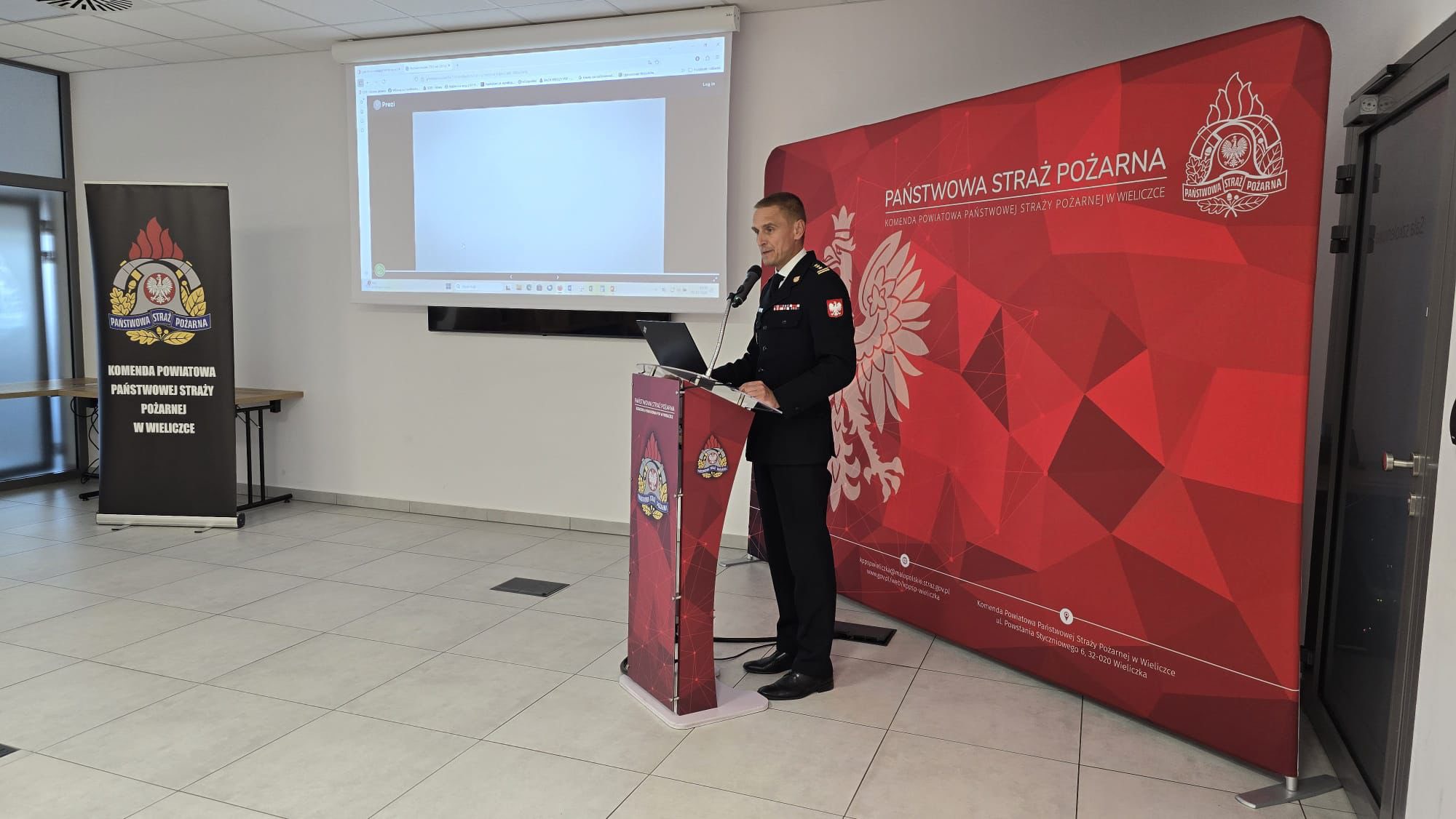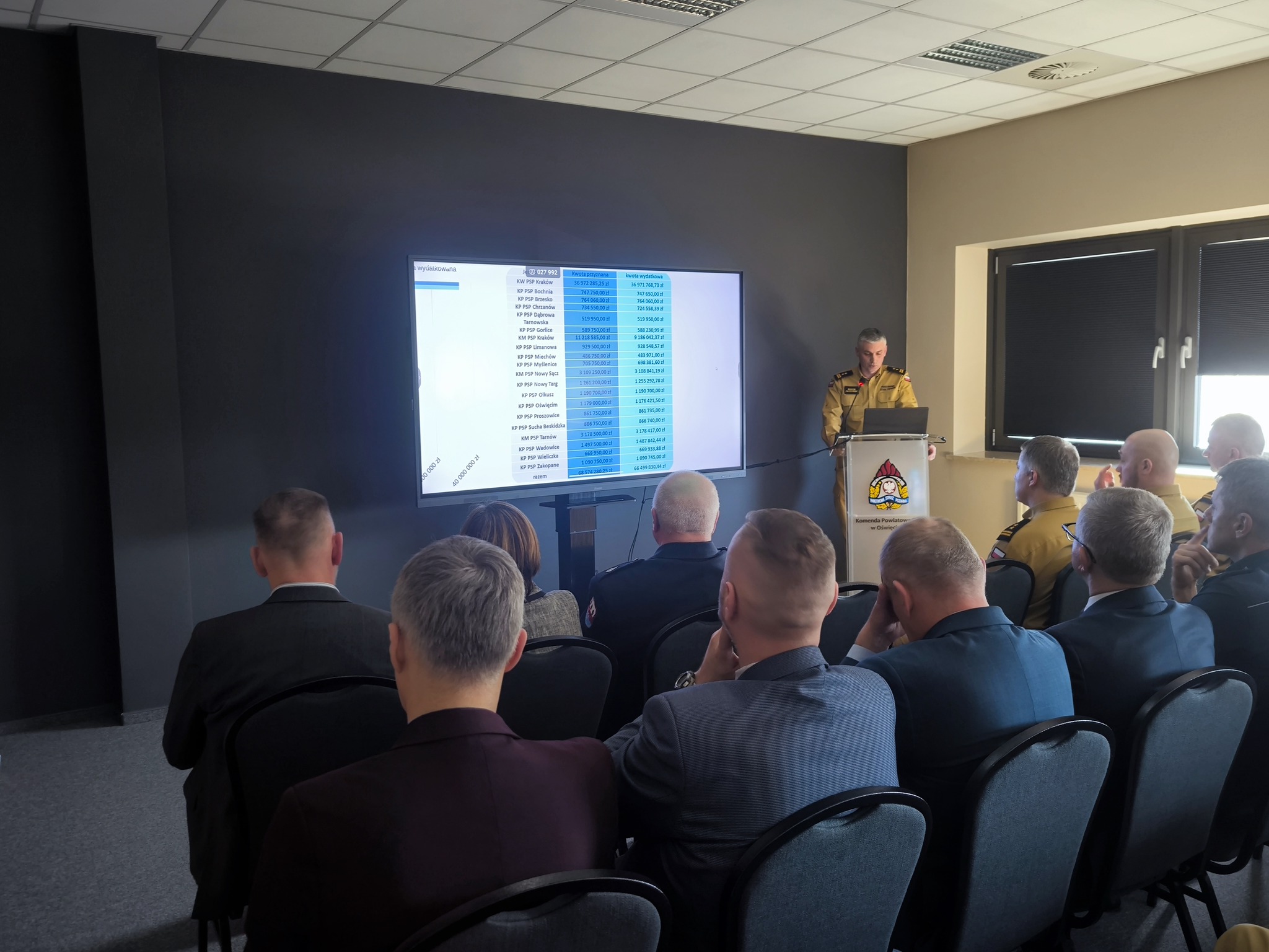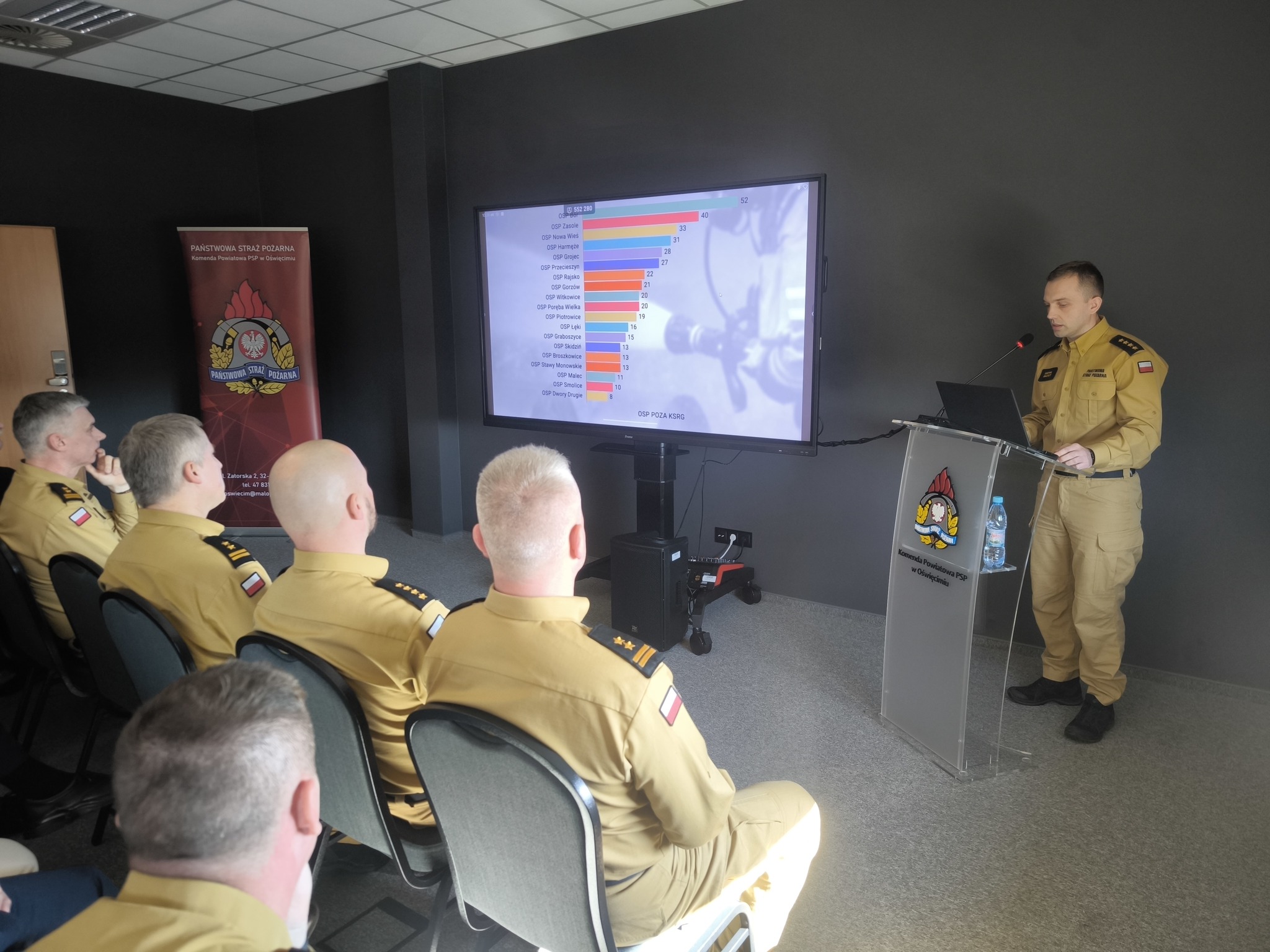 05.03.2026 r. w Komendzie Powiatowej Państwowej Straży Pożarnej w Oświęcimiu odbyła się narada podsumowująca działalność tut. jednostki organizacyjnej Państwowej Straży Pożarnej w 2025 r. oraz jednostek OSP powiatu oświęcimskiego. Naradę rozpoczęto od złożenia meldunku Z-cy Małopolskiego Komendanta Wojewódzkiego PSP Panu bryg. Marcinowi Głogowskiemu. Następnie głos zabrał Komendant Powiatowy PSP bryg. Ryszard Dudek, który przywitał przybyłych gości, podsumował działalność oświęcimskich strażaków w 2025 r. oraz podziękował wszystkim za współpracę. W dalszej części narady sprawozdanie z działalności KW PSP na obszarze województwa oraz plany i przedsięwzięcia na rok 2026 przedstawił Z-ca Małopolskiego Komendanta Wojewódzkiego PSP bryg. Marcin Głogowski.