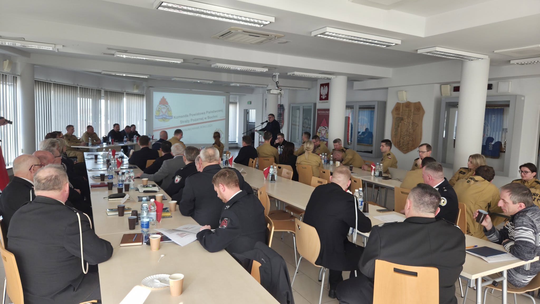 05.03.2026 r. odbyła się uroczystość rozpoczęła się od złożenia meldunku o gotowości do rozpoczęcia narady Zastępcy Małopolskiego Komendanta Wojewódzkiego PSP st. bryg. Jacka Ryncarza przez Zastępcę Komendanta Powiatowego Państwowej Straży Pożarnej w Bochni st. kpt. Bartłomieja Łąckiego. Podczas spotkania Komendant Powiatowy PSP w Bochni st. bryg. Paweł Matyasik przedstawił podsumowanie działalności Komendy Powiatowej Państwowej Straży Pożarnej w Bochni w 2025 roku. W swoim wystąpieniu zaprezentował najważniejsze działania operacyjne, przedsięwzięcia szkoleniowe, inicjatywy organizacyjne oraz wydarzenia, które miały miejsce w ciągu minionych dwunastu miesięcy. W dalszej części narady prezentację z działalności KW PSP na obszarze województwa oraz plany i przedsięwzięcia na rok 2026 przedstawił Z-ca Małopolskiego Komendanta Wojewódzkiego PSP st. bryg. Jacek Ryncarz.