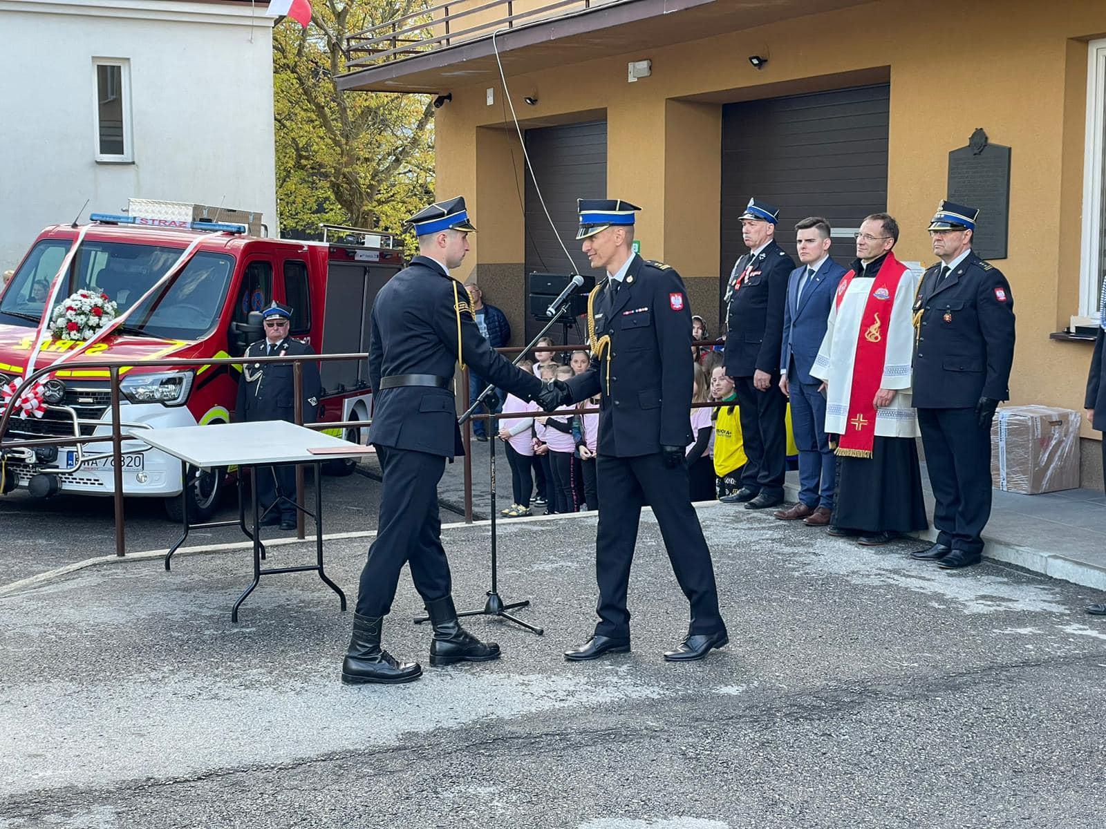 Bryg. Przemysław Przęczek Małopolski Komendant Wojewódzki wziął udział w uroczystości przekazania nowego samochodu pożarniczego dla Ochotniczej Straży Pożarnej w Marcyporębie w pow. wadowickim.