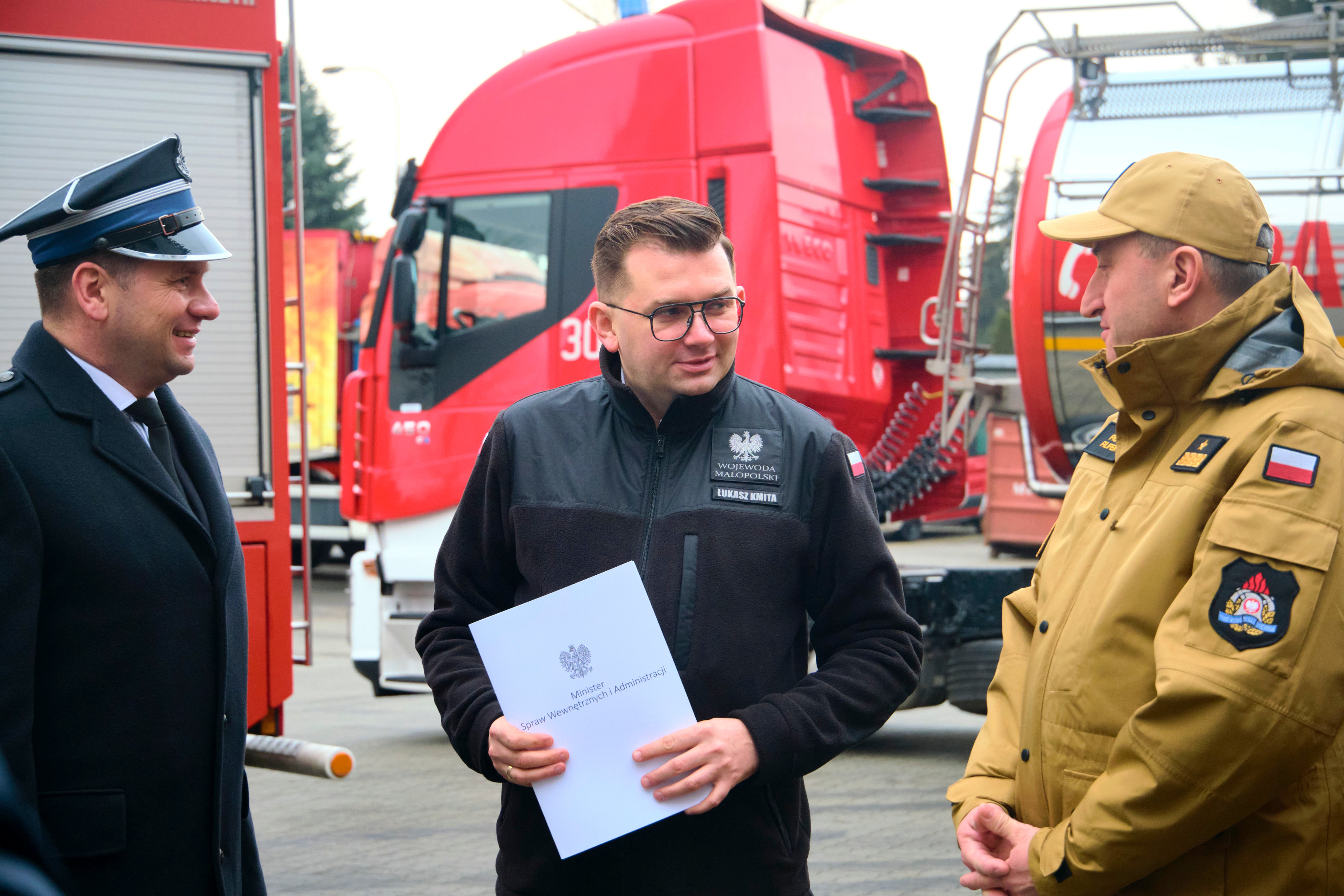 Lekkie, średnie i ciężkie – łącznie 62 – wozy strażackie trafią do małopolskich Ochotniczych Straży Pożarnych. To efekt decyzji kierownictwa Ministerstwa Spraw Wewnętrznych i Administracji, które wczoraj przedstawiło ogólnopolskie zestawienie jednostek z dofinansowaniem. O wynikach dla Małopolski podczas briefingu prasowego w Komendzie Wojewódzkiej Państwowej Straży Pożarnej w Krakowie mówił wojewoda Łukasz Kmita, wicemarszałek województwa małopolskiego, członek Zarządu Głównego Związku Ochotniczych Straży Pożarnych RP, wiceprezes Zarządu Oddziału Wojewódzkiego ZOSP RP Łukasz Smółka oraz małopolski komendant wojewódzki PSP nadbryg. Piotr Filipek.