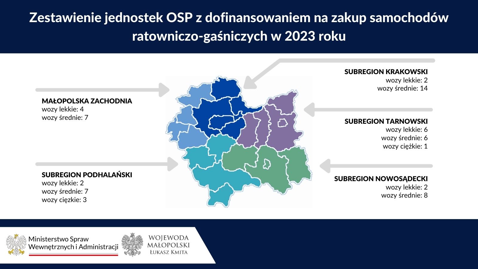 – Nowy sprzęt to większe bezpieczeństwo. Ministerstwo Spraw Wewnętrznych i Administracji przyznało dofinasowania dla zakupu 62 wozów ratowniczo-gaśniczych w Małopolsce. Do małopolskich jednostek OSP trafią 4 ciężkie, 42 średnie i 16 lekkich wozów, które w razie zagrożenia będą do dyspozycji dla strażaków ochotników, aby ci nieśli pomoc. Niejednokrotnie to właśnie druhowie z OSP na miejsca wypadków docierają jako pierwsi. W ostatnich latach widoczny jest wzrost zakresu rządowych inwestycji wspierających działalność jednostek OSP. Dla porównania w ubiegłym roku w skali Polski zakupiono 533 nowe wozy, podczas gdy w roku 2014 było ich jedynie 229. To będzie dobry rok dla małopolskich druhów. Liczba nowych samochód, które otrzymali w 2021, wynosiła 53. Teraz będzie ich jeszcze więcej. Najwięcej wozów, bo aż 8 średnich i 1 lekki trafi do jednostek z powiatu krakowskiego. 5 wozów, w tym 3 średnie i 2 lekkie, otrzymają OSP z powiatu wadowickiego, a 3 średnie i 1 lekki z powiatu bocheńskiego. Wsparcie w postaci nowych 29 wozów trafi też w tym roku do PSP – mówi wojewoda małopolski Łukasz Kmita.