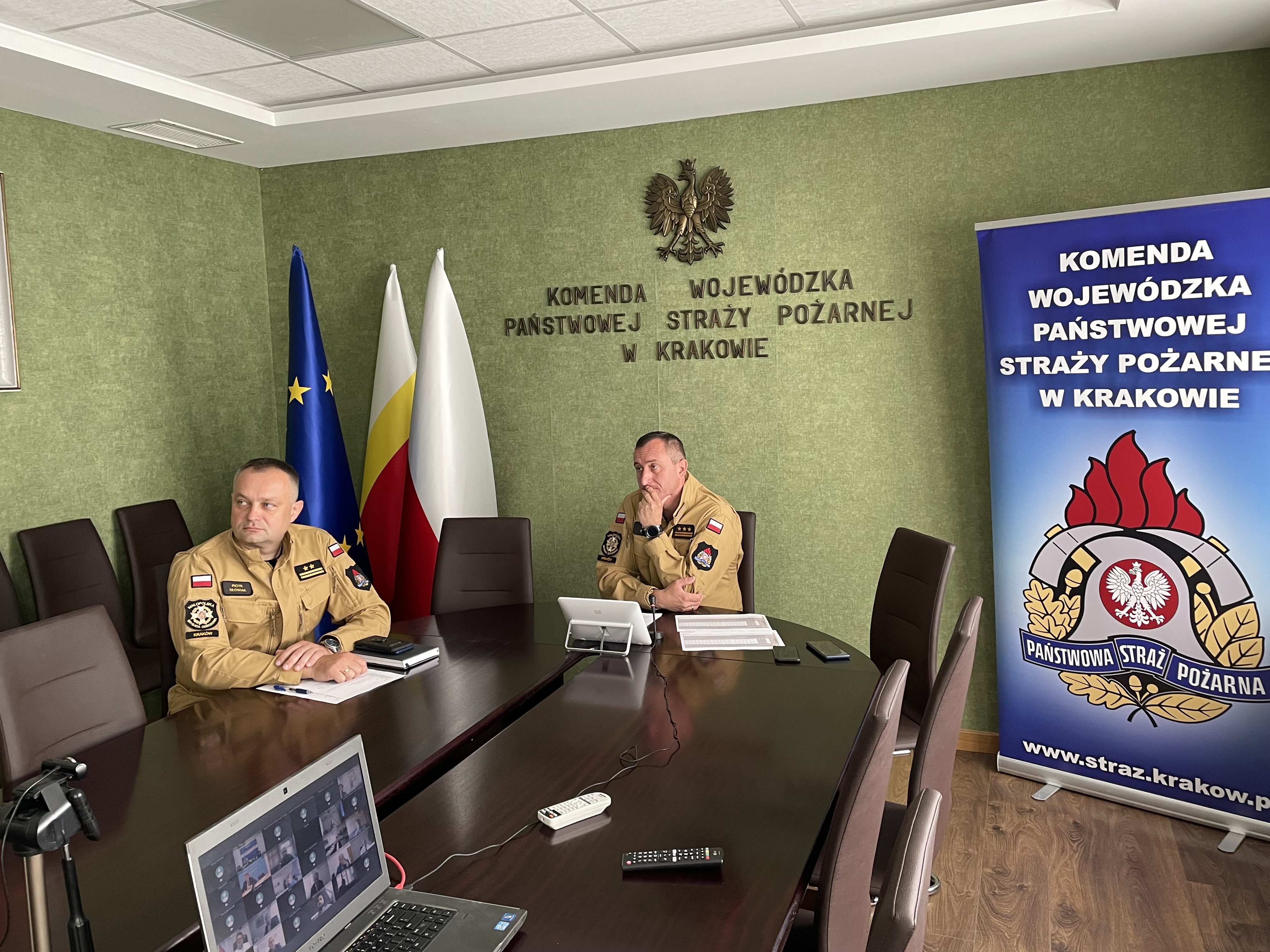 Małopolski komendant wojewódzki PSP st. bryg. Piotr Filipek wraz z zastępcą bryg. Piotrem Słowiakiem złożyli wojewodzie małopolskiemu - Łukaszowi Kmicie meldunek o bieżącej sytuacji oraz podjmowanych przez strażaków działaniach.