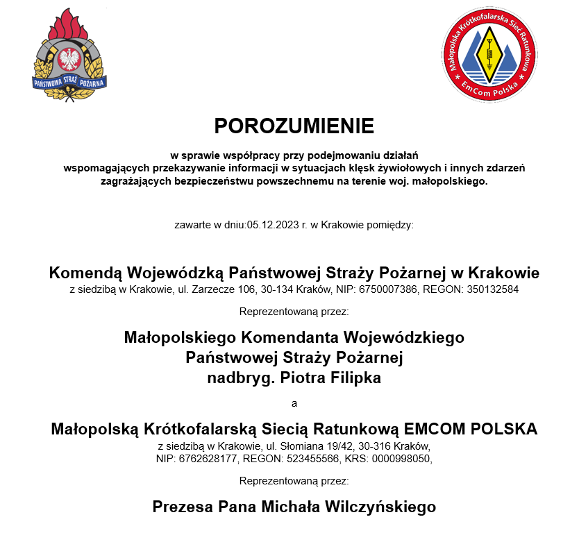 05.12.2023 r. nadbryg. Piotr Filipek Małopolski Komendant Wojewódzki PSP podpisał porozumienie z Małopolską Krótkofalarską Siecią Ratunkową EMCOM POLSKA o współpracy przy podejmowaniu działań wspomagających przekazywanie informacji w sytuacjach klęsk żywiołowych i innych zdarzeń zagrażających bezpieczeństwu powszechnemu na terenie woj. małopolskiego . Z ramienia MKSR EmCom Polska dokument podpisał Prezes Michał Wilczyński.