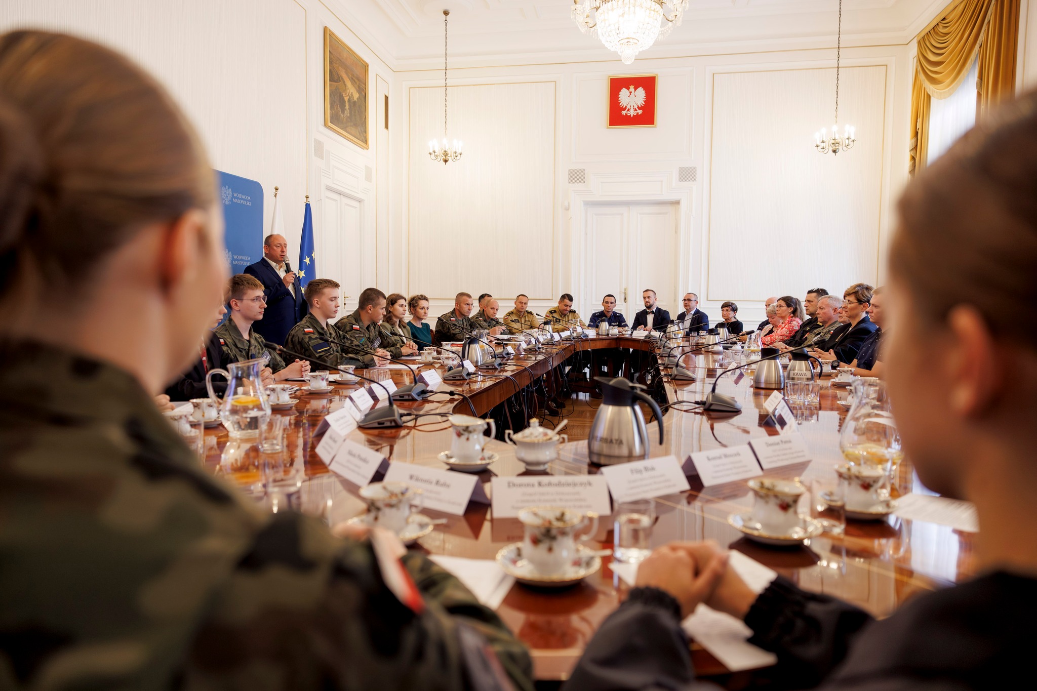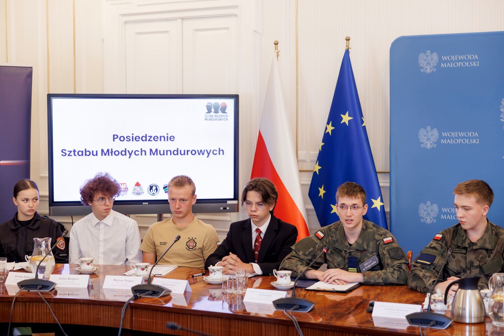 W dzisiejszym posiedzeniu Sztabu Młodych Mundurowych uczestniczyli: wojewoda małopolski Krzysztof Jan Klęczar, dowódca 11 Małopolskiej Brygady Obrony Terytorialnej płk Marcin Siudziński, zastępca małopolskiego komendanta wojewódzkiego Państwowej Straży Pożarnej w Krakowie st. bryg. Jacek Ryncarz, w zastępstwie szefa Ośrodka Zamiejscowego w Krakowie Centralnego Wojskowego Centrum Rekrutacji ppłk Mariusz Błaszczyk, w imieniu małopolskiego państwowego wojewódzkiego inspektora sanitarnego - pełniący obowiązki zastępca dyrektora ds. bezpieczeństwa Marek Gajowy oraz kierownik Działu Nadzoru Sanitarnego Daniel Cyz.