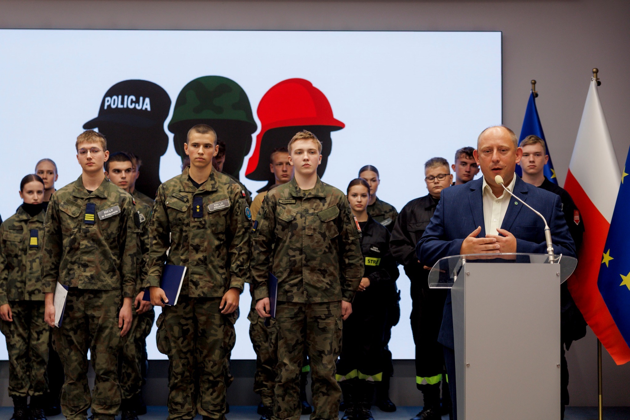 – Chcieliśmy w ten sposób pokazać uczniom uczestniczącym w projekcie, jak wyglądają posiedzenia Wojewódzkiego Zespołu Zarządzania Kryzysowego, bo to może im się kiedyś przydać. I muszę powiedzieć, że jestem dumny z Młodych Mundurowych. Dziś wraz z przedstawicielami małopolskich służb i Wojska symbolicznie przekazaliśmy im pałeczkę i to oni składali raporty podsumowujące wakacje. Są gotowi do tego, by poważnie traktować sprawy związane z bezpieczeństwem. By robić coś „ponad”, działać, angażować się. To niezwykle ważne, bo od takiego podejścia zaczyna się budowanie społecznej odporności i kształtowanie lokalnych liderów. Szczerze życzę im, by rozwinęli skrzydła w poszczególnych formacjach i dalej umacniali swoje charaktery. Z pewnością będziemy chcieli kontynuować współpracę ze Sztabem Młodych Mundurowych, szczególnie w ramach działań edukacyjnych związanych z ochroną ludności i obroną cywilną – mówi wojewoda małopolski Krzysztof Jan Klęczar.