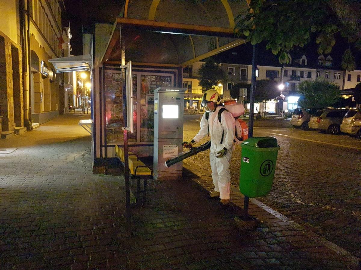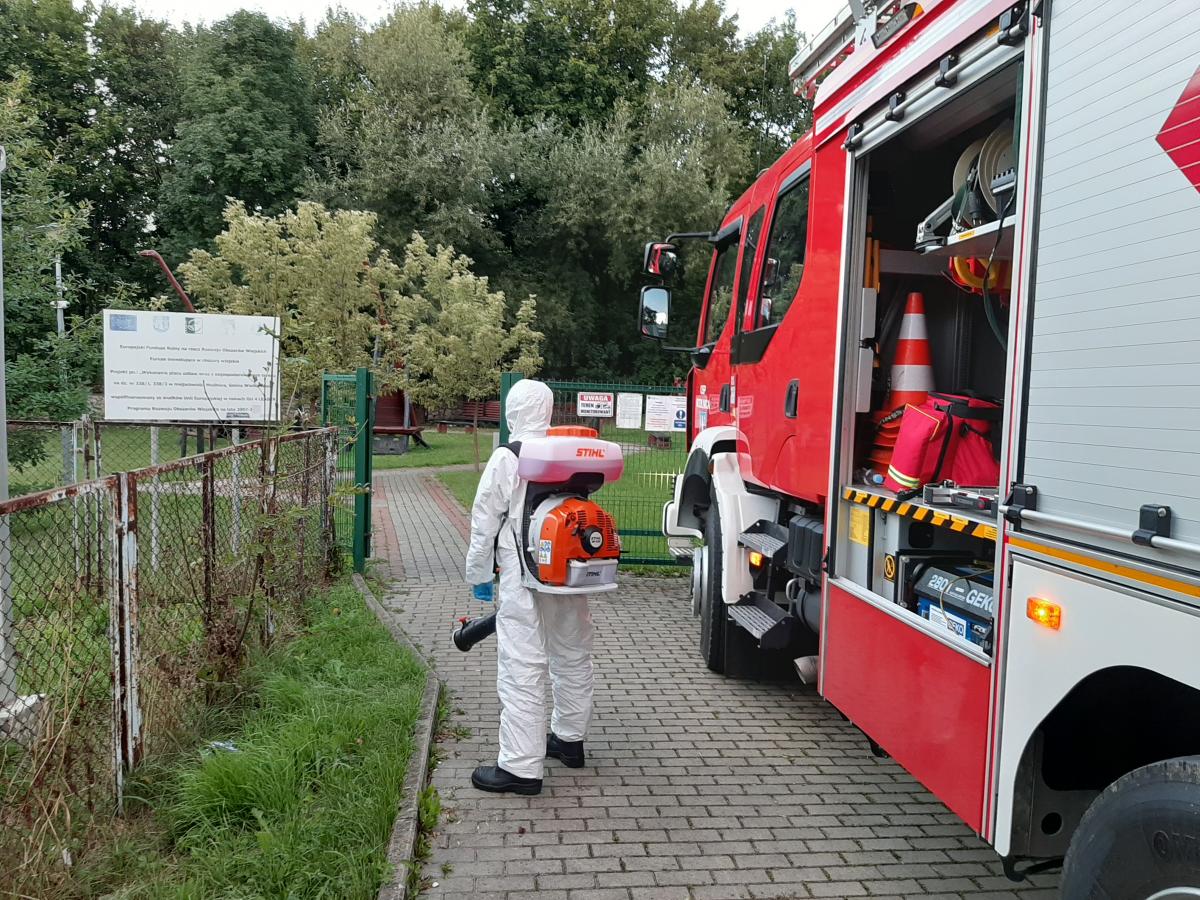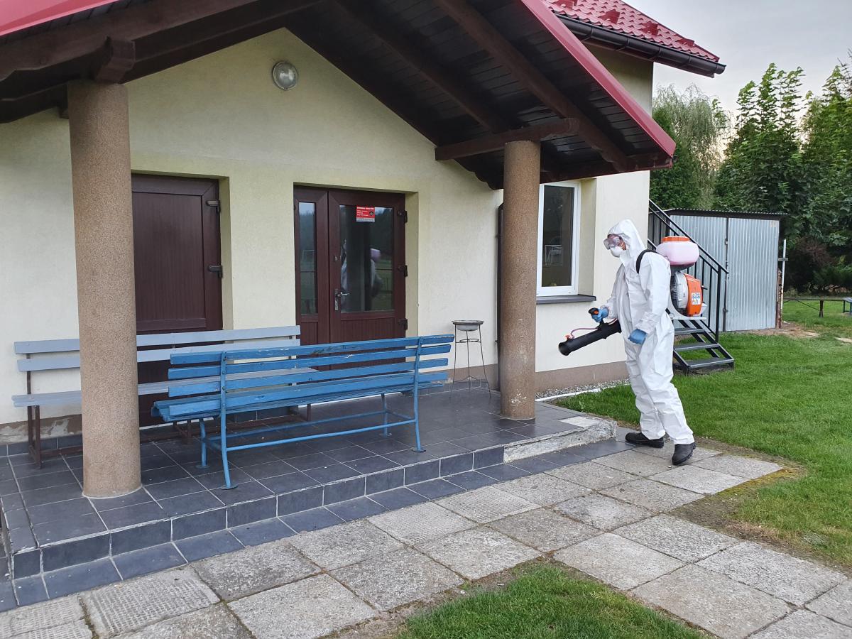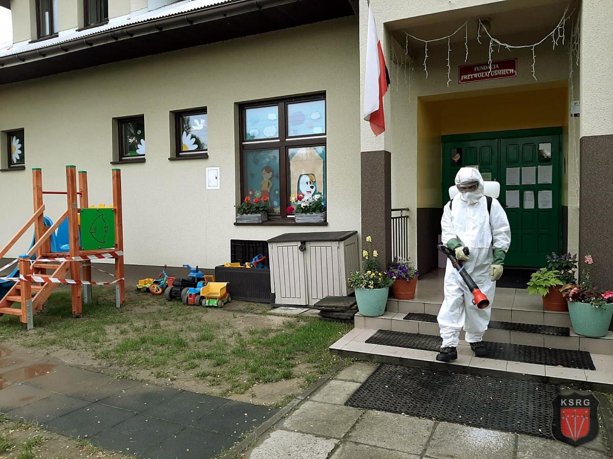 W ramach współpracy jednostek ochrony przeciwpożarowej z samorządami lokalnymi, dezynfekują miejsca przestrzeni publicznej takie jak m.in. przystanki autobusowe, obiekty sakralne, przedszkola, place zabaw, siłownie plenerowe. Działania polegają na odkażeniu środkiem dezynfekcyjnym przy wykorzystaniu specjalnych przenośnych opryskiwaczy spalinowych.