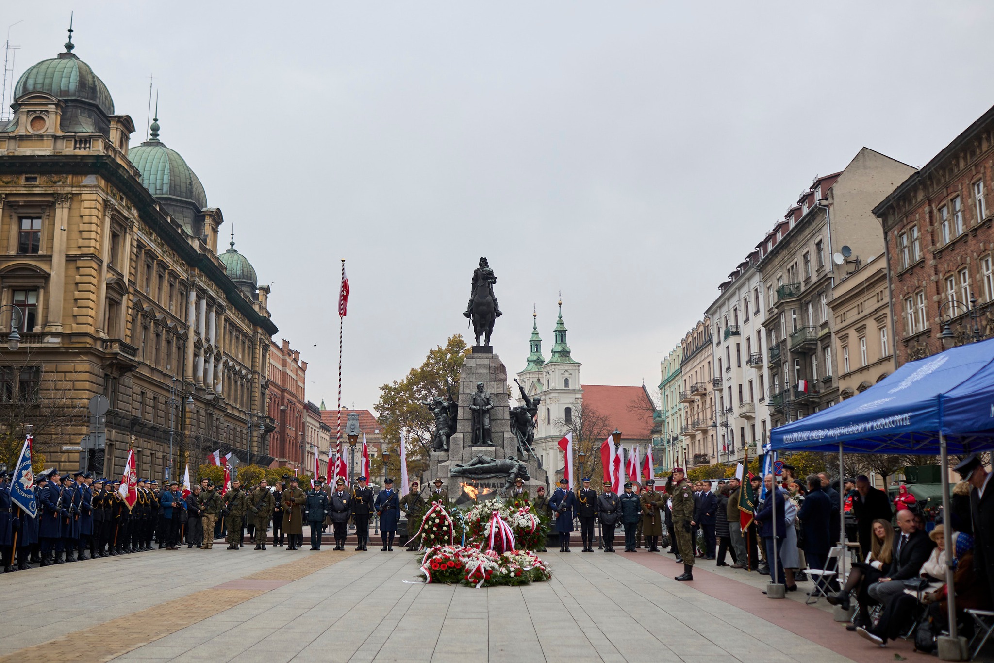 Tradycyjnie, jeszcze przed rozpoczęciem uroczystości złożone zostały kwiaty pod pomnikiem marszałka Józefa Piłsudskiego w Krakowie oraz przy pomniku Żołnierzy Polski Walczącej na Powiślu. Symboliczne wiązanki spoczęły także w krypcie pod Wieżą Srebrnych Dzwonów przy sarkofagach marszałka Piłsudskiego oraz u pary prezydenckiej Lecha i Marii Kaczyńskich.