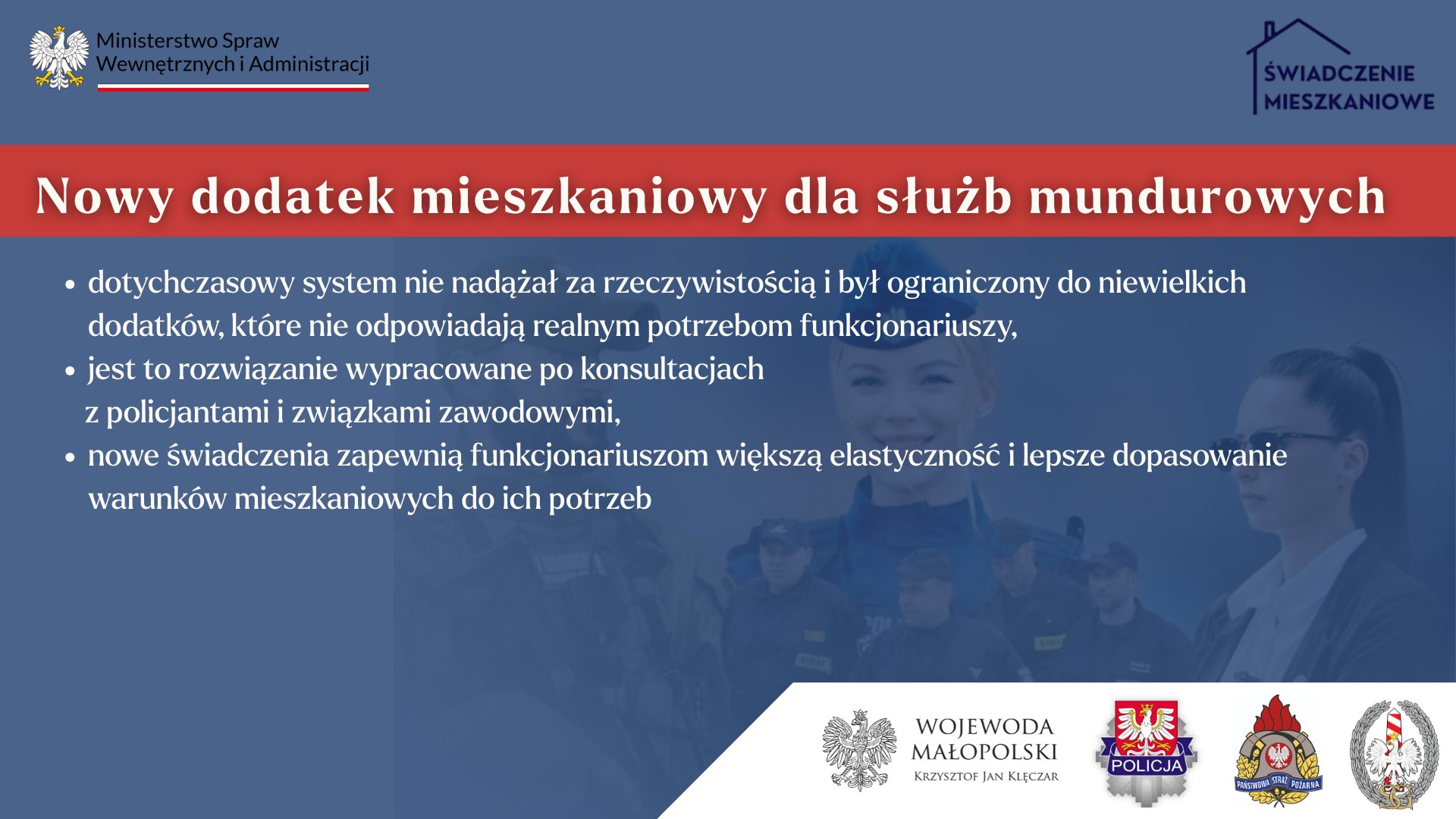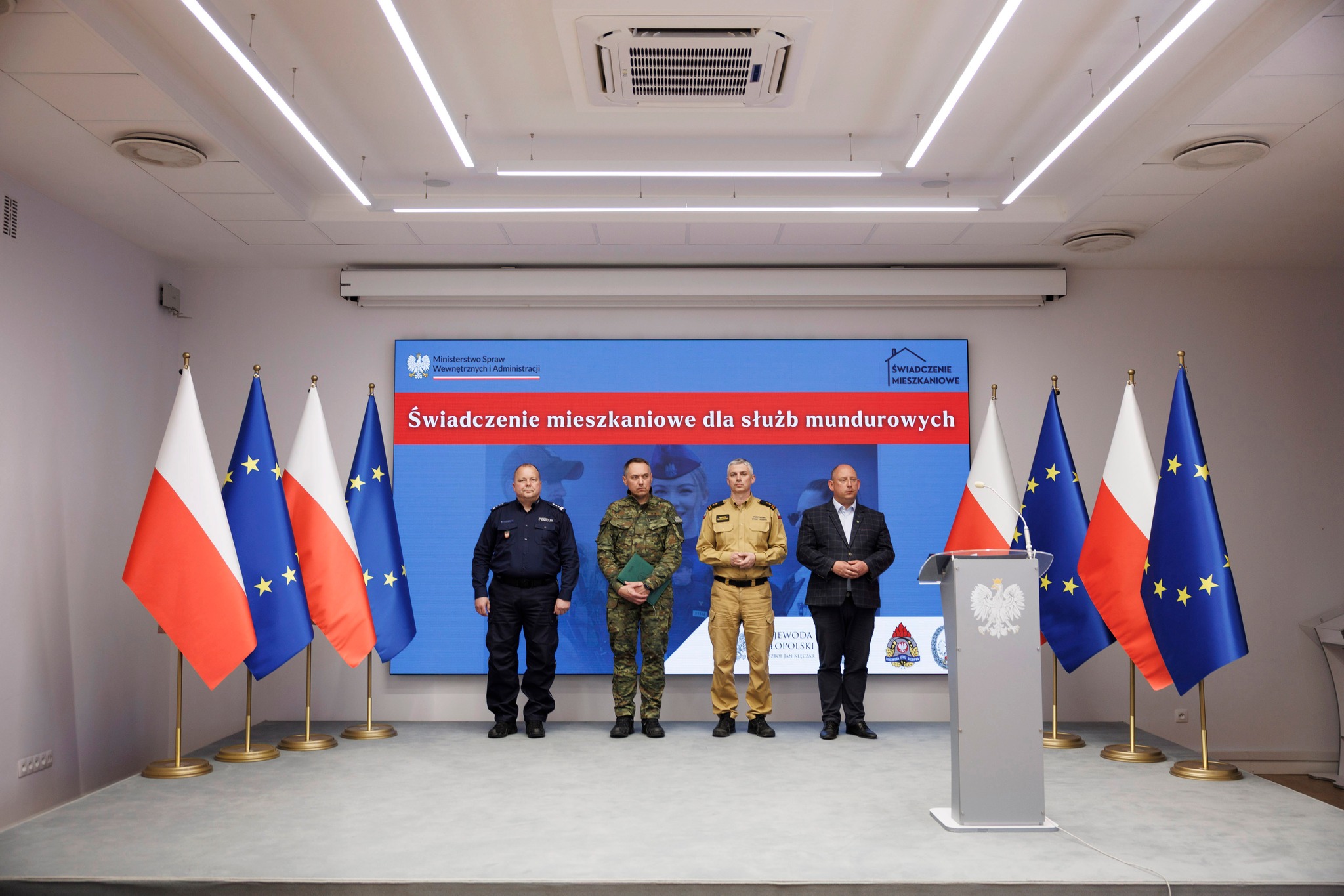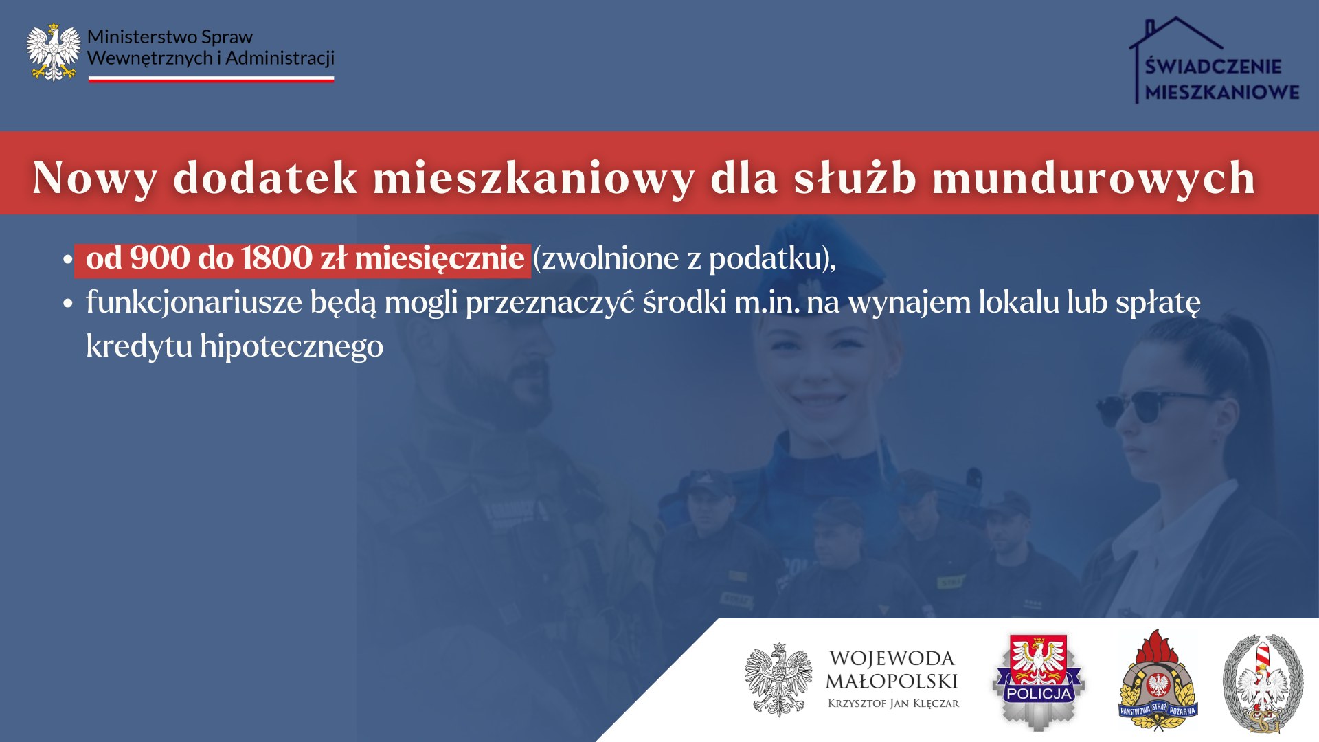 Świadczenia mieszkaniowego dotyczył briefing prasowy, który odbył się w Małopolskim Urzędzie Wojewódzkim w Krakowie. Wzięli w nim udział: wojewoda małopolski Krzysztof Jan Klęczar, I zastępca małopolskiego komendanta wojewódzkiego Państwowej Straży Pożarnej bryg. Marcin Głogowski, zastępca komendanta wojewódzkiego Policji w Krakowie insp. Mariusz Kudela oraz komendant Placówki Straży Granicznej w Krakowie ppłk SG Sylwester Adamczyk.