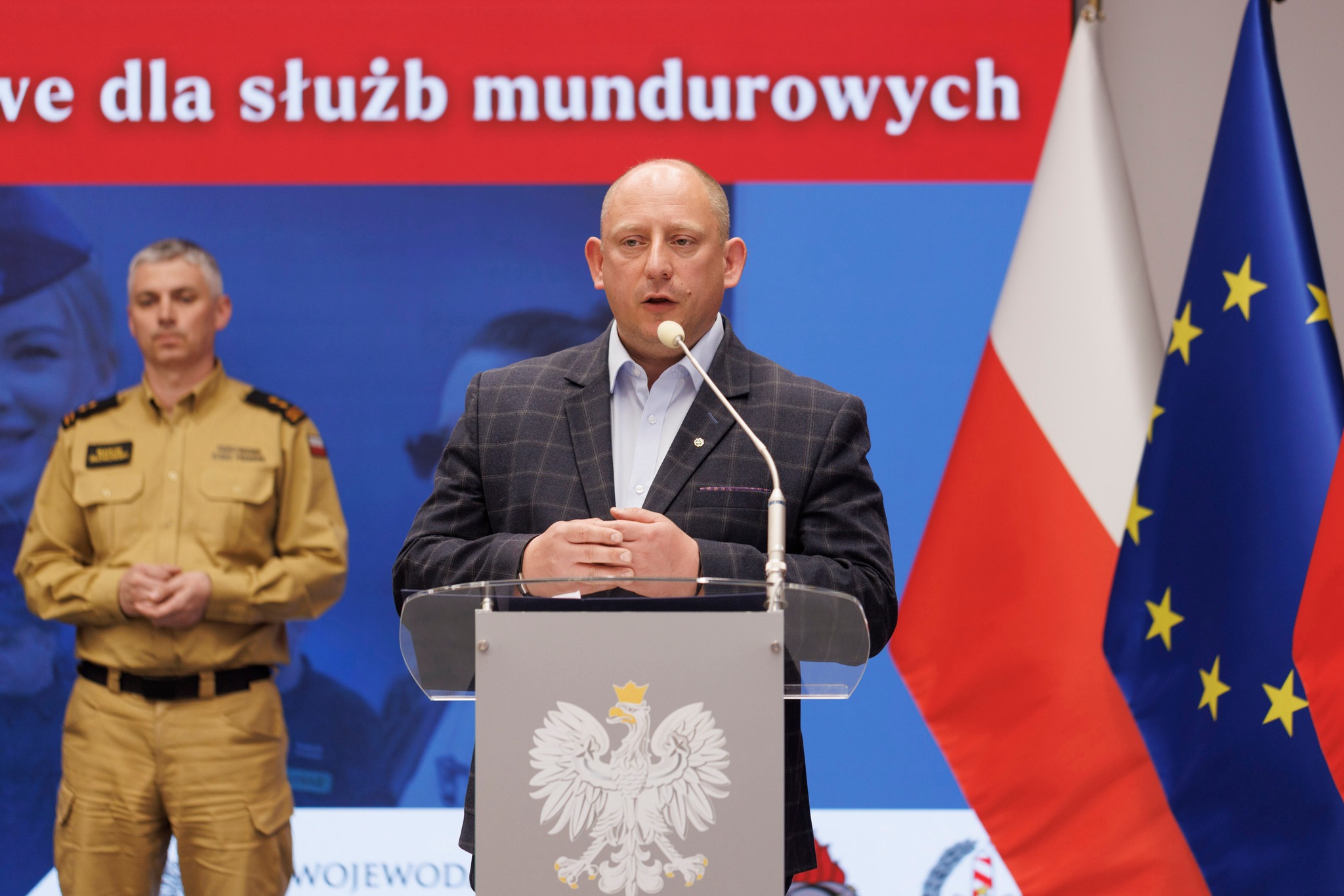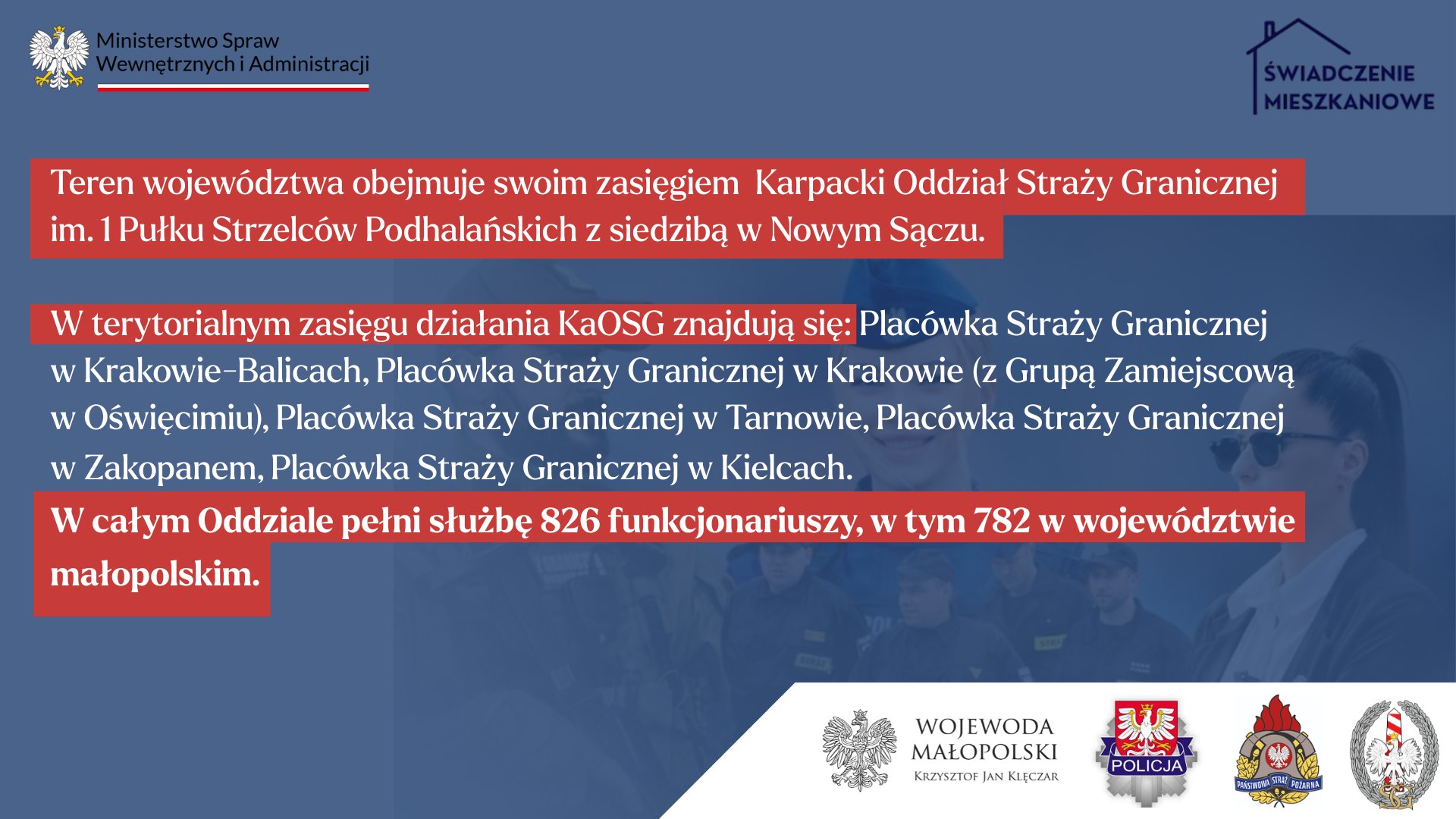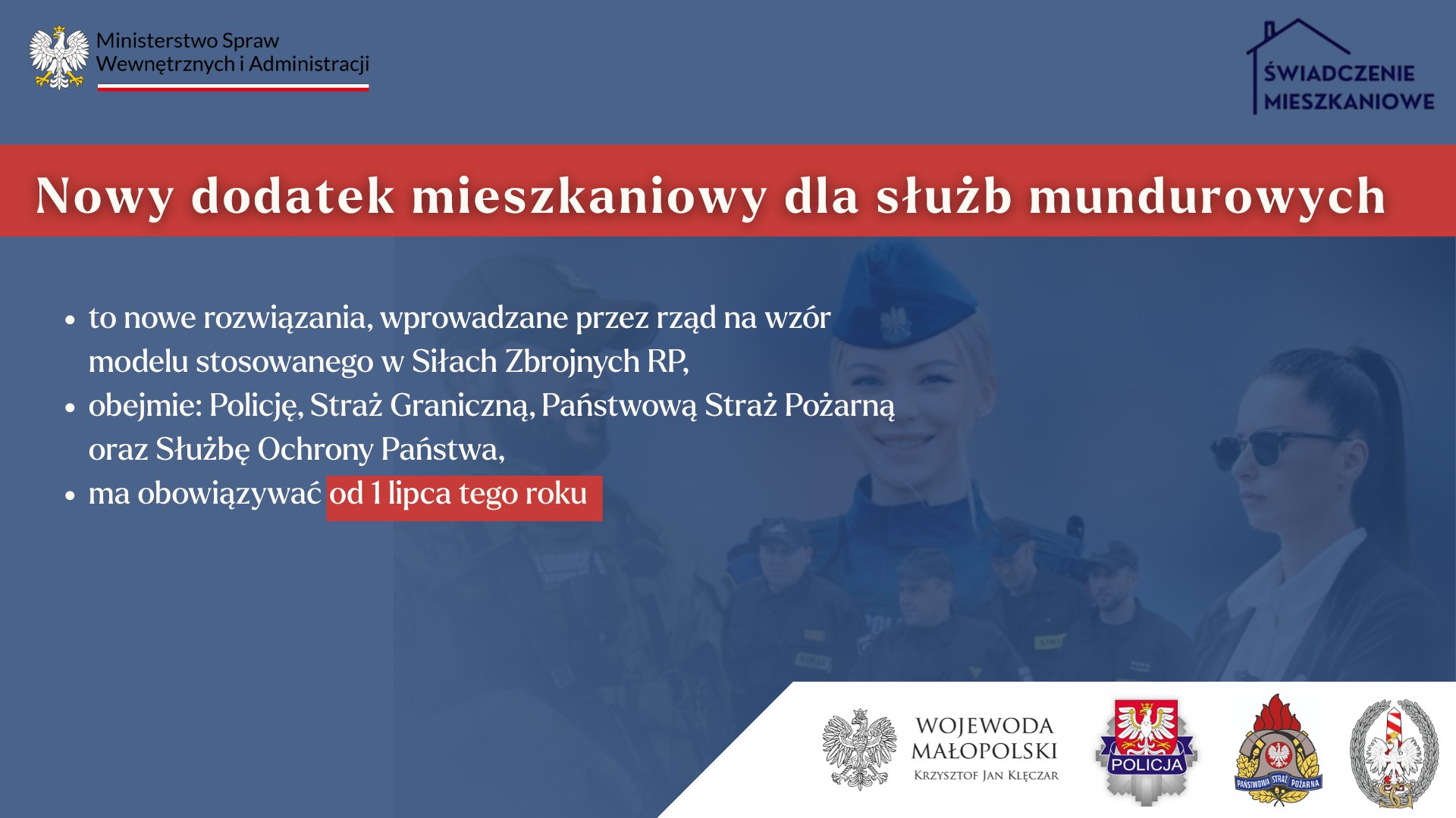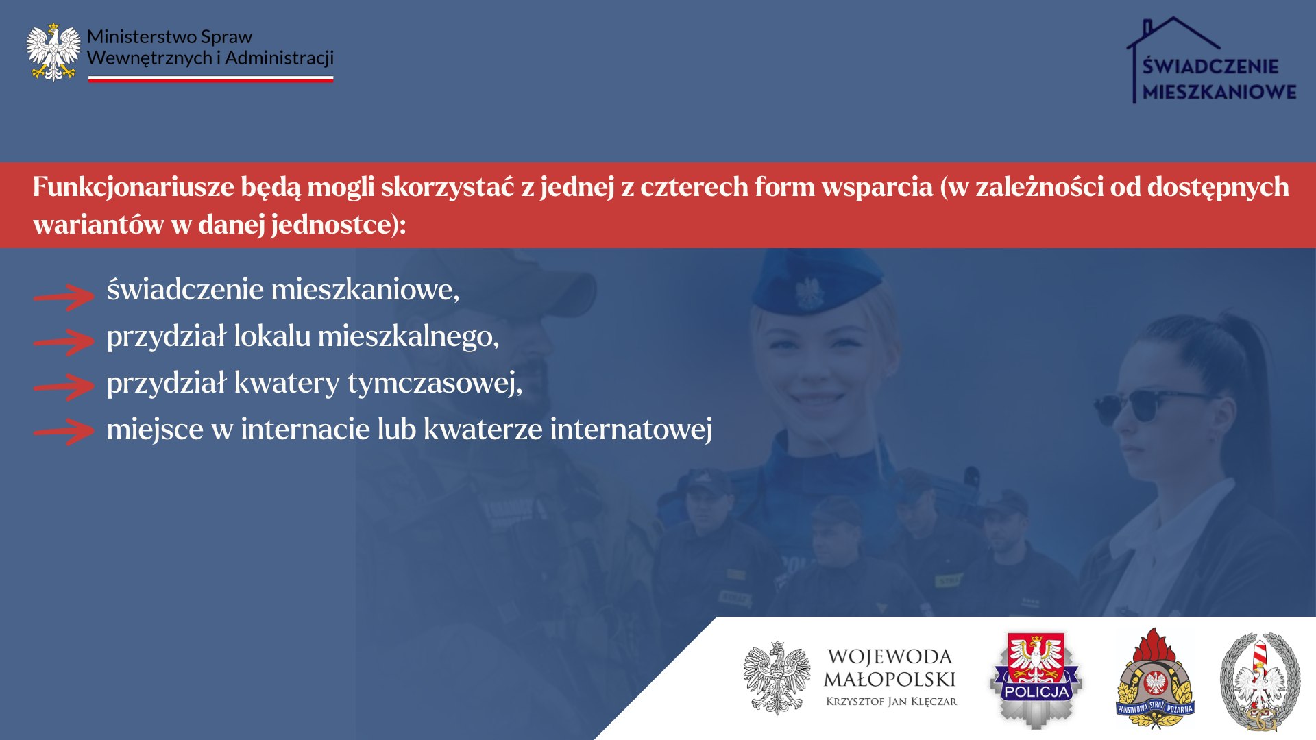 Świadczenia mieszkaniowego dotyczył briefing prasowy, który odbył się w Małopolskim Urzędzie Wojewódzkim w Krakowie. Wzięli w nim udział: wojewoda małopolski Krzysztof Jan Klęczar, I zastępca małopolskiego komendanta wojewódzkiego Państwowej Straży Pożarnej bryg. Marcin Głogowski, zastępca komendanta wojewódzkiego Policji w Krakowie insp. Mariusz Kudela oraz komendant Placówki Straży Granicznej w Krakowie ppłk SG Sylwester Adamczyk.