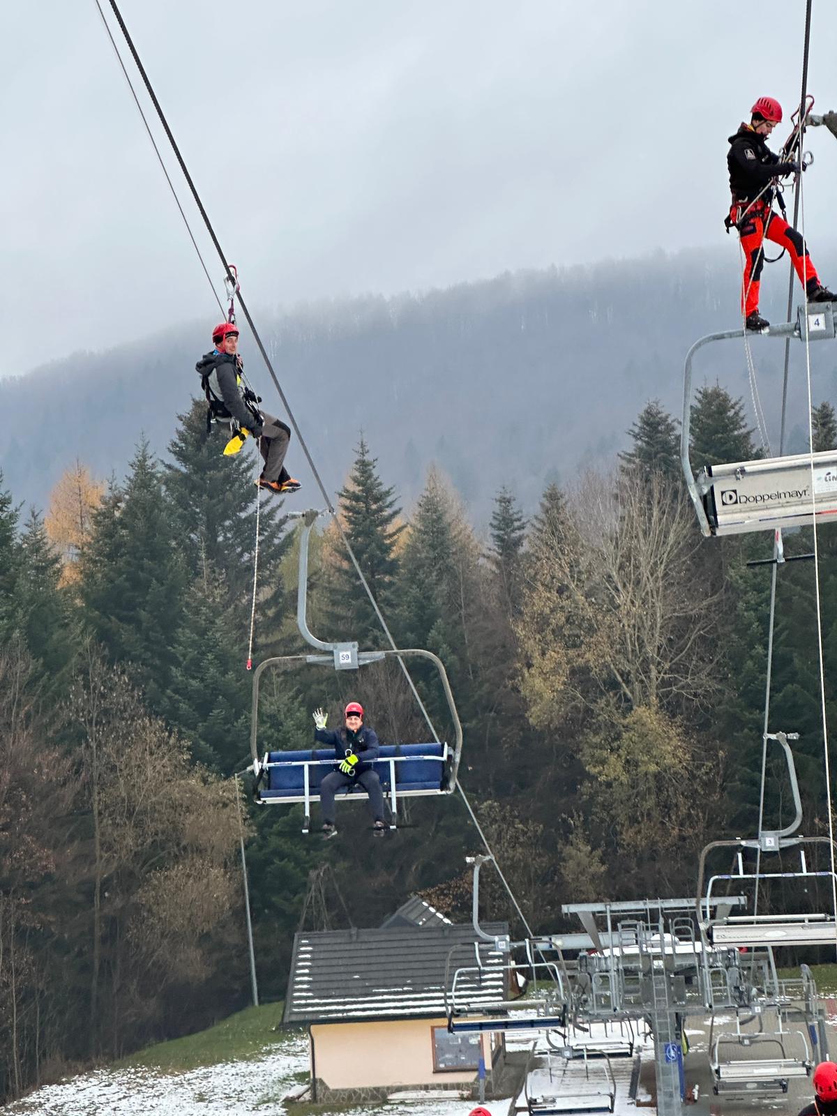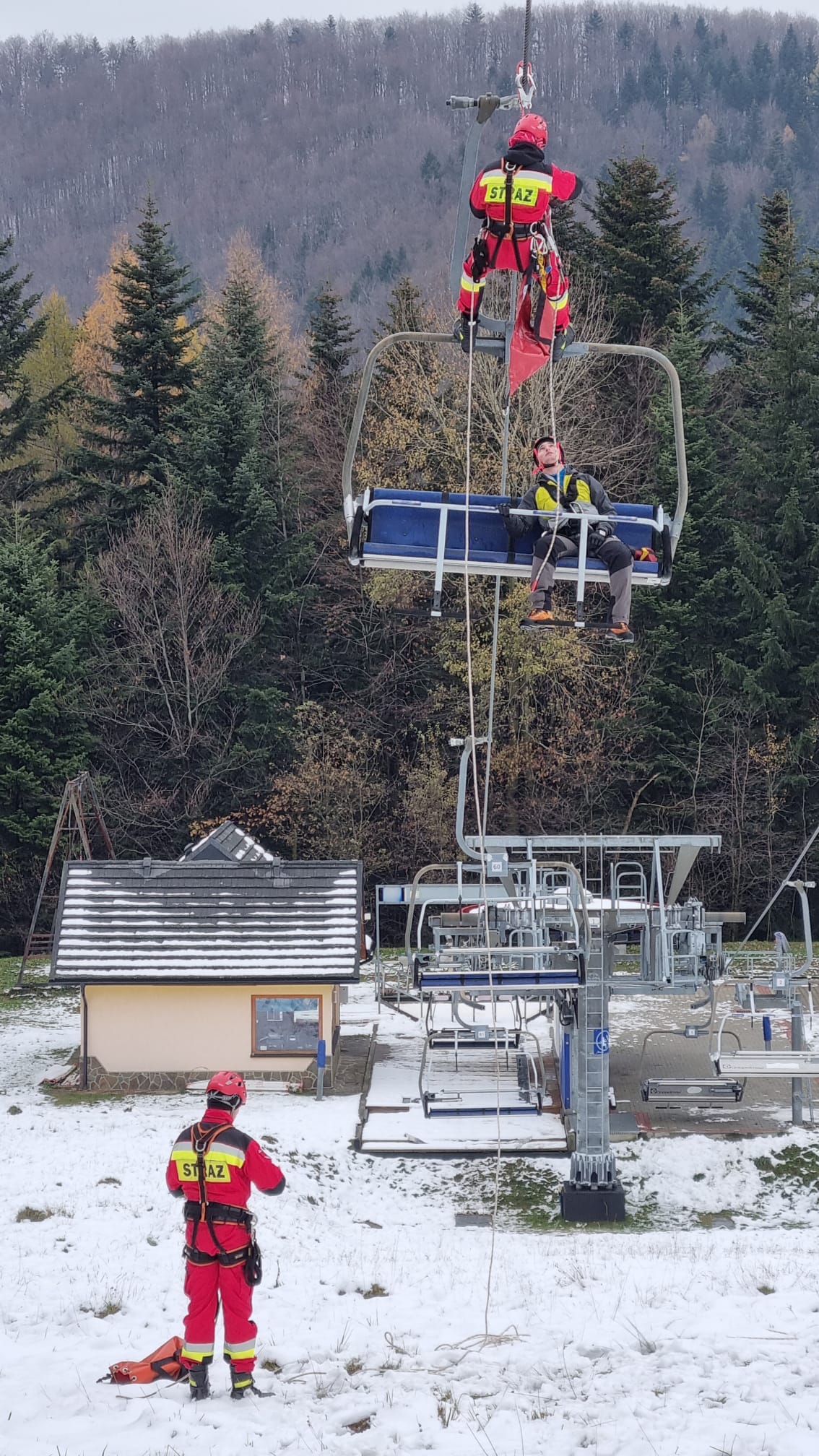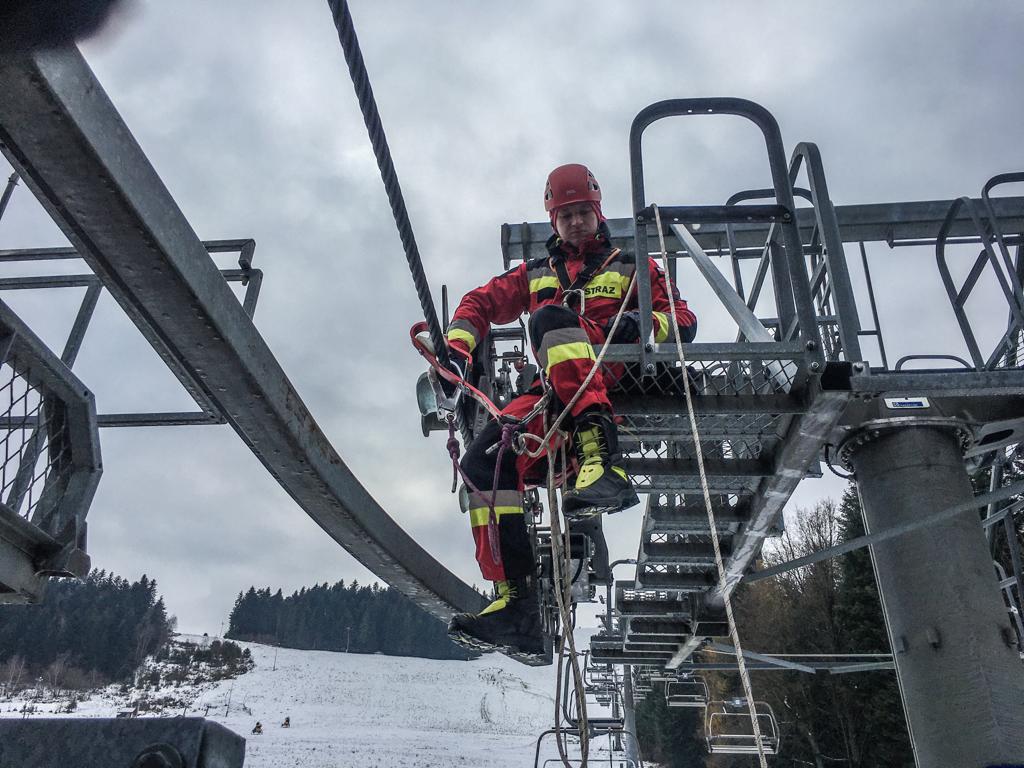 Celem szkolenia było przygotowanie strażaków-ratowników OSP do wykonywania zadań ratownictwa wysokościowego w zakresie podstawowym podczas awaryjnego zatrzymania kolei linowej krzesełkowej.