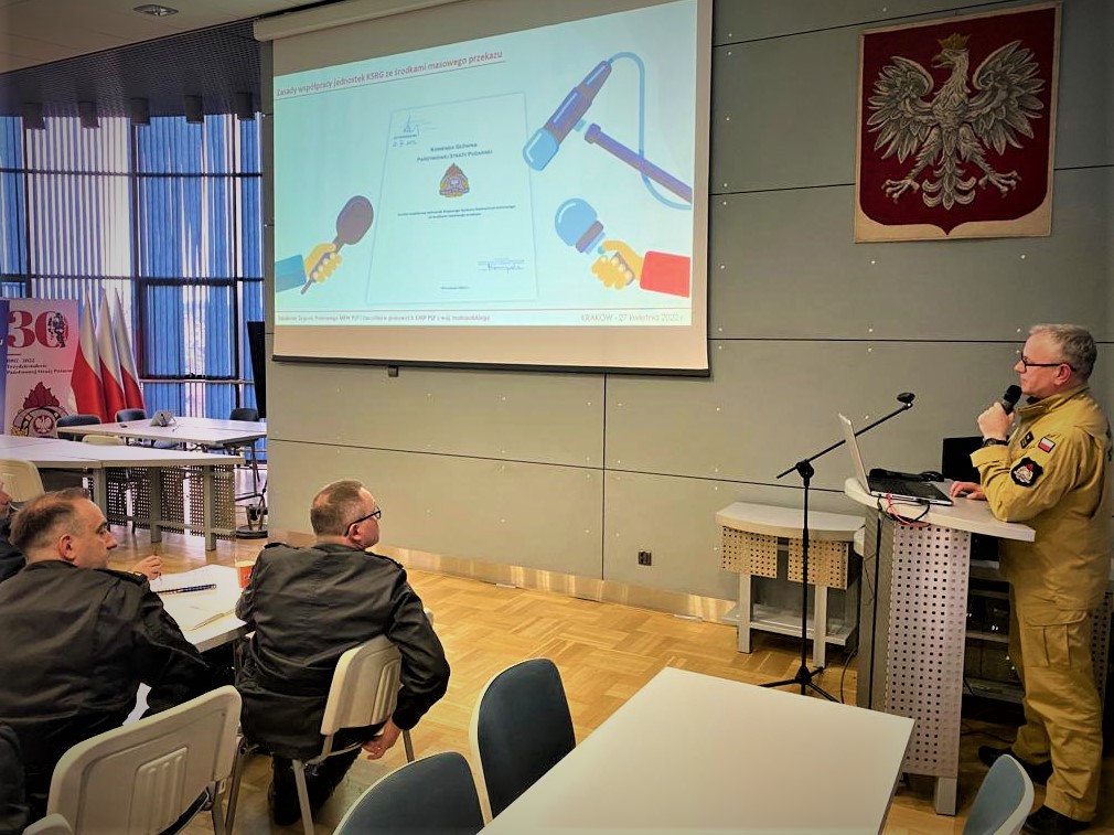 W dniach 27-28 kwietnia 2022r. odbyło się w Komendzie Wojewódzkiej PSP w Krakowie szkolenie skierowane do członków Zespołu Prasowego Małopolskiego Komendanta Wojewódzkiego Państwowej Straży Pożarnej oraz rzeczników prasowych komendantów powiatowych (miejskich) Państwowej Straży Pożarnej woj. małopolskiego.