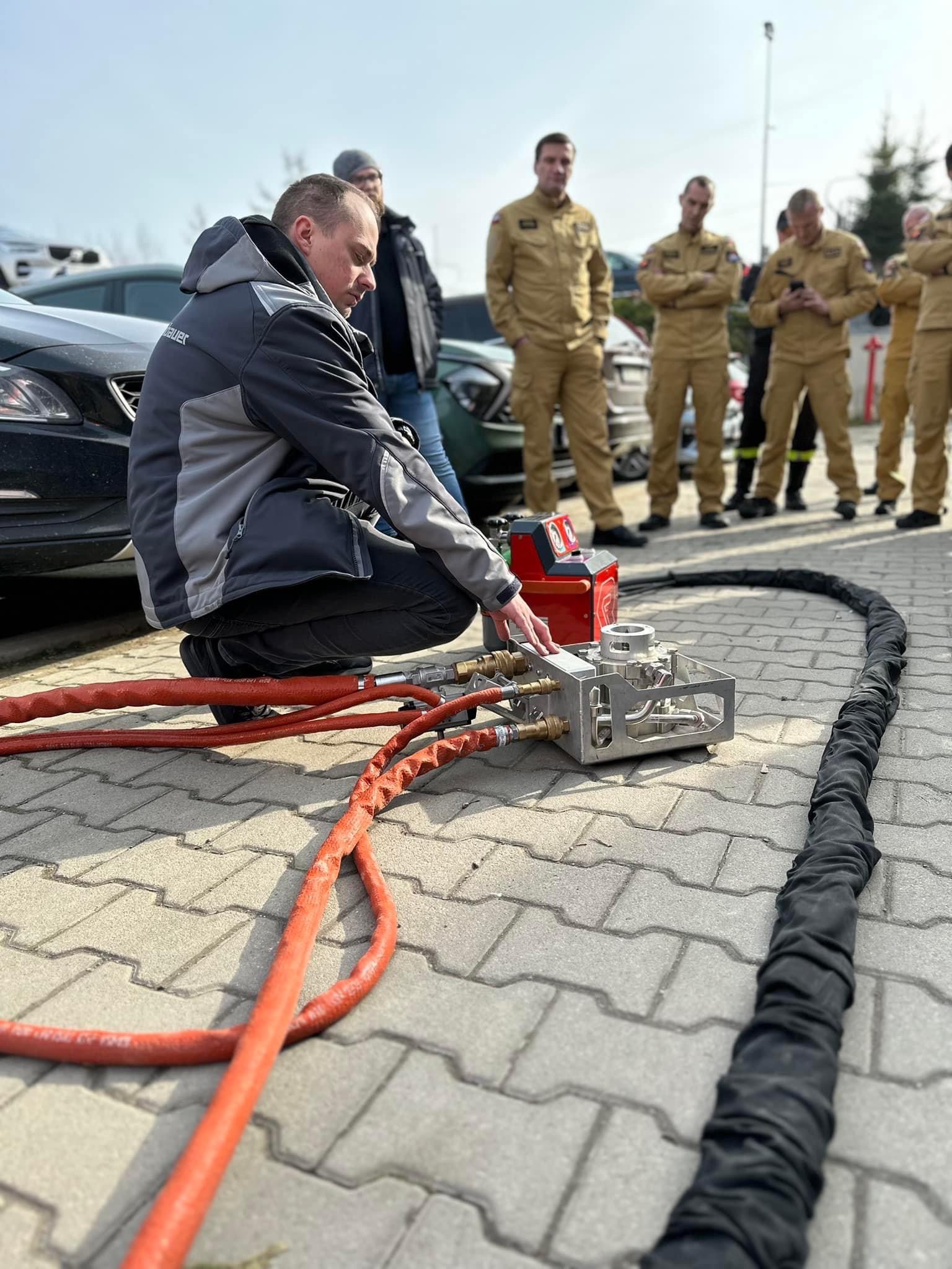 W dalszej części szkolenia przedstawiciele firmy Rosenbauer zaprezentowali system gaszenia baterii litowo-jonowych w autach elektrycznych. Na cały system składają się dwa główne elementy, tj. jednostka gaśnicza oraz jednostka sterująca. Dzięki temu strażak przebywa w pobliżu palącego się pojazdu jedynie przez chwilę, a cały system uruchamiany jest z bezpiecznej odległości wynoszącej ok. 8 m. Główną ideą tego systemu jest dostarczenie wody tam, gdzie to konieczne, czyli do wnętrza akumulatora. Specjalna dysza przebijająca wbijana jest do wnętrza akumulatora z siłą kilku ton, natomiast woda doprowadzana jest do akumulatora za pomocą perforowanej dyszy. Dzięki temu woda wypełnia całe wnętrze akumulatora i zapewnia w ten sposób chłodzenie.