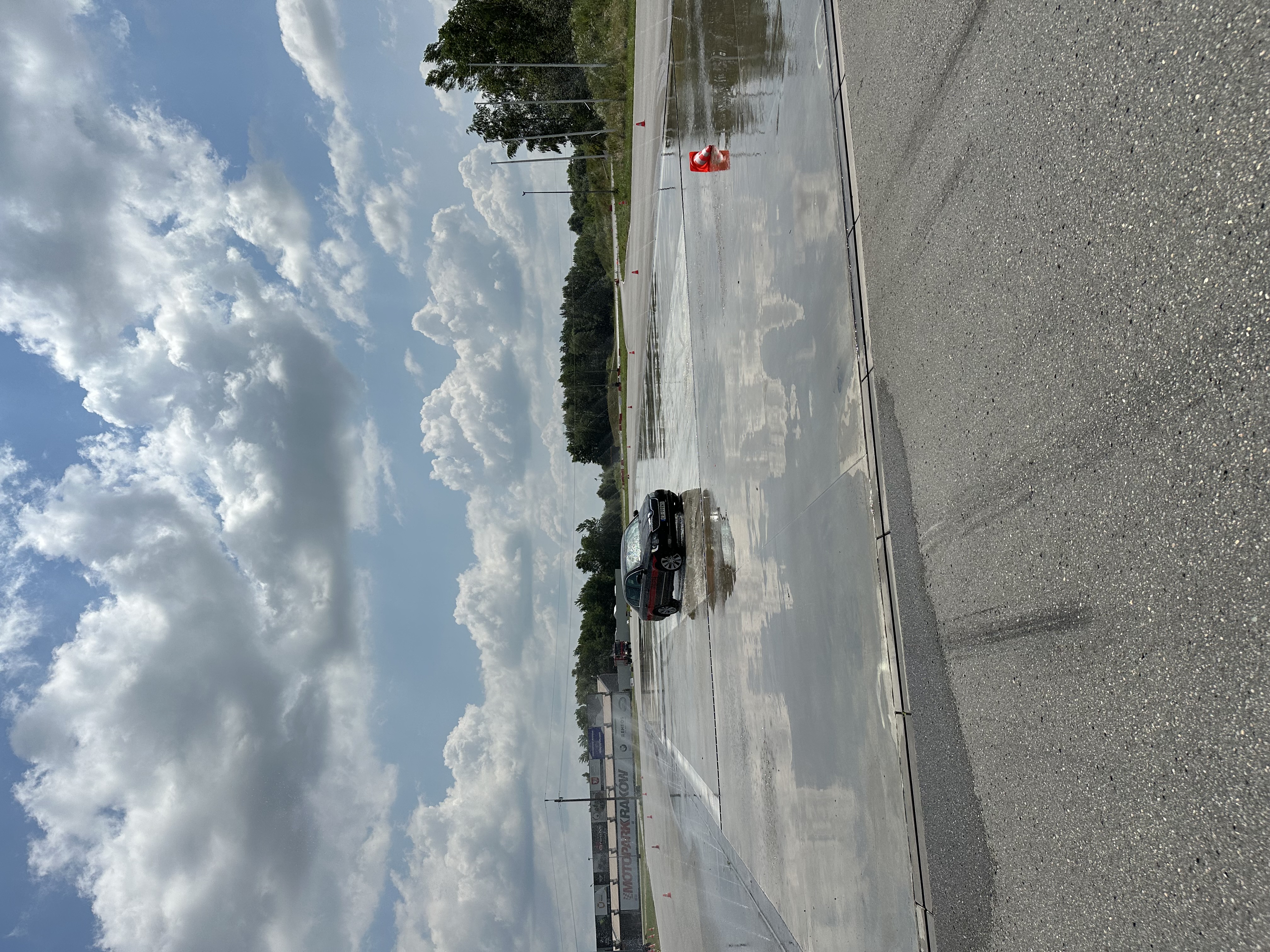 - Przejazd slalomem powielony o przejazd po płycie poślizgowej w kształcie okręgu. Nauka właściwej reakcji na nadsterowność wywołaną nieodpowiednim momentem dodania oraz odjęcia gazu.