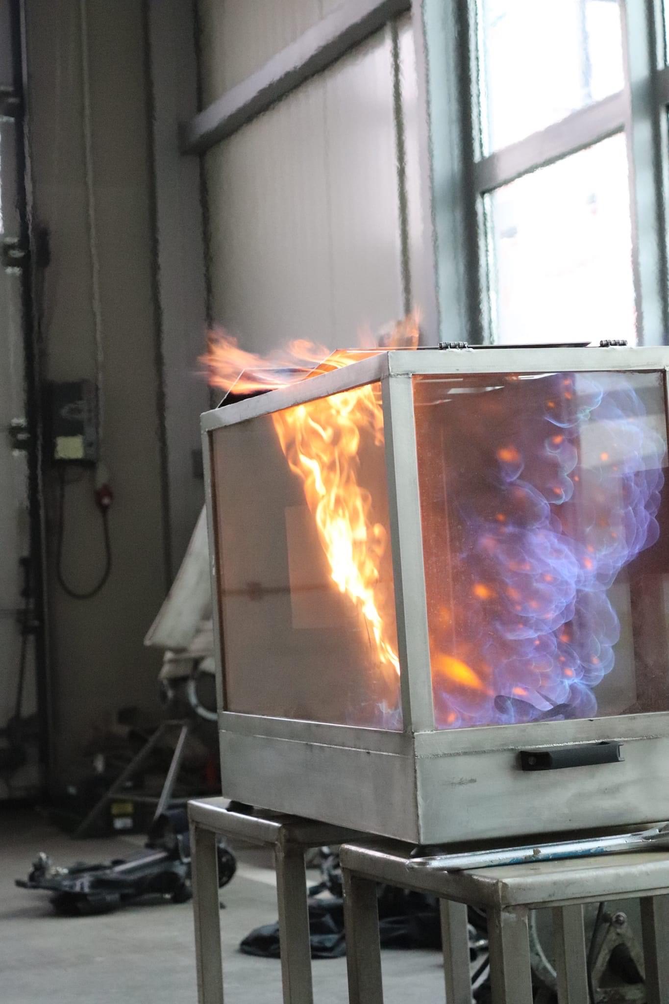 - Pożar wewnętrzny i jego rozwój. Piroliza drewna, modele domków do pokazu rozwoju pożaru. Pokaz granic wybuchowości/palności z wykorzystaniem tzw. „akwarium Giselssona”. Ćwiczenie w komorze ogniowej – pokaz zjawisk pożarowych.