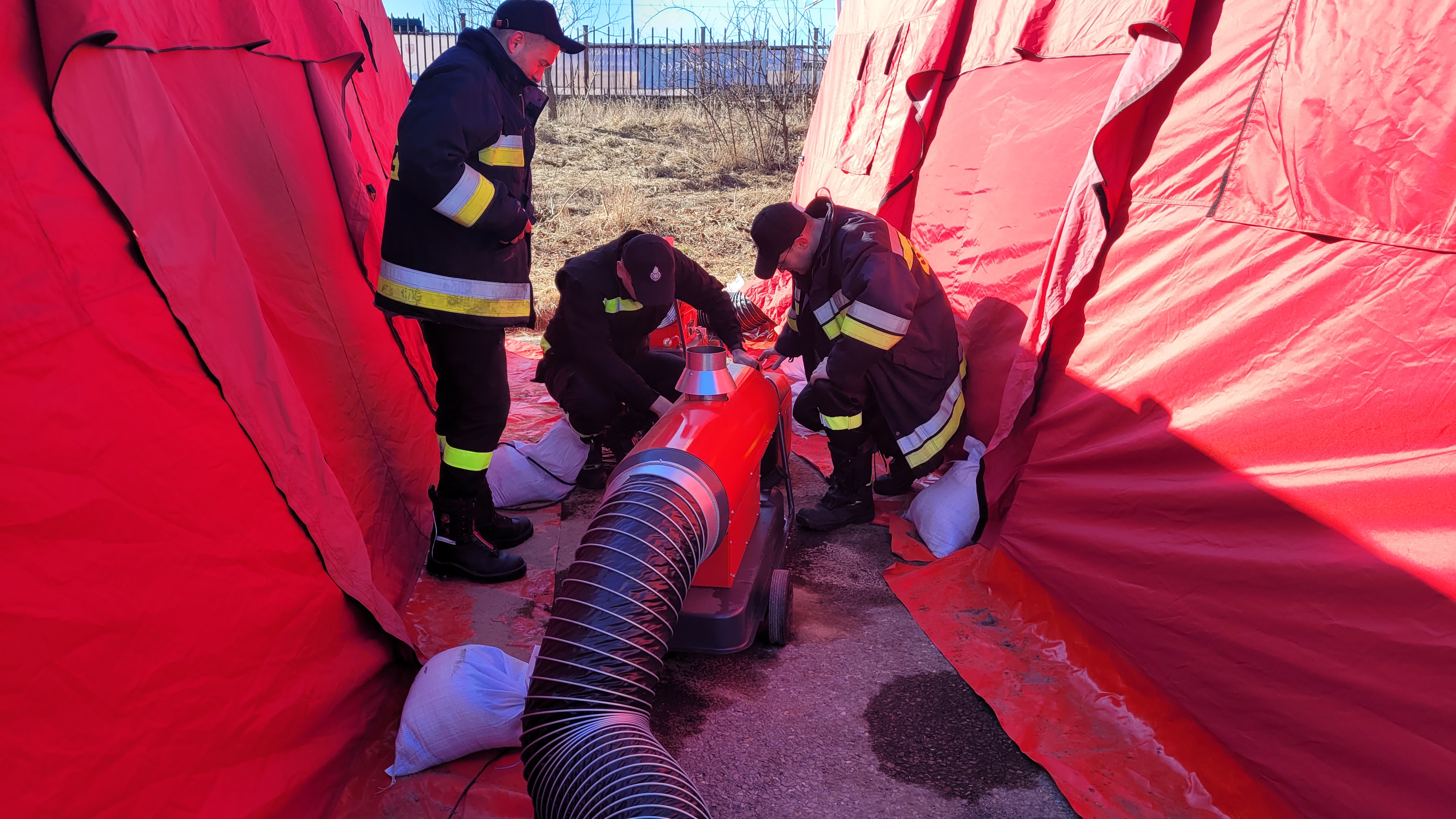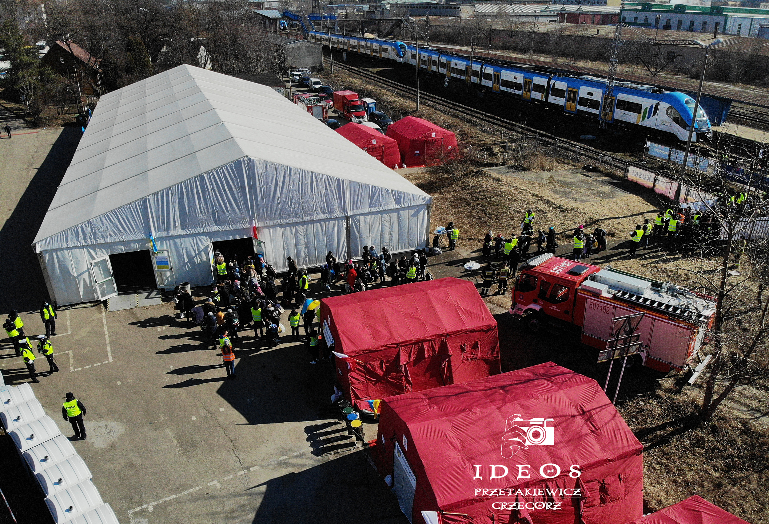Do Olkusza przyjeżdżają kolejne pociągi z uchodźcami z Ukrainy. Strażacy zajmują się obsługą techniczną namiotów i hali namiotowej (uzupełnianie paliwa do zasilania agregatów prądotwórczych i nagrzewnic oraz kontrola właściwej pracy tych urządzeń). Uchodźcy na miejscu częstowani są ciepłym posiłkiem, gorącymi napojami oraz suchym prowiantem. Będący na miejscu pracownicy Urzędu Wojewódzkiego z Krakowa i pracownicy Starostwa Powiatowego z Olkusza wraz ze strażakami kierują przybyłe osoby do autokarów oraz pociągów, którymi przewożone są do miejsc zakwaterowania na terenie małopolski. Cześć z przybyłych udaje się również na dworce PKP w Krakowie i Katowicach celem kontynuowania podróży do innych miejscowości w Polsce. W jednym z namiotów zorganizowany jest również tymczasowy punkt medyczny.