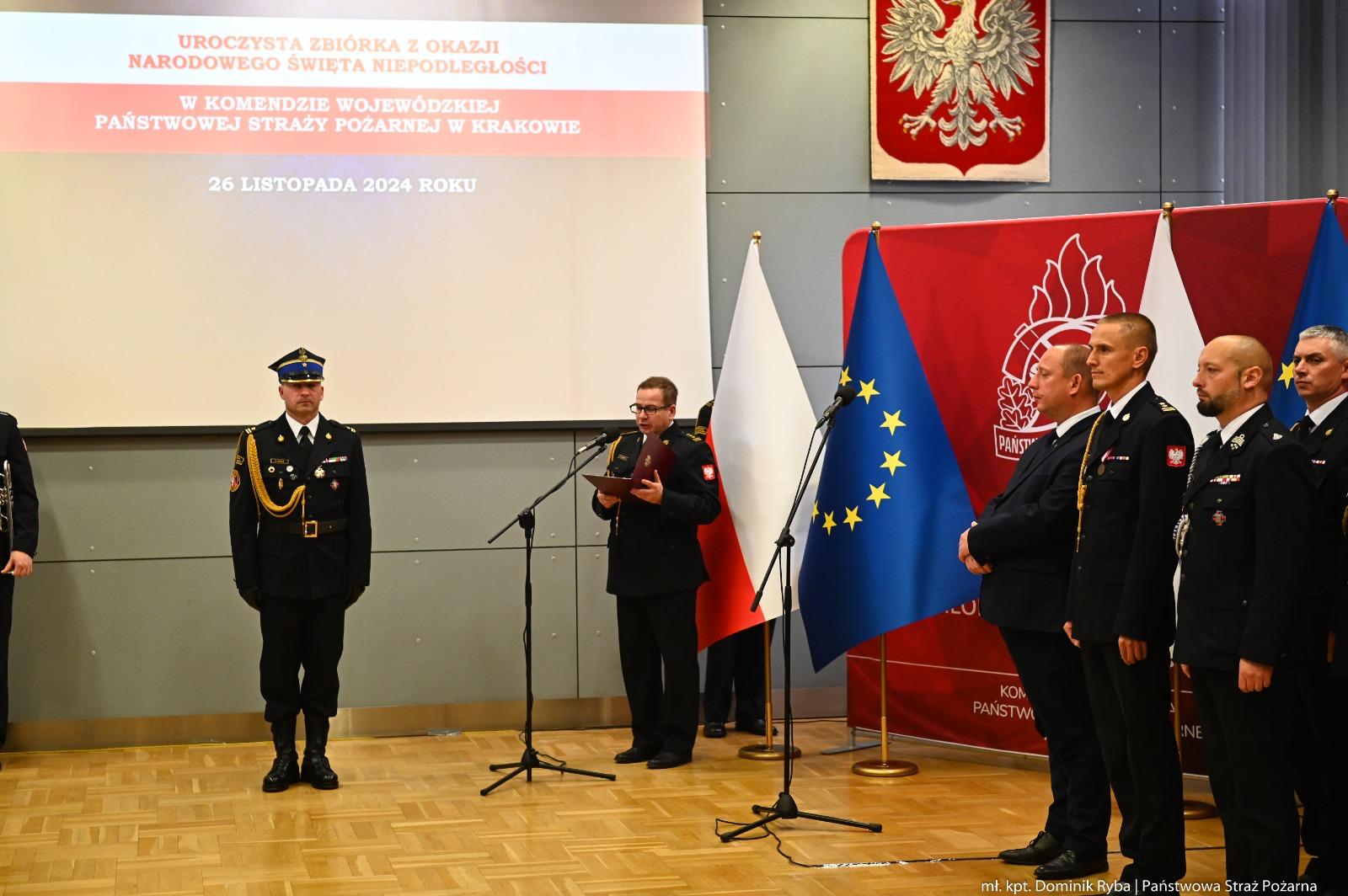 W Komendzie Wojewódzkiej Państwowej Straży Pożarnej w Krakowie odbyła się wyjątkowa uroczystość z okazji Narodowego Święta Niepodległości. Była to okazja nie tylko do uczczenia wolności i suwerenności naszej Ojczyzny, ale także do uhonorowania tych, którzy swoją służbą i zaangażowaniem przyczyniają się do bezpieczeństwa mieszkańców i rozwoju ochrony przeciwpożarowej. W uroczystości uczestniczył m.in. Wojewoda Małopolski Krzysztof Jan Klęczar, Małopolski Komendant Wojewódzki PSP bryg. Przemysław Przęczek wraz z Zastępcą bryg. Marcinem Głogowskim i całą kadrą kierowniczą woj. małopolskiego, Dyrektor Oddziału Wojewódzkiego ZOSP RP Łukasz Łach oraz wielu znamienitych gości.