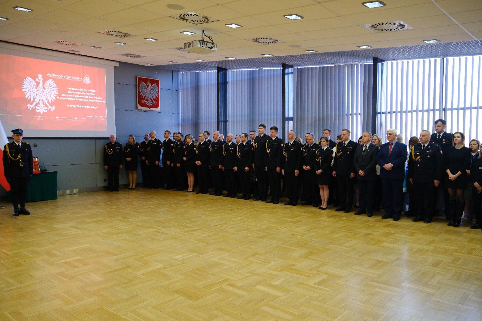 Uroczystość zgromadzila m.in. Wojewodę Małopolskiego, kadrę kierowniczą Państwowej Straży Pożarnej woj. małopolskiego, funkcjonariuszki i funkcjonariuszy, pracowników cywilnych Komendy Wojewódzkiej PSP w Krakowie, a także licznych zaproszonych gości.