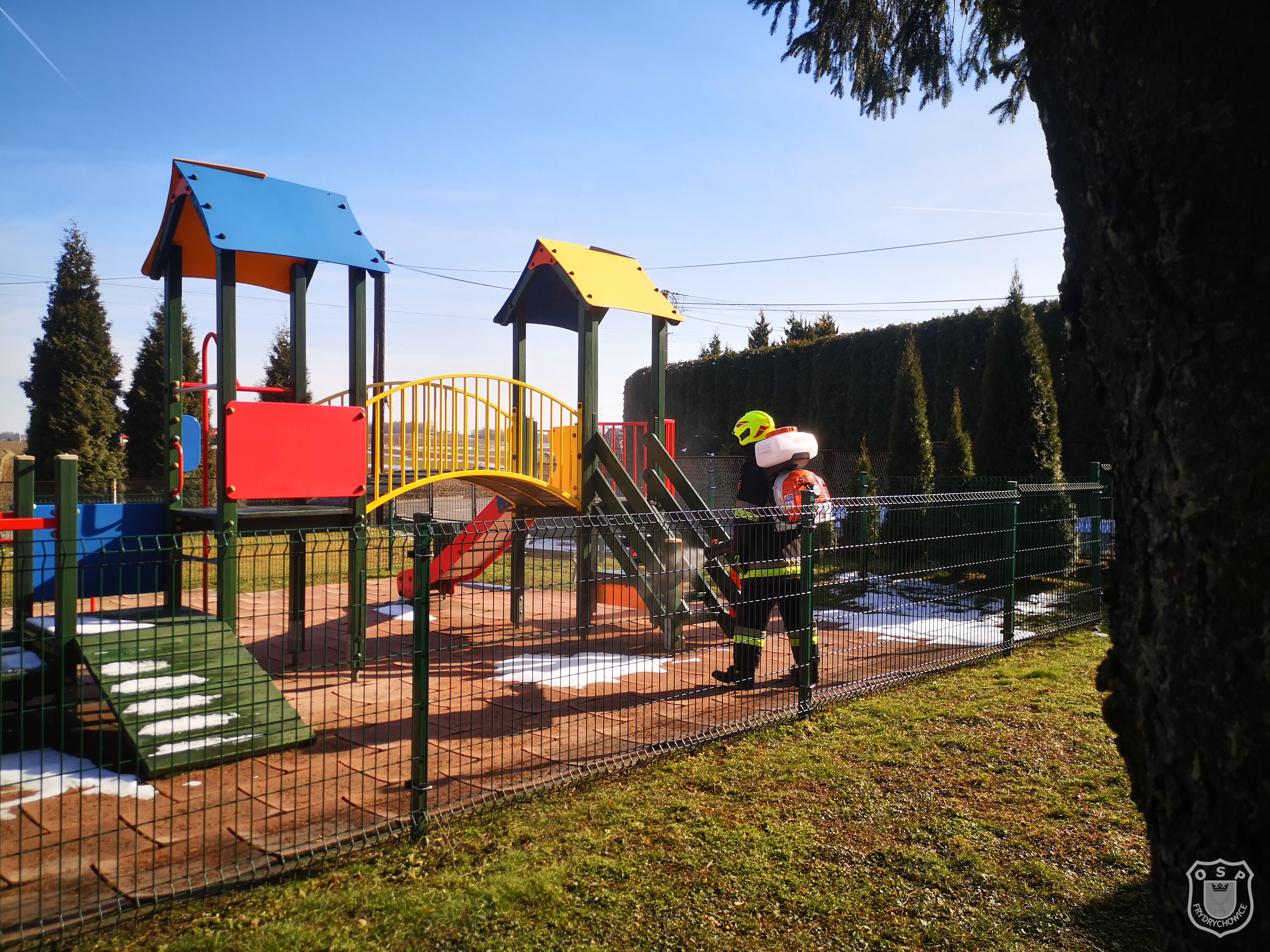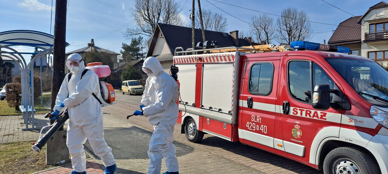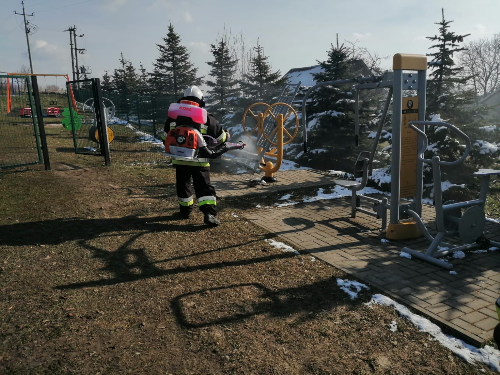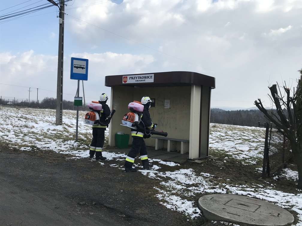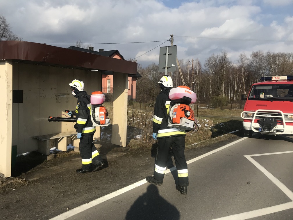 Druhowie ochotniczych straży pożarnych realizując działania pomocowe związane z zapobieganiem, przeciwdziałaniem i zwalczaniem skutków rozprzestrzeniania się koronawirusa SARS-CoV-2, w ramach współpracy jednostek ochrony przeciwpożarowej z samorządami lokalnymi, dezynfekują miejsca przestrzeni publicznej takie jak np. przystanki, place zabaw, siłownie plenerowe oraz wejścia do budynków użyteczności publicznej.