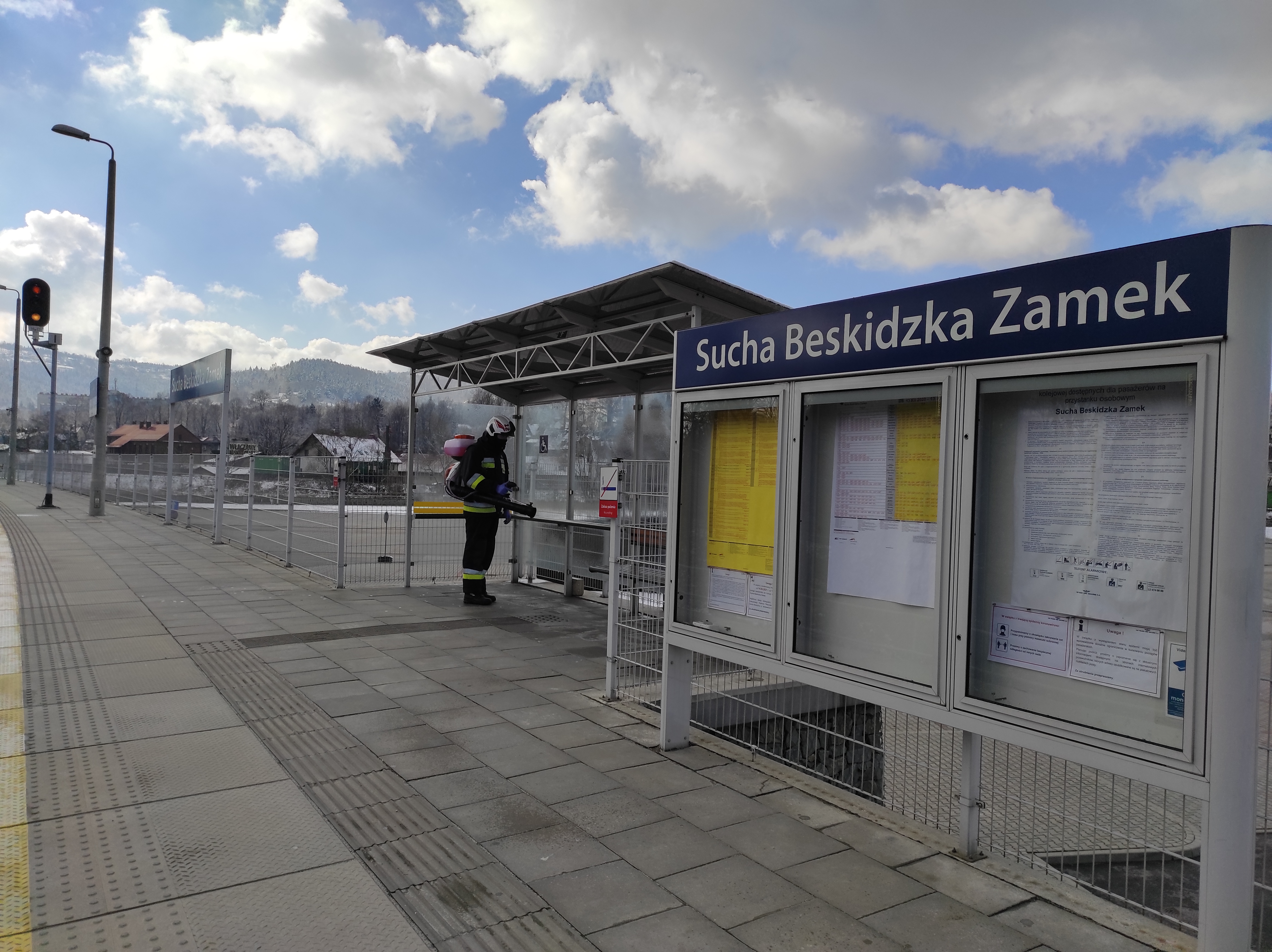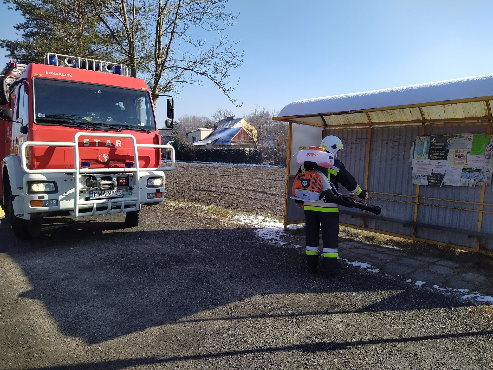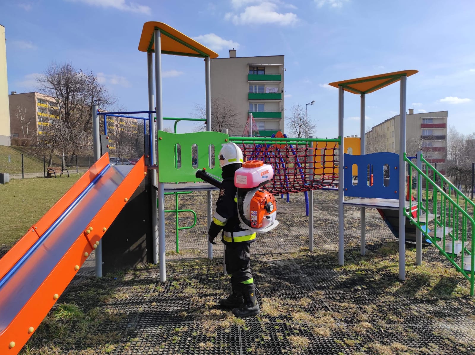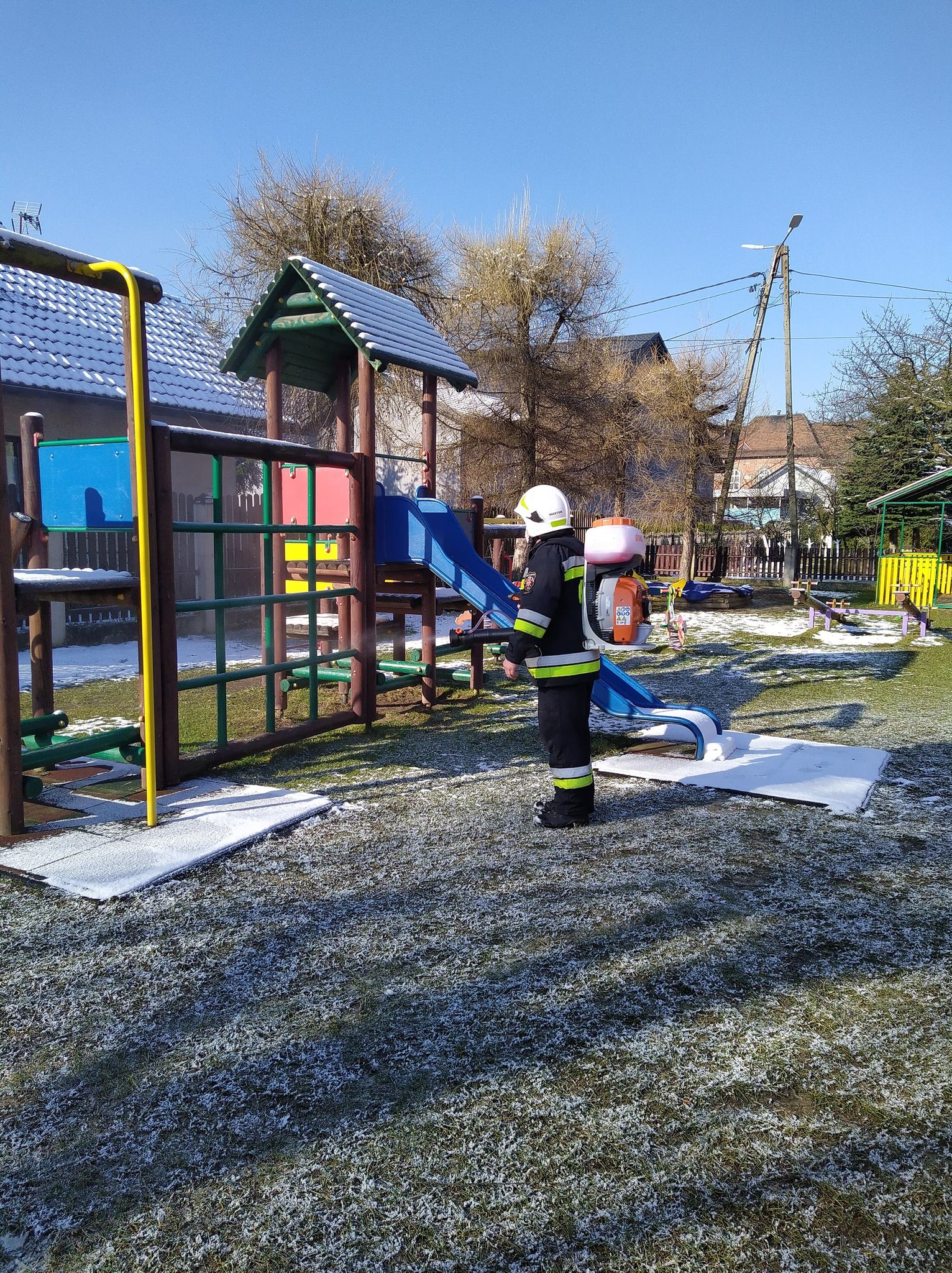 Druhowie ochotniczych straży pożarnych realizując działania pomocowe związane z zapobieganiem, przeciwdziałaniem i zwalczaniem skutków rozprzestrzeniania się koronawirusa SARS-CoV-2, w ramach współpracy jednostek ochrony przeciwpożarowej z samorządami lokalnymi, dezynfekują miejsca przestrzeni publicznej takie jak np. przystanki, place zabaw, siłownie plenerowe oraz wejścia do budynków użyteczności publicznej.