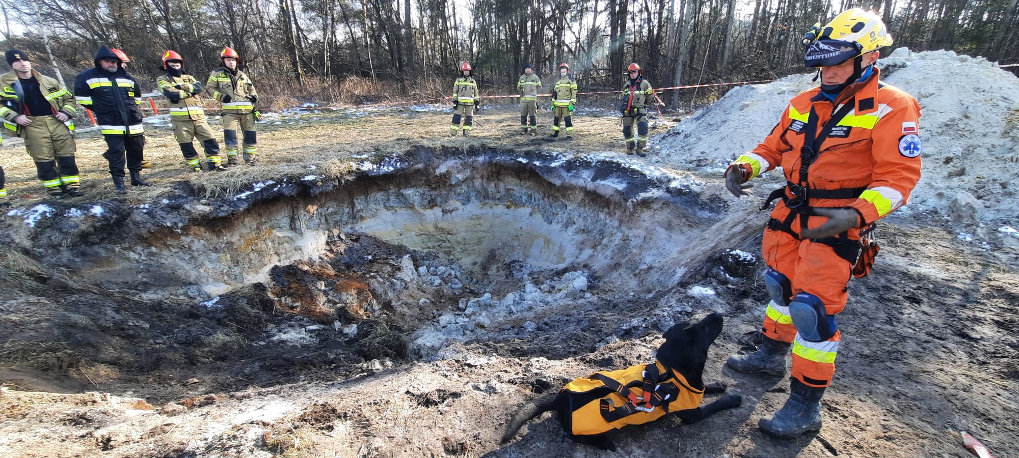 w Komendzie Powiatowej PSP w Chrzanowie poświęcona była omówieniu przyczyn powstawania zapadlisk, bezpieczeństwa pracy strażaków na miejscu akcji, przydatnych technik ratowniczych i potrzebnym sprzęcie specjalistycznym, a także kynologii ratowniczej. Drugą część warsztatów przeprowadzono w formie zajęć praktycznych na terenie zakładu przeróbki kruszywa w Bolęcinie przy specjalnie przygotowanym otworze ziemnym odzwierciedlającym zapadliska, jakie powstają na terenie gminy Trzebinia. Strażacy przećwiczyli sposoby wejścia do zapadliska w zabezpieczeniu technikami linowymi, różne warianty wyciągania poszkodowanego, użycie ciężkiego sprzętu typu żuraw przenośny do wsparcia działań ratowniczych oraz przeszukania miejsca zdarzenia przy wykorzystaniu psów ratowniczych. Ta ostania technika okazała się na tyle obiecująca, że postanowiono zrealizować kolejne warsztaty poświęcone głównie wykorzystaniu kynologii ratowniczej do poszukiwań osób w zapadliskach ziemnych. 20 marca br. zaproszono przewodników wraz z pasami o specjalizacji gruzowiskowej po to aby znaleźć odpowiedź na pytanie w jakich warunkach użycie psów będzie zasadnie i skuteczne. Łącznie z zapadliskami ziemnymi miało okazję zapoznać się 6 psów z OSP Wieprz, OSP Goszcza oraz SGPR Nowy Sącz.