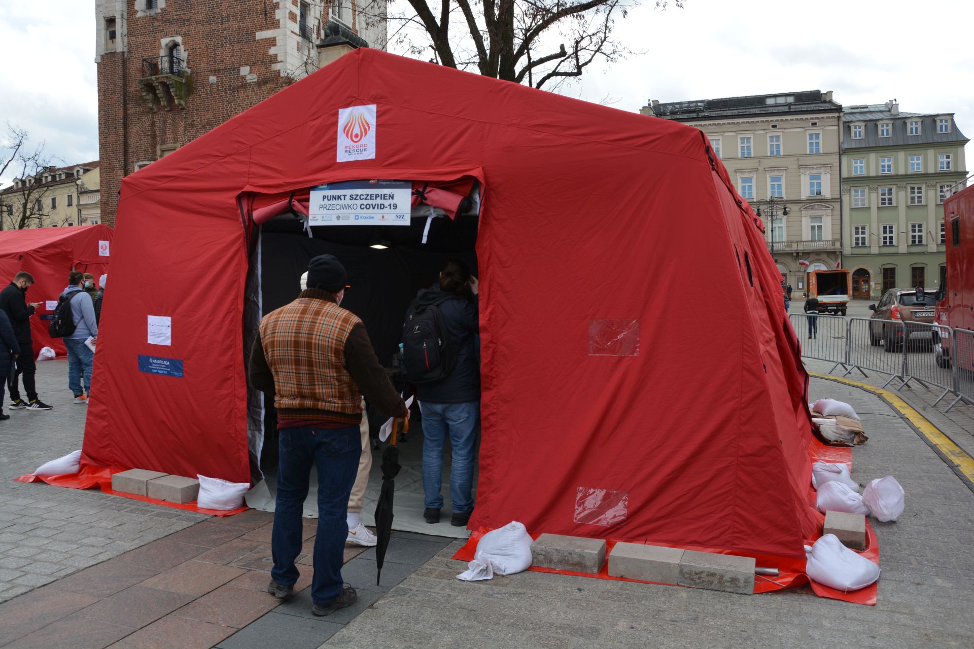 Strażacy w przygotowaniu miasteczka namiotowego umożliwiającego funkcjonowanie punktu szczepień na Rynku Głównym w Krakowie mieli bardzo duży udział. Po rozstawieniu namiotów stelażowych zapewnili ich odpowiednie wyposażenie, oświetlenie i ogrzewanie. Wykorzystane zostały namioty stelażowe pochodzące ze wzmocnienia potencjału sprzętowego, który możliwy był dzięki środkom finansowym pozyskanym m.in. w ramach Małopolskiej Tarczy Antykryzysowej. Środki te zostały przekazane przez Zarząd Województwa Małopolskiego na walkę z COVID-19 oraz łagodzenie skutków pandemii. Pochodzą one z Funduszy Europejskich oraz budżetów państwa i województwa.