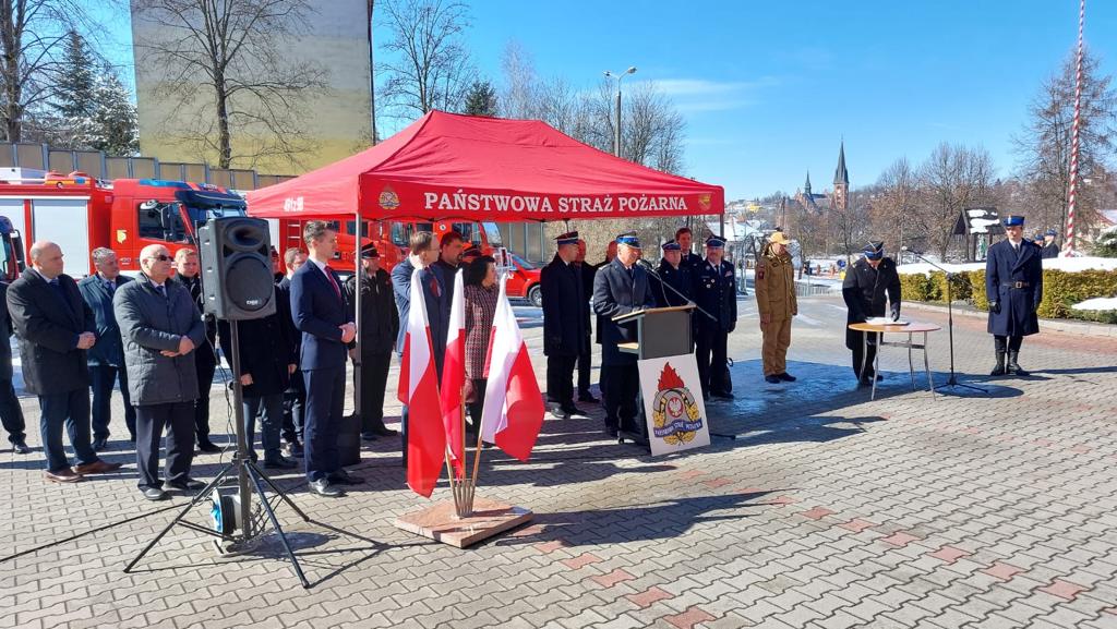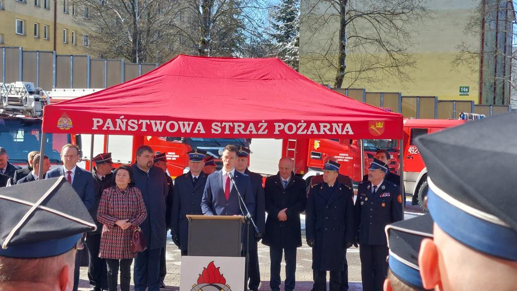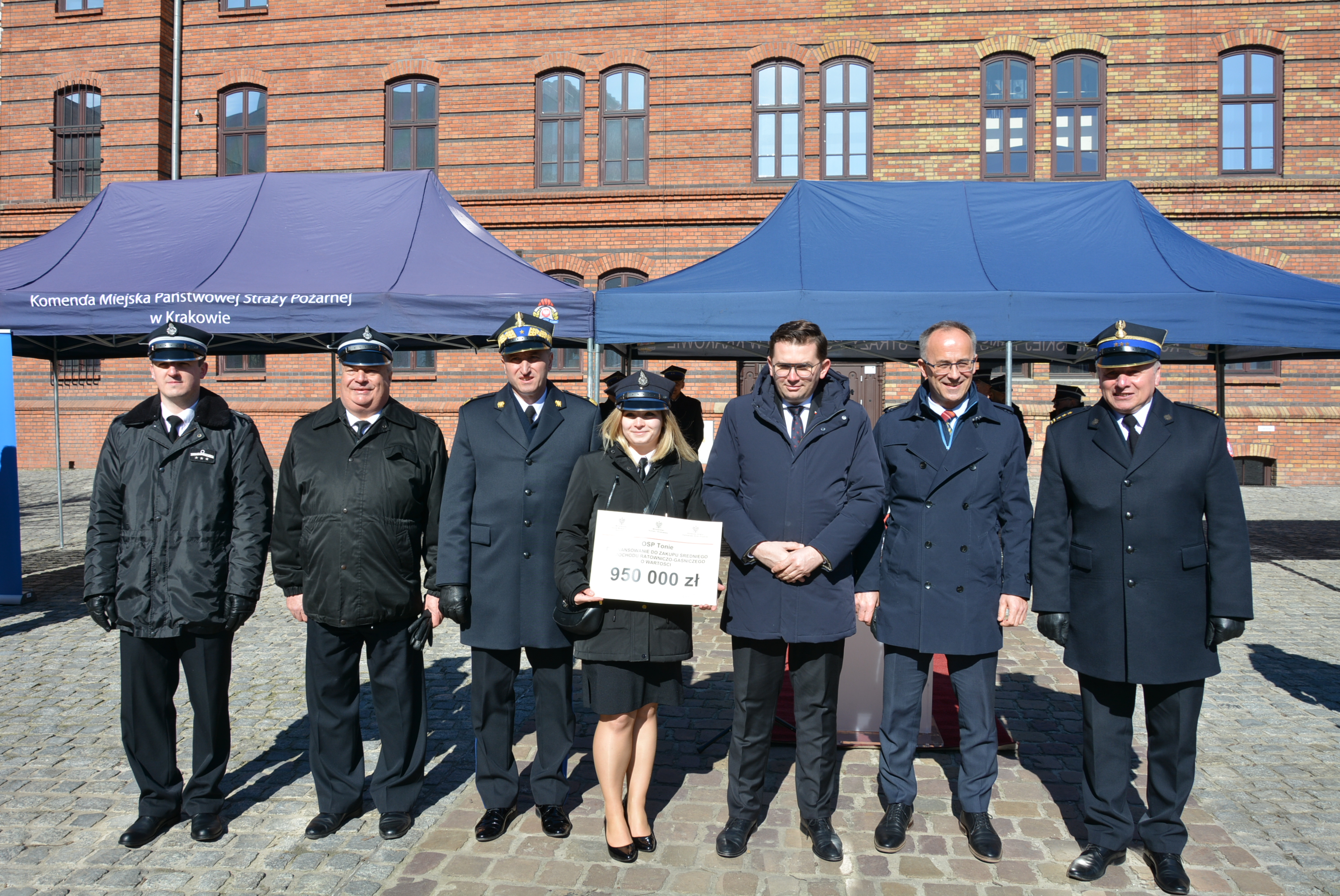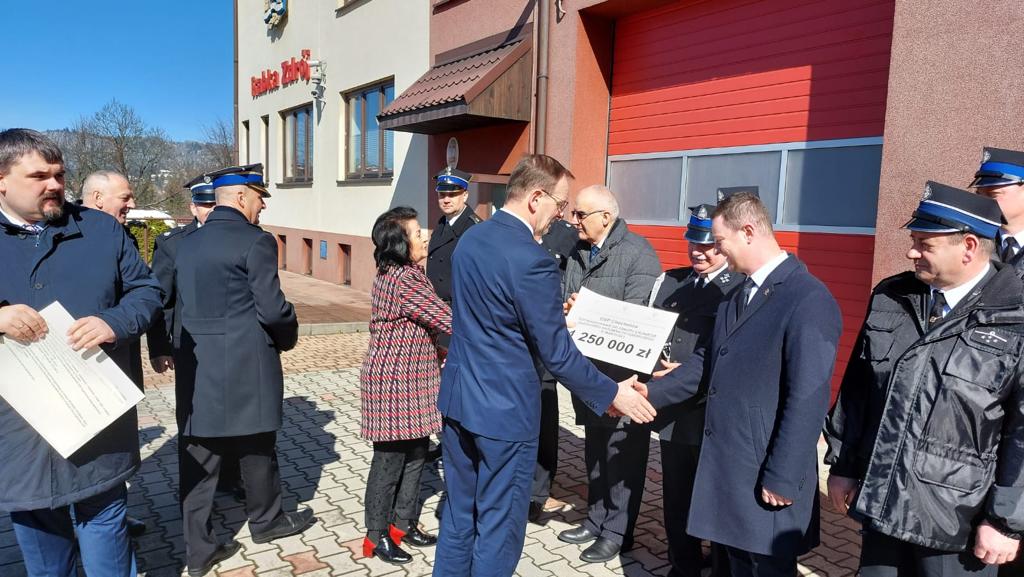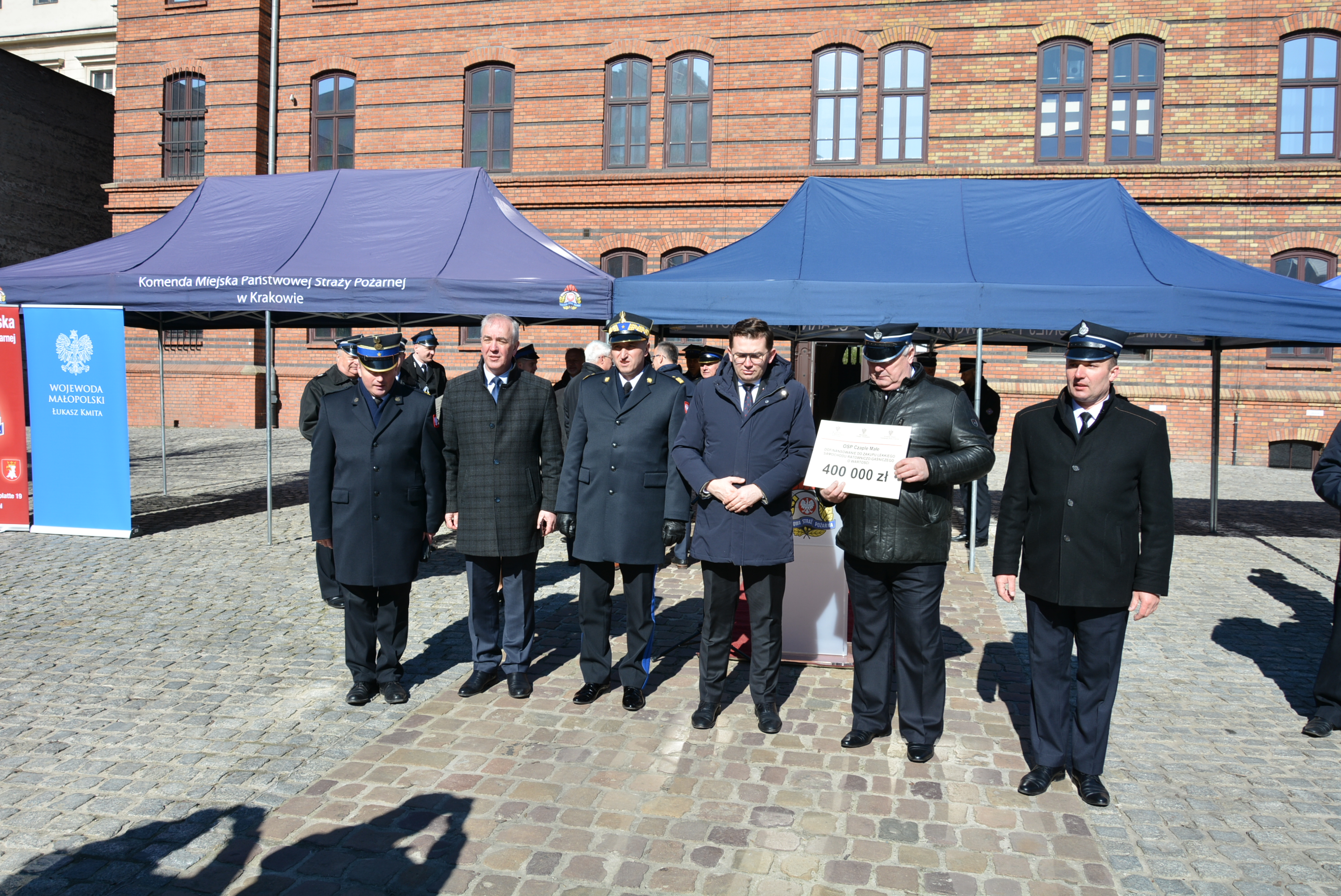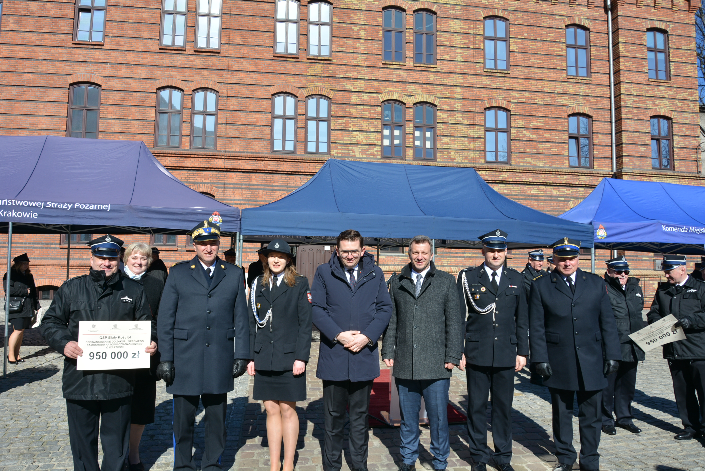 Przedstawiciele jednostek OSP z powiatów krakowskiego, miechowskiego i olkuskiego odebrali 29.03.2023 r. w Komendzie Miejskiej Państwowej Straży Pożarnej w Krakowie promesy na zakup pojazdów pożarniczych. Potwierdzenie dofinansowania przekazał wojewoda małopolski Łukasz Kmita, członek Zarządu Głównego Związku Ochotniczych Straży Pożarnych RP, wiceprezes Zarządu Oddziału Wojewódzkiego ZOSP RP Łukasz Smółka, małopolski komendant wojewódzki PSP nadbryg. Piotr Filipek, z-ca małopolskiego komendanta wojewódzkiego bryg. Przemysław Przęczek, komendant miejski PSP w Krakowie st. bryg. Paweł Knapik oraz prezes Wojewódzkiego Funduszu Ochrony Środowiska i Gospodarki Wodnej w Krakowie Kazimierz Koprowski. W Jednostce Ratowniczo-Gaśniczej Państwowej Straży Pożarnej w Rabce-Zdroju przedstawiciele OSP z powiatów nowotarskiego, limanowskiego i tatrzańskiego odebrali w tym samym dniu promesy potwierdzające przyznanie rządowych środków na zakup nowych wozów strażackich. Promesy wręczył II m.in. wicewojewoda małopolski Mateusz Małodziński. Obecni byli także sekretarz stanu w Ministerstwie Klimatu i Środowiska, prezes Zarządu Oddziału Wojewódzkiego Związku OSP RP Edward Siarka oraz posłowie Anna Paluch i Patryk Wicher oraz zastępca małopolskiego komendanta wojewódzkiego PSP st. bryg. Mariusz Łaciak.