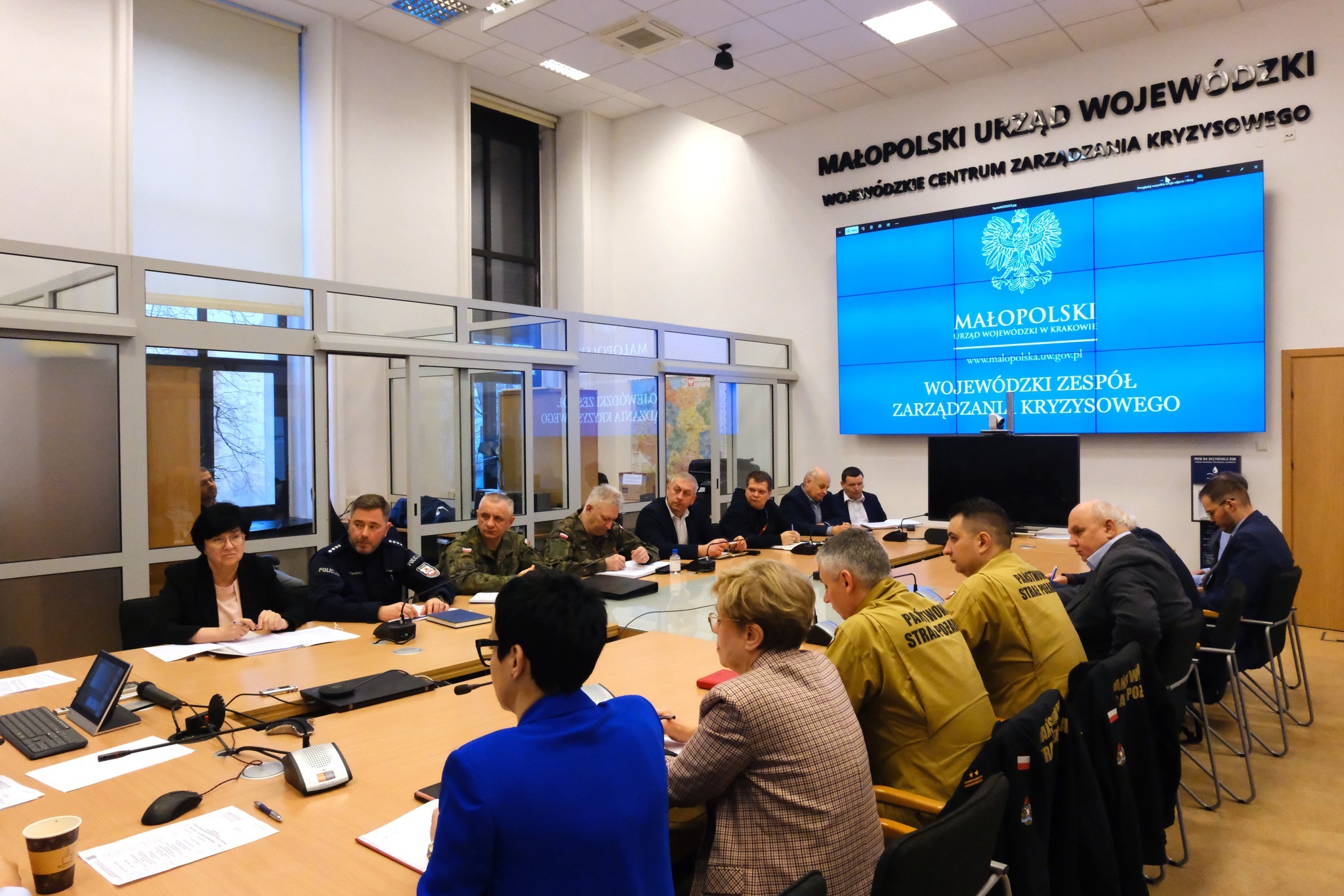 W posiedzeniu uczestniczyli: II wicewojewoda małopolski Ryszard Śmiałek, dyrektor Regionalnego Zarządu Gospodarki Wodnej w Krakowie Wojciech Kozak, p.o. małopolskiego wojewódzkiego inspektora ochrony środowiska Barbara Żuk, zastępca małopolskiego komendanta wojewódzkiego Państwowej Straży Pożarnej bryg. Marcin Głogowski, komendant wojewódzki Państwowej Straży Rybackiej w Krakowie Bogdan Klimek, przedstawiciele: Komendy Wojewódzkiej Policji, Małopolskiej Państwowej Wojewódzkiej Inspekcji Sanitarnej, Małopolskiej Brygady Obrony Terytorialnej, Urzędu Miasta Krakowa oraz dyrektorzy wydziałów Małopolskiego Urzędu Wojewódzkiego w Krakowie. Po posiedzeniu odbył się briefing prasowy.