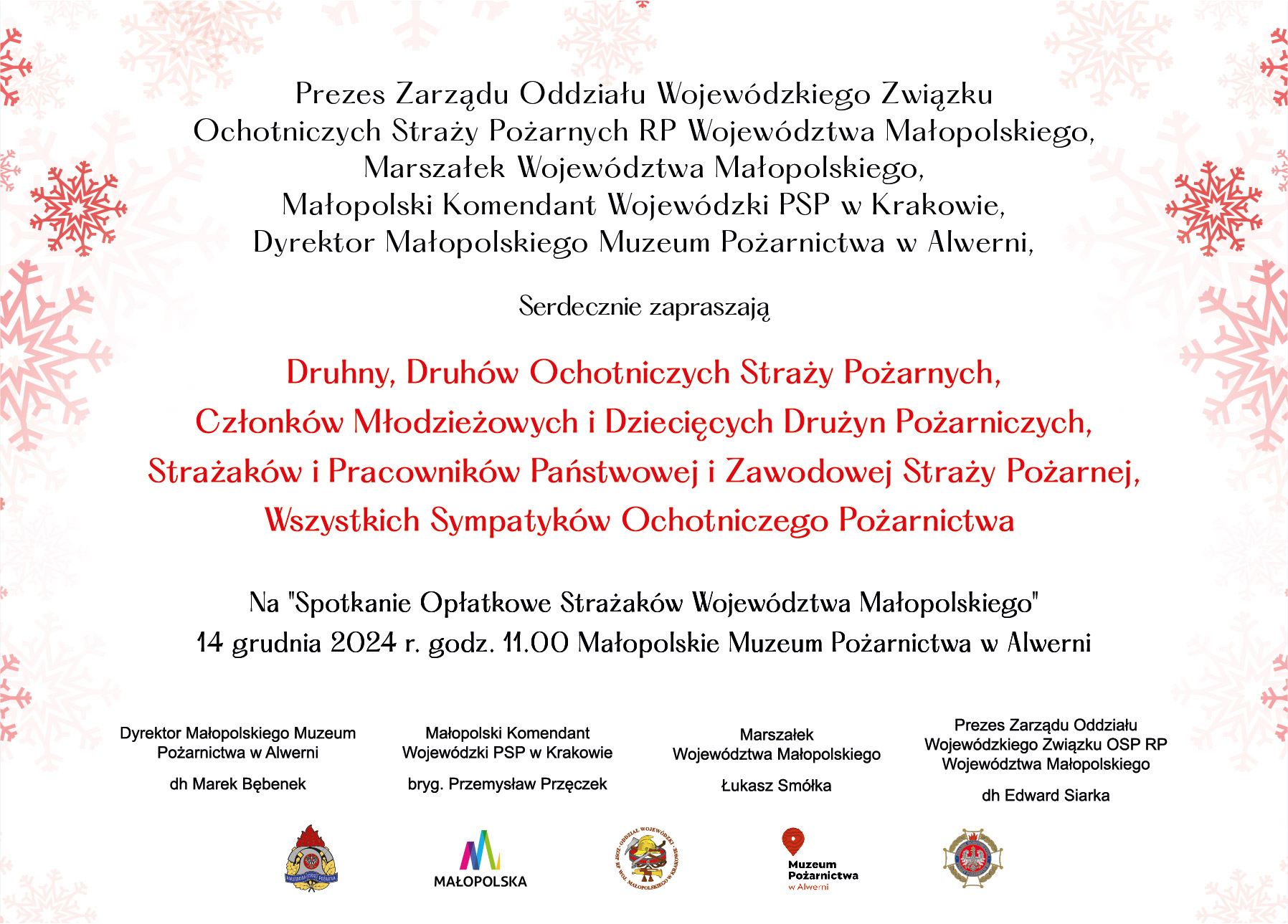 Druhny, Druhów Ochotniczych Straży Pożarnych, Członków Młodzieżowych i Dziecięcych Drużyn Pożarniczych, Strażaków i Pracowników Państwowej i Zawodowej Straży Pożarnej, Wszystkich Sympatyków Ochotniczego Pożarnictwa Na "Spotkanie Opłatkowe Strażaków Województwa Małopolskiego," które odbędzie się 14 grudnia 2024 r. godz. 11.00 Małopolskie Muzeum Pożarnictwa w Alwerni.