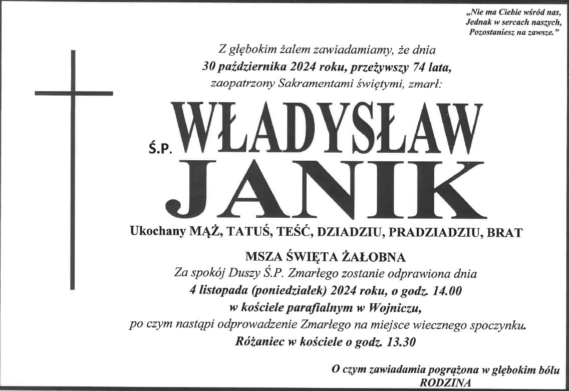 Uroczystości pogrzebowe odbędą się w dniu 4 listopada 2024 r. o godzinie 14:00 w Kościele p.w. św. Wawrzyńca w Wojniczu, po czym nastąpi odprowadzenie zmarłego na miejsce wiecznego spoczynku na Cmentarz Parafialny w Wojniczu.