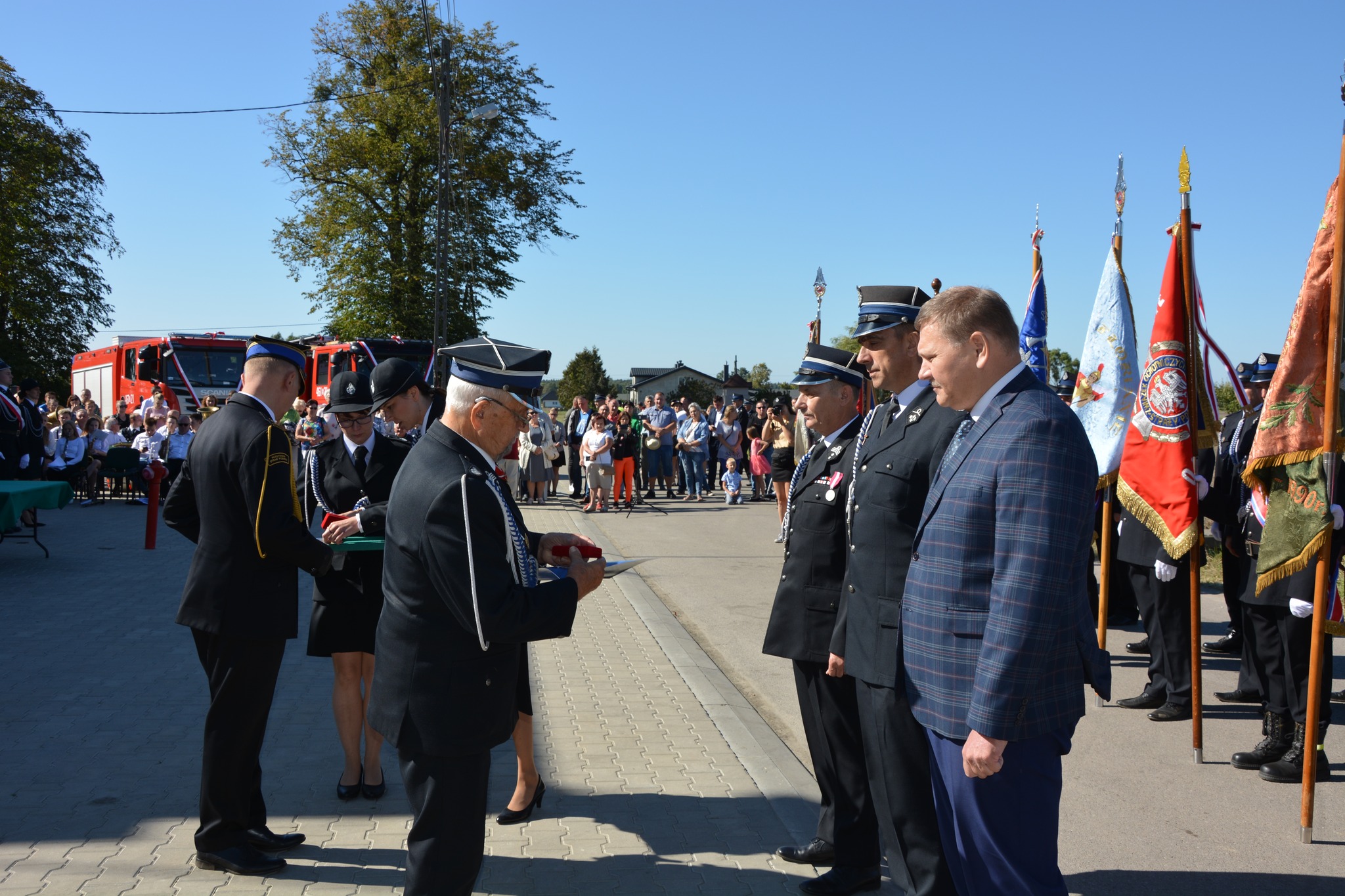 Uroczystość rozpoczęła się od przemarszu druhów ochotników do miejsca, gdzie odprawiono mszę świętą polowa koncelebrowana przez kapelana druhów oraz proboszcza parafii Chrusty Nowe. Główna część uroczystości rozpoczęła się od przedstawienia rysu historycznego jednostki, następnie przekazano nowy samochód ratowniczo - gaśniczy oraz wręczono promesy na wyposażenie tego pojazdu. Kolejnym elementem był poświęcone przez księdza kapelana, przekazanej Scani oraz Iveco, które otrzymała KP PSP w Koluszkach.