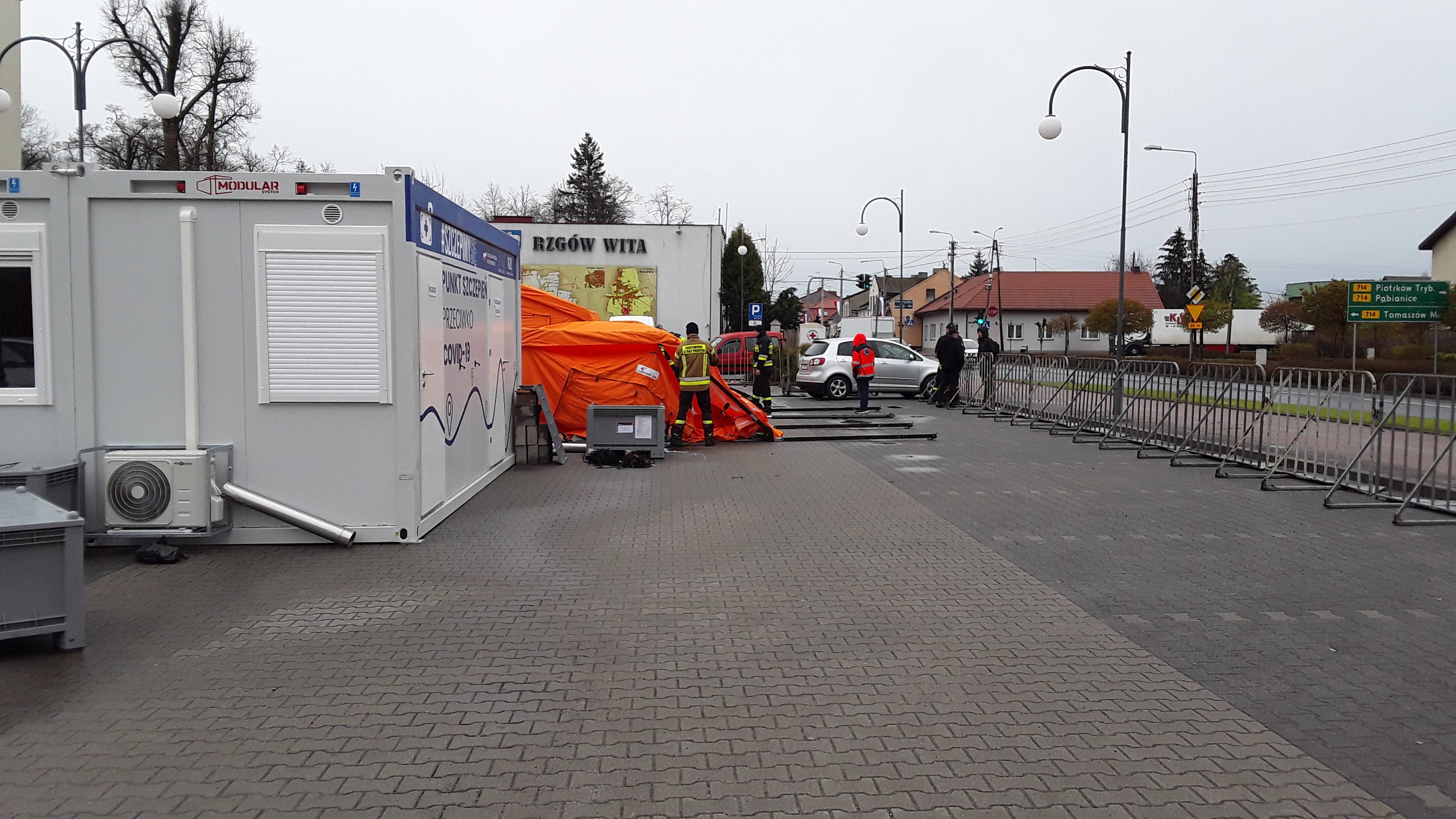 5 maja mobilny punkt szczepień trafił do Rzgowa, gdzie strażacy z JRG w Koluszkach oraz druhowie z gminy Rzgów rozstawili 5 namiotów oraz barierki zabezpieczające na parkingu przy ul. Łódzkiej. Druhowie OSP od dzisiaj pełnią również dyżury jako pomoc logistyczna w punkcie.