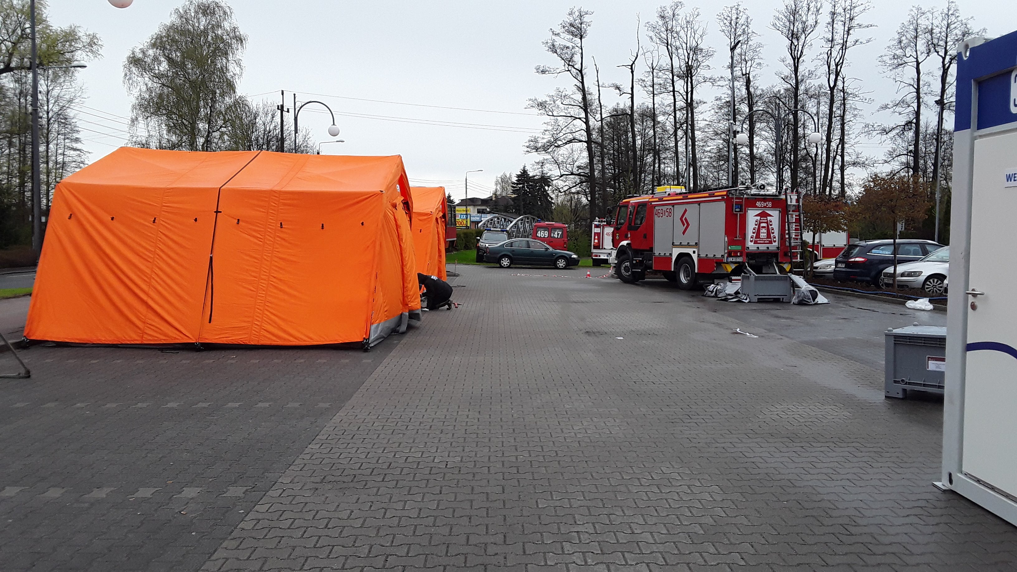 Mobilny punkt szczepień - strażacy pomagają w jego budowie