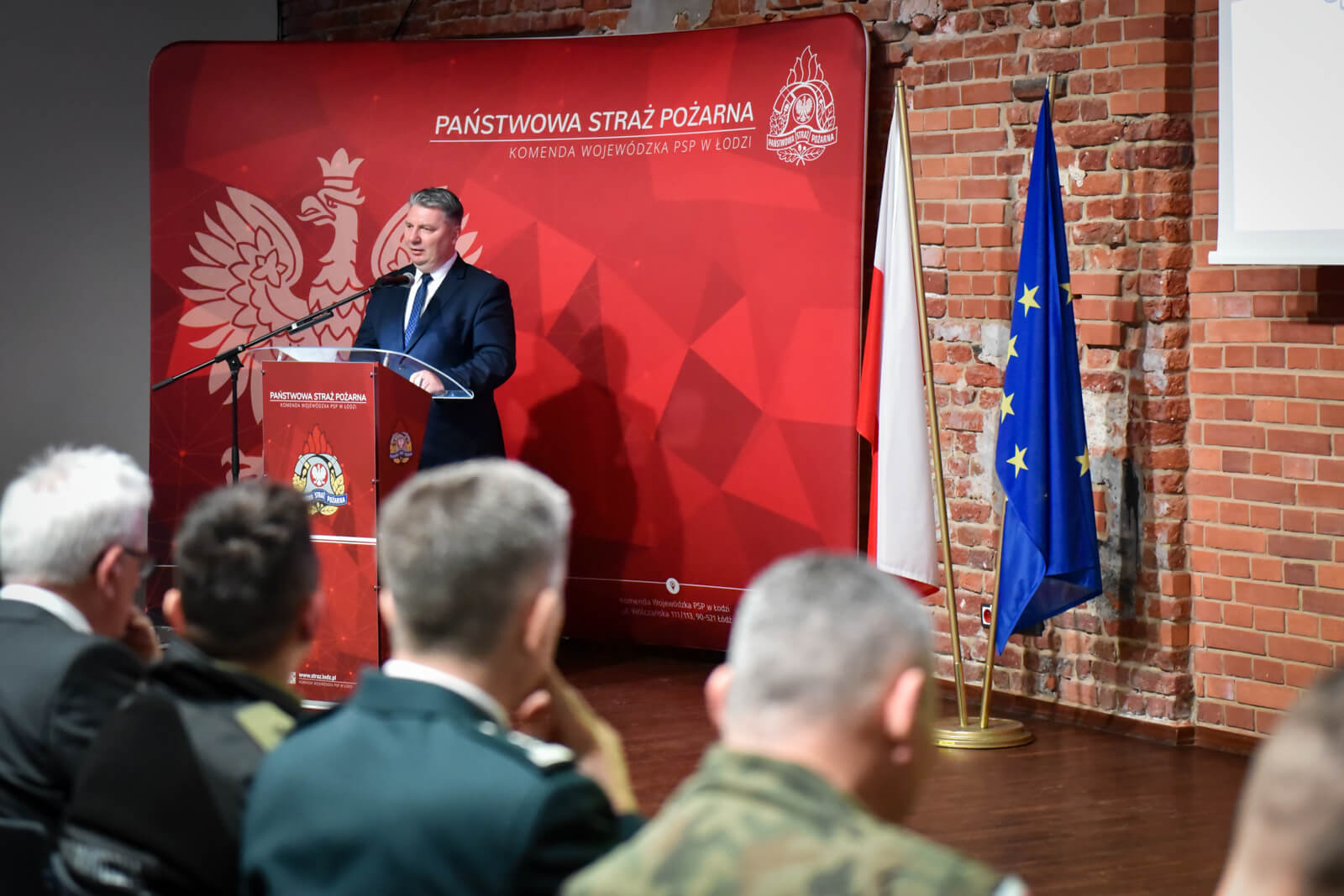 Piotr Kopka – Prezes Zarządu Wojewódzkiego Funduszu Ochrony Środowiska i Gospodarki Wodnej w Łodzi, który przedstawił inicjatywy wspierające strażaków w zakresie ochrony środowiska i zrównoważonego rozwoju.