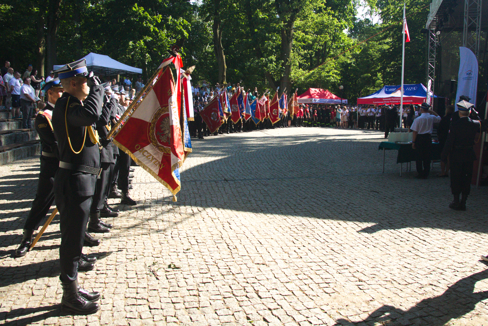 Uroczystość rozpoczęła się przemarszem strażackich pododdziałów do Parku w Dobroniu, gdzie po podniesieniu flagi państwowej na maszt i odśpiewaniu hymnu państwowego wręczono odznaczenia i awanse na wyższe służbowe.