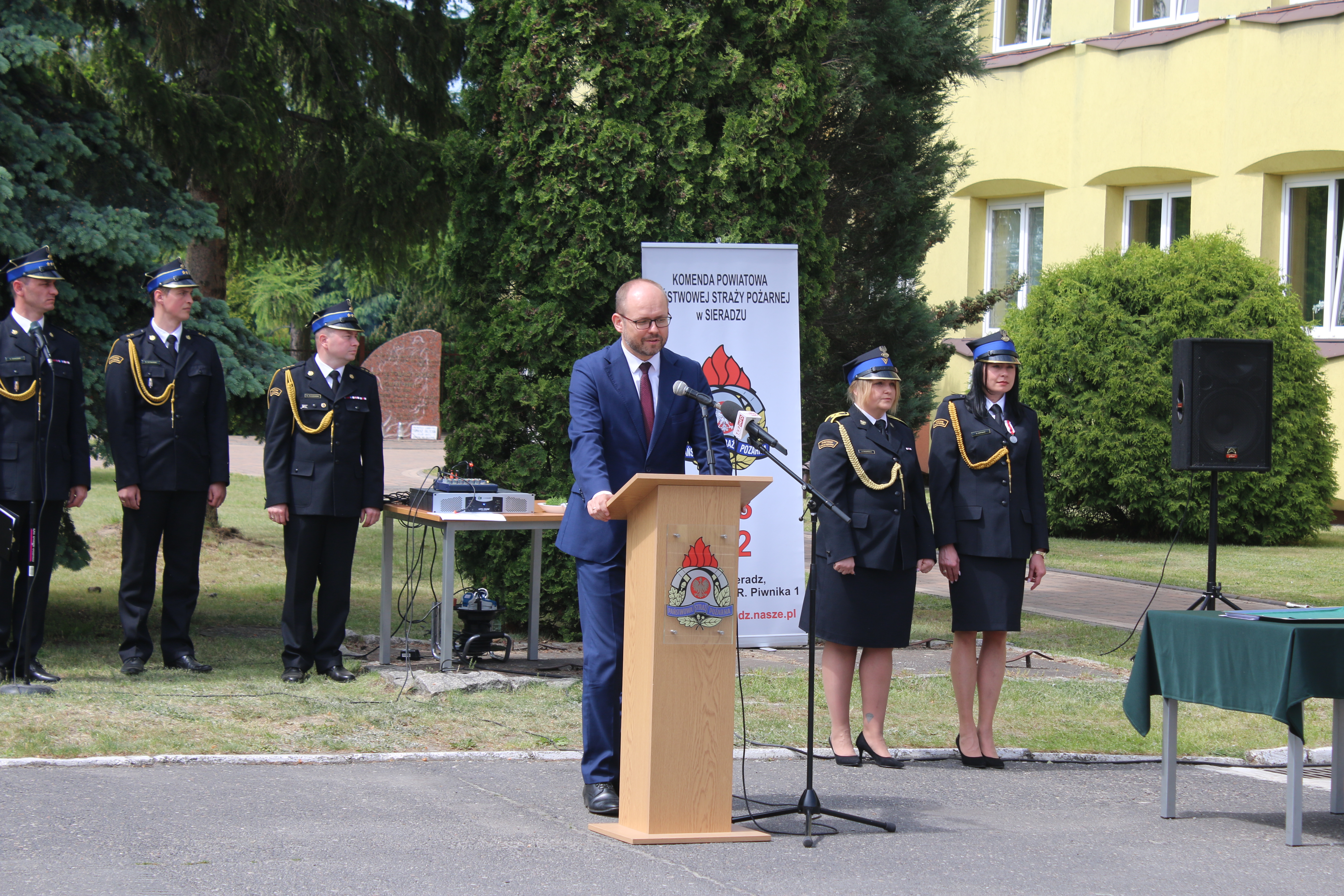 Uroczystość rozpoczęła się od złożenia meldunku st. bryg. Pawłowi Malinowskiemu Zastępcy Łódzkiego Komendanta Wojewódzkiego PSP w Łodzi przez dowódcę uroczystości st. kpt. Marcina Zwierzaka. Następnie w swoim wystąpieniu Komendant Powiatowy PSP w Sieradzu st. bryg. Radosław Jadwiszczak przekazał podziękowania strażakom z powiatu sieradzkiego za pełną wyzwań służbę.