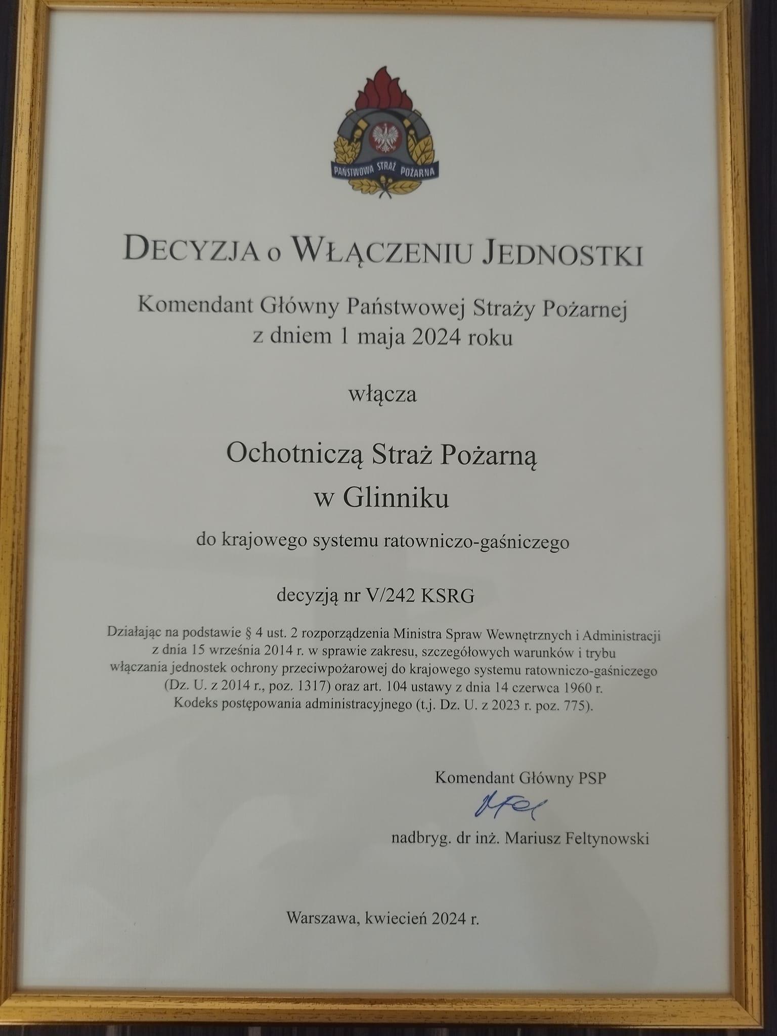 17 czerwca 2024 r. w strażnicy Ochotniczej Straży Pożarnej w Glinniku (powiat tomaszowski) odbyła się uroczysta zbiórka z okazji włączenia jednostki do krajowego systemu ratowniczo-gaśniczego.
