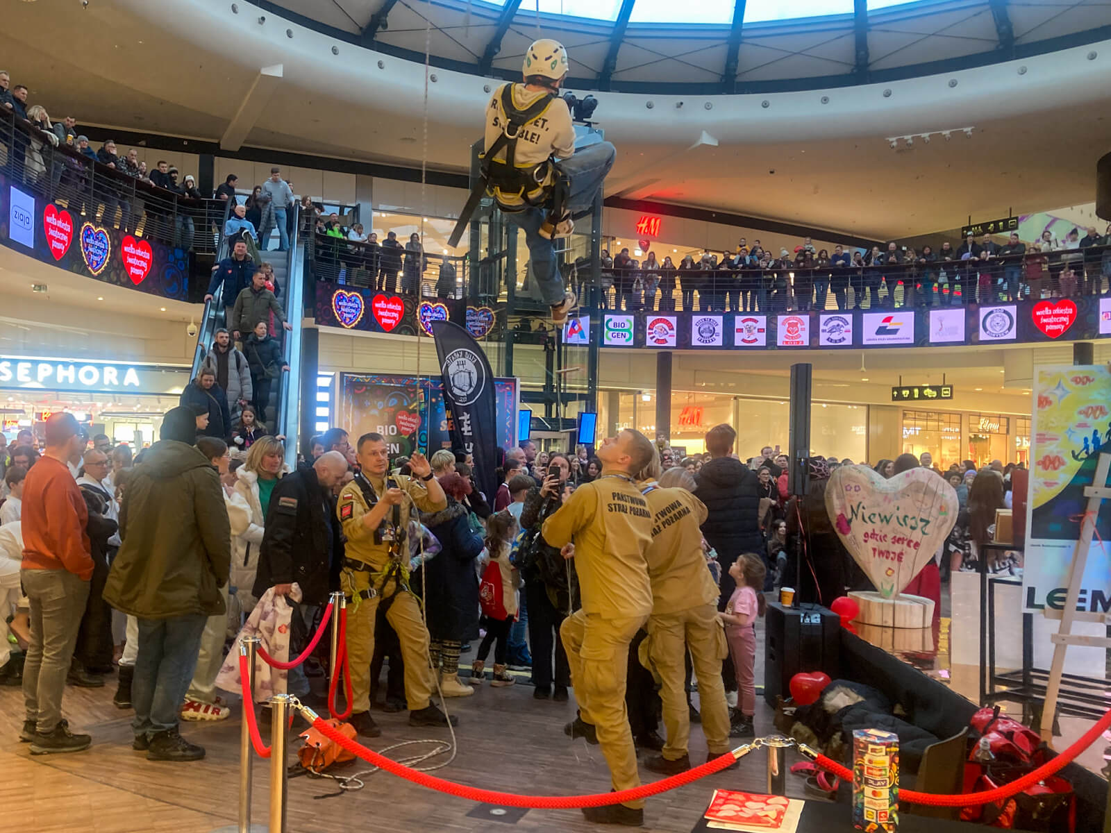 Jedną z atrakcji była możliwość wejścia na drabinę speleo, odbywająca się pod ścisłą asekuracją strażaków. Dla wielu uczestników była to niecodzienna okazja, by sprawdzić swoje możliwości oraz porozmawiać z funkcjonariuszami o specyfice pracy ratowników.