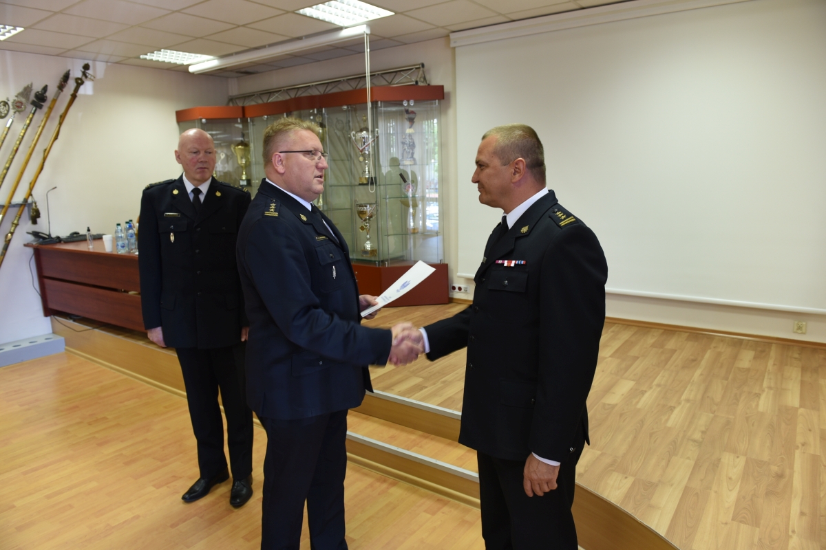 W trakcie spotkania st.bryg. Grzegorz Janowski wraz ze st.bryg. Markiem Jankowskim wręczyli Komendantom Powiatowym i Miejskim PSP decyzje Komendanta Głównego PSP o skierowaniu do służby stałej młodszych aspirantów w poszczególnych komendach PSP.