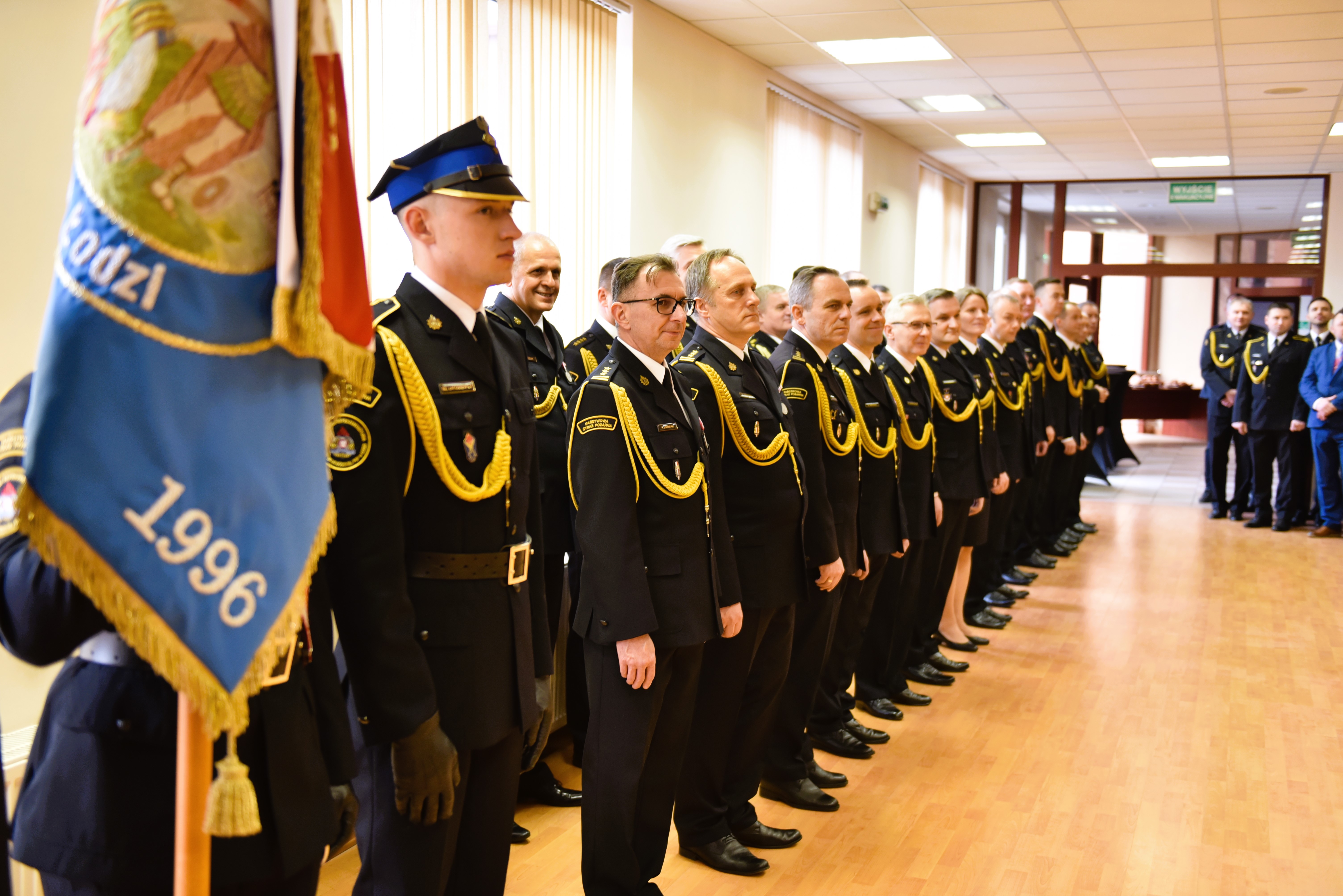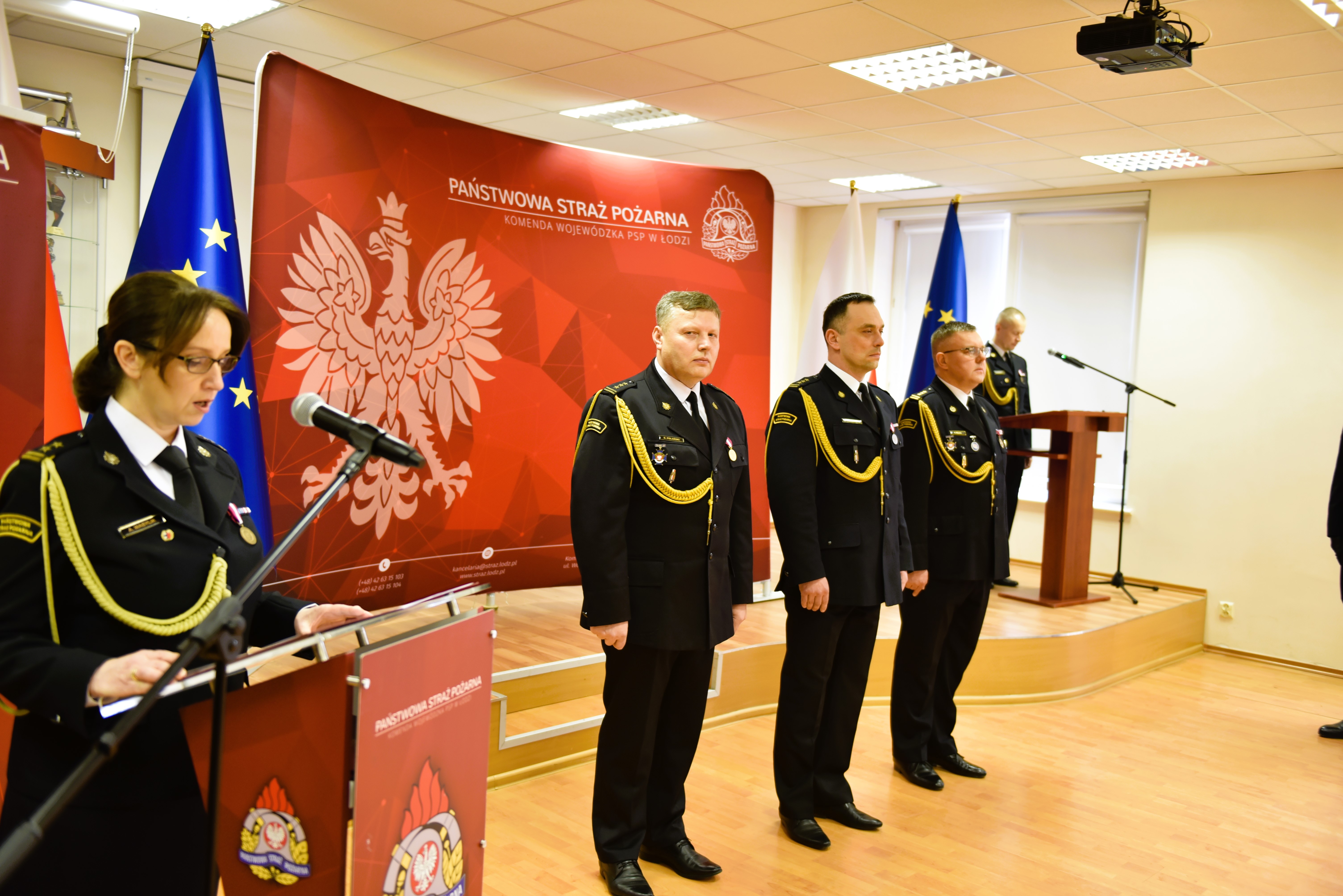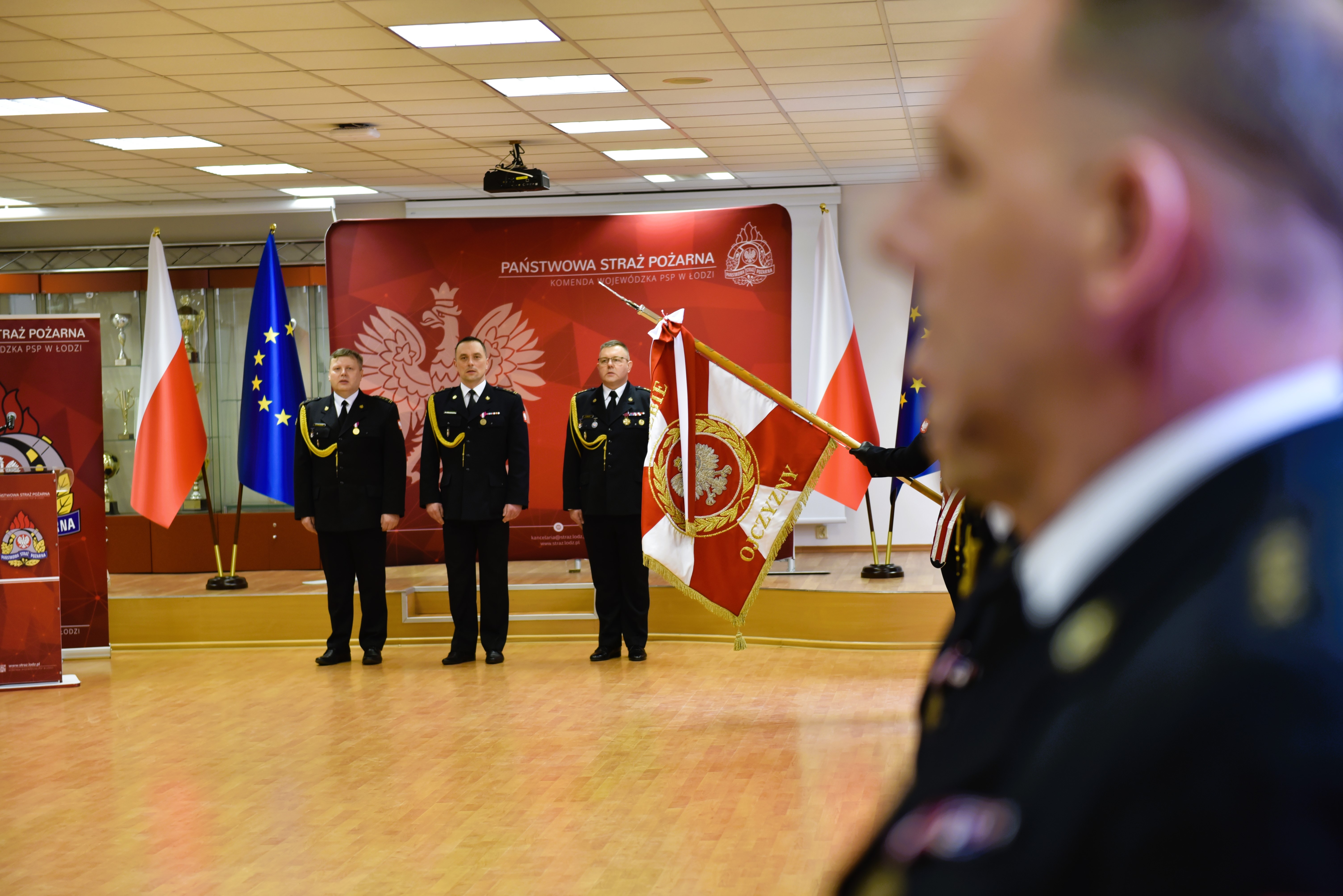 Uroczystość rozpoczęła się od złożenia meldunku st. bryg. Mariuszowi Wojcieszko zastępcy łódzkiego komendanta wojewódzkiego PSP w Łodzi, po którym wprowadzono poczet sztandarowy Komendy Wojewódzkiej Państwowej Straży Pożarnej w Łodzi oraz odśpiewano hymn państwowy.