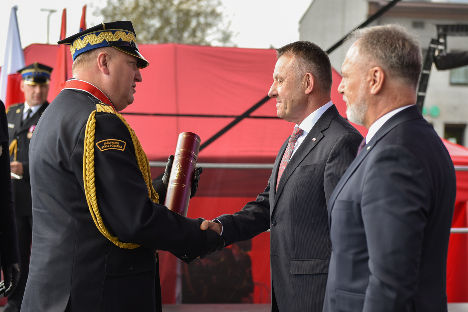 Kolejnym elementem uroczystości było przekazanie średniego samochodu ratowniczo-gaśniczego z Ośrodka Szkolenia KW PSP w Łodzi do Ochotniczej Straży Pożarnej w Poddębicach.