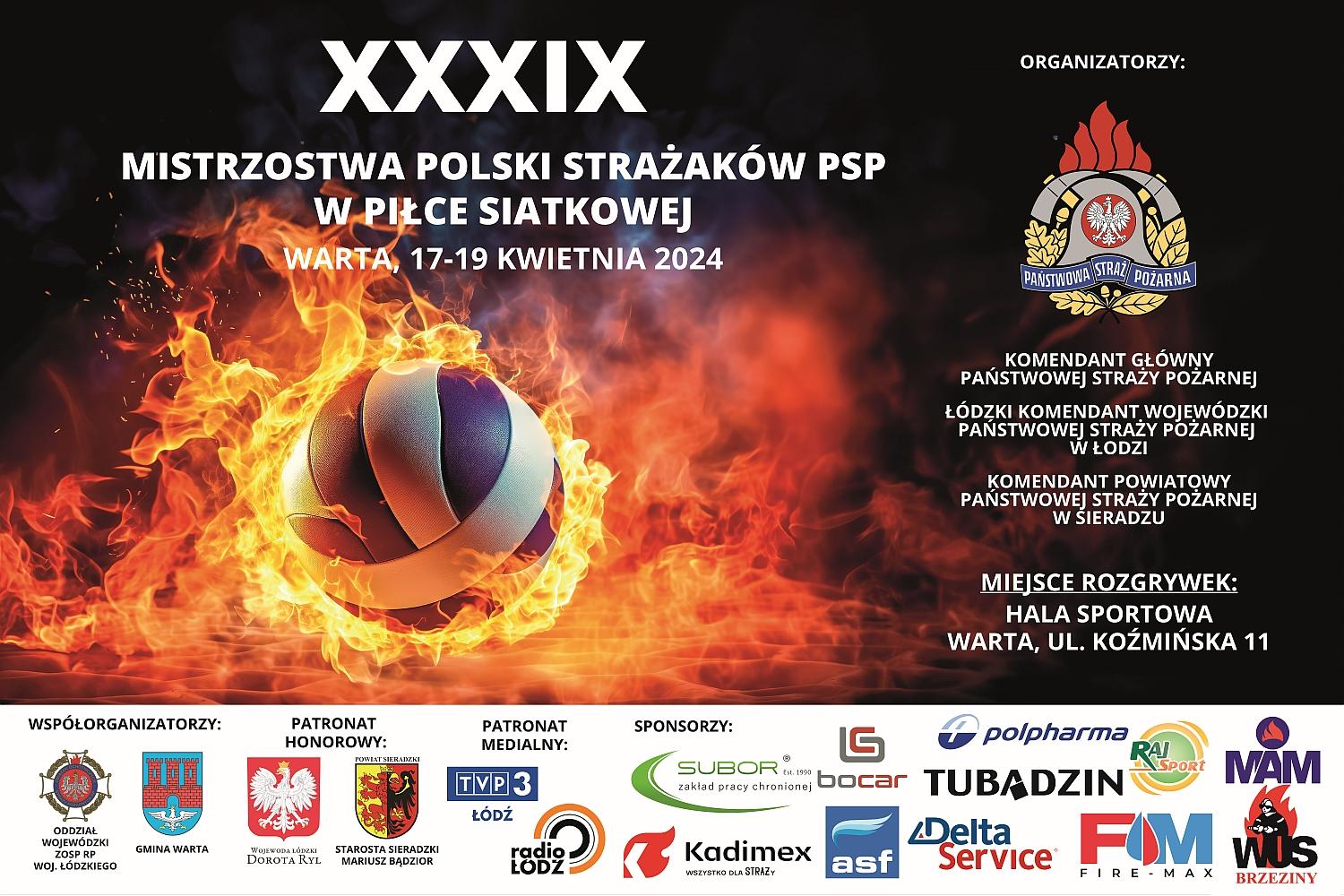 Zapraszamy na turniej finałowy XXXIX Mistrzostw Polski Strażaków PSP w Piłce Siatkowej, który odbędzie się w dniach 17-19 kwietnia 2024 roku, w Hali Sportowej w Warcie przy ul. Koźmińskiej 11.