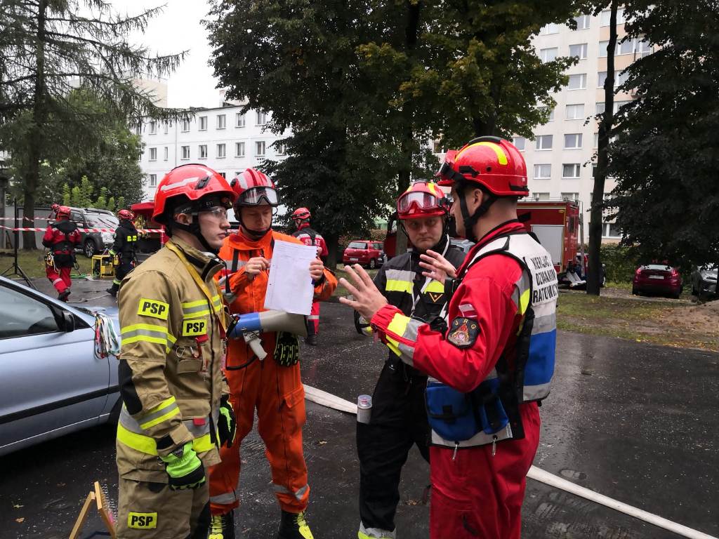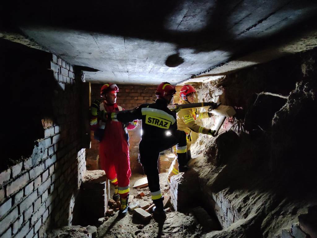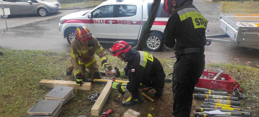 W minioną środę 28 września Komenda Wojewódzka PSP w Olsztynie na terenie Komedy Miejskiej Państwowej Straży Pożarnej w Olsztynie zorganizowała ćwiczenia zgrywające grup specjalistycznych. Udział w nich wzięły Specjalistyczna Grupa Ratownictwa Technicznego „Ostróda” oraz Specjalistyczna Grupa Poszukiwawczo-Ratownicza „Nidzica, a także Specjalistyczna Grupa Ratownictwa Wysokościowego z Olsztyna. Ćwiczenia odbywały się na bardzo ciekawym obiekcie, w byłym schronie podziemnym. Strażacy otrzymali zadanie dotarcia do poszkodowanego, który zgodnie ze scenariuszem miał zostać przysypany w jednym z korytarzy. Stan techniczny ścian w tunelu wymagał wykonania umocnień i stabilizacji naruszonych elementów konstrukcyjnych. Takie umocnienia pozwoliły na bezpieczne przemieszczanie się strażaków w kierunku poszkodowanego. To zadanie właśnie realizowała ostródzka SGRT. Strażacy w miejscach o niestabilnej konstrukcji instalowali podpory z tak zwanego systemu gotowego. Cała operacja to system naczyń połączonych. Wyznaczeni strażacy dokonywali pomiarów i przekazywali dowódcy, jakie elementy są potrzebne. Kolejni wycinali z elementów drewnianych podciągi i podwaliny na określony wymiar, a strażacy wyznaczeni do montażu sprawiali elementy na powierzchni. Finalnie tak przygotowane elementy przekazywano strażakom pod ziemię, a ci montowali podpory w miejscach, gdzie elementy konstrukcyjne nie były stabilne. Strażacy z SGPR Nidzica równolegle wykonywali przewiert przez strop, którym następnie wtłaczane było powietrze do tunelu. Strażacy wysokościowi z Olsztyna zbudowali stanowisko, którym przy pomocy technik linowych ewakuowany był spod ziemi poszkodowany oraz transportowany sprzęt ratowniczy. Ćwiczenia zgrywające grup specjalistycznych są ważnym elementem utrzymywania odpowiedniego poziomu wyszkolenia. Współdziałanie specjalistów z różnych dziedzin ratowniczych wymaga wzajemnej znajomości zakresu specjalizacji, sprzętu oraz wymiany doświadczeń. Podczas ćwiczeń zgrywających właśnie strażacy mają okazję zgłębić tę tematykę.