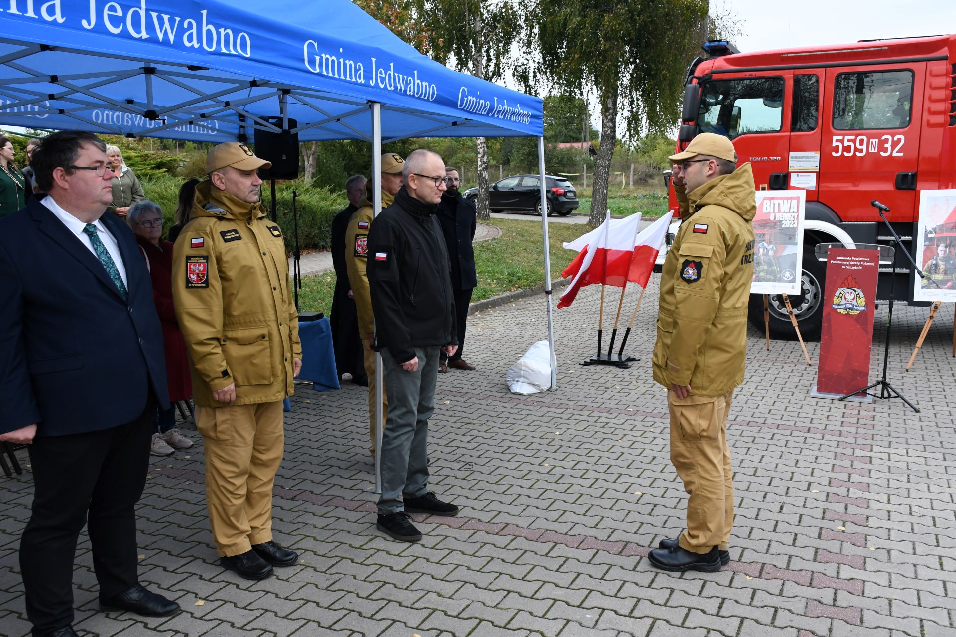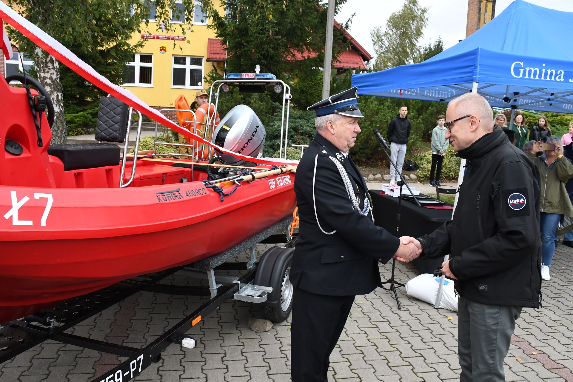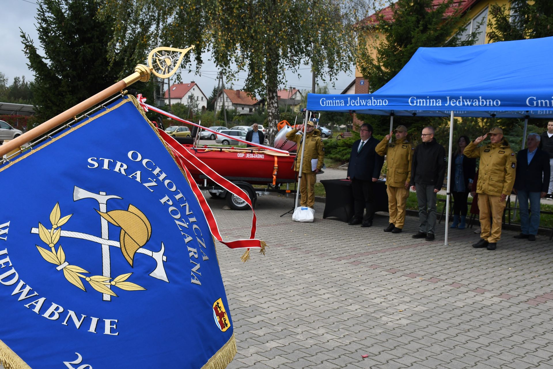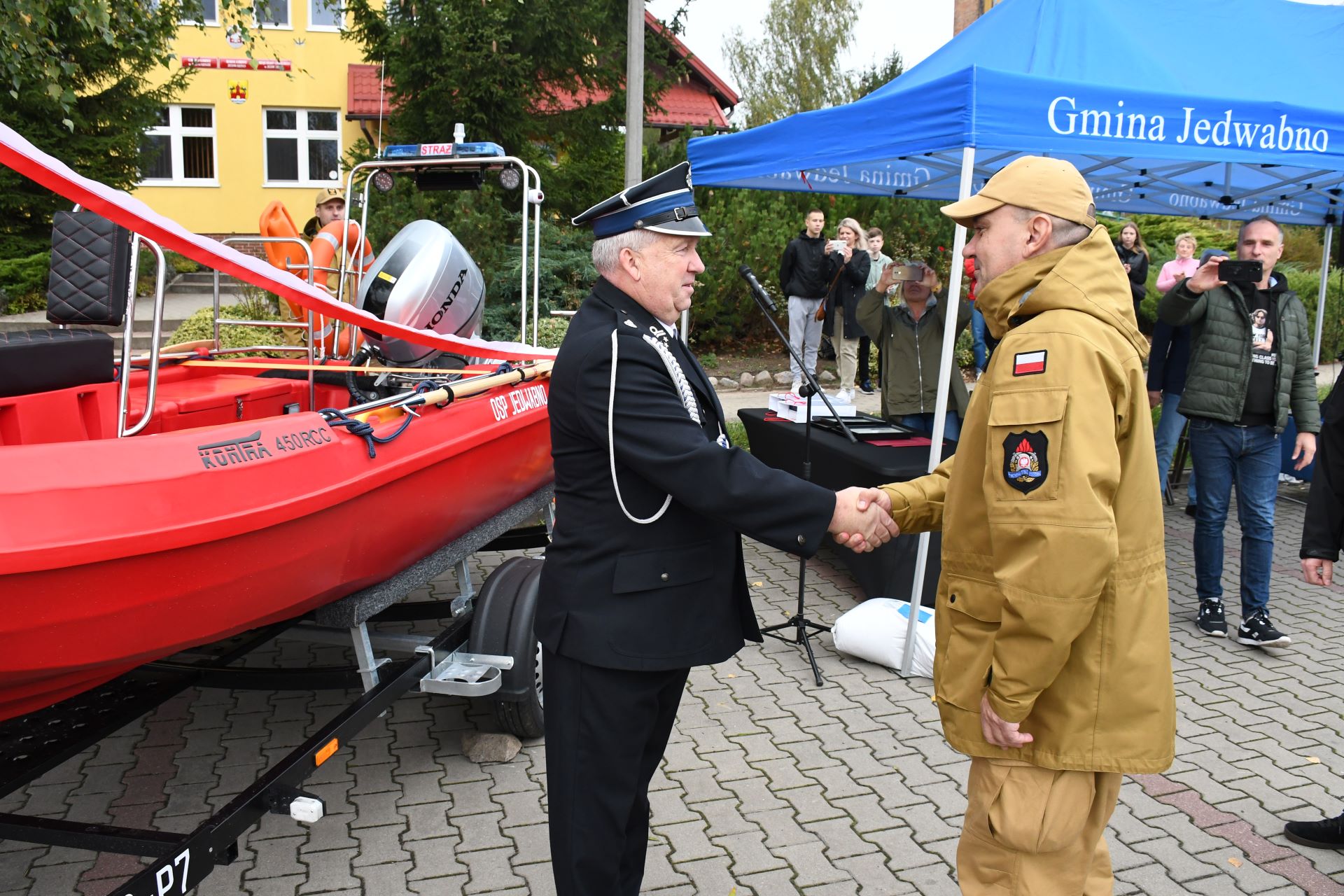 W piątkowe popołudnie 6 października na placu przy urzędzie gminy w Jedwabnie – pow. szczycieński odbyła się uroczysta zbiórka, z okazji oficjalnego przekazania do Ochotniczej Straży Pożarnej w Jedwabnie nowej, motorowej łodzi ratowniczej. Zgromadzonych na uroczystości przywitał Wójt Gminy Jedwabno Sławomir Ambroziak, a pośród nich obecni byli między innymi: Błażej Poboży Podsekretarz Stanu w Ministerstwie Spraw Wewnętrznych i Administracji, nadbryg. Tomasz Komoszyński Warmińsko-Mazurski Komendant Wojewódzki Państwowej Straży Pożarnej, a także st. bryg. Grzegorz Rybaczyk Komendant Powiatowy PSP w Szczytnie oraz strażacy ochotnicy i lokalne społeczeństwo. Nowa łódź ratownicza to było jedno z marzeń strażaków ochotników z Jedwabna. I dziś to marzenie się spełniło w postaci łodzi ratowniczej marki Kontra, której koszt zakupu wyniósł 124 tys. złotych. Zakup sfinansowano ze środków gminy w kwocie 74 tys. zł oraz dotacji rządowej w wysokości 50 tys. zł. Ponadto podczas uroczystości Wiceminister wraz z Komendantem Wojewódzkim PSP wręczyli promesy na zakup sprzętu pożarniczego w kwocie 20 tys. zł każda, które trafiły do OSP w Jedwabnie oraz OSP w Płozach.