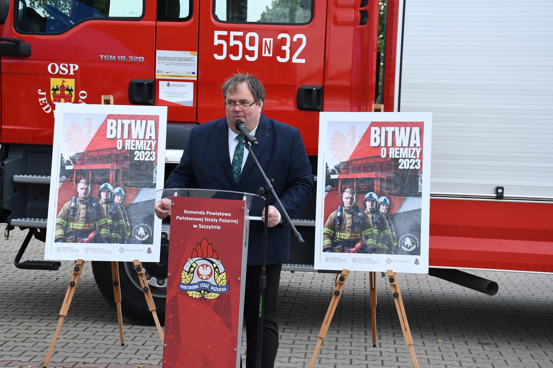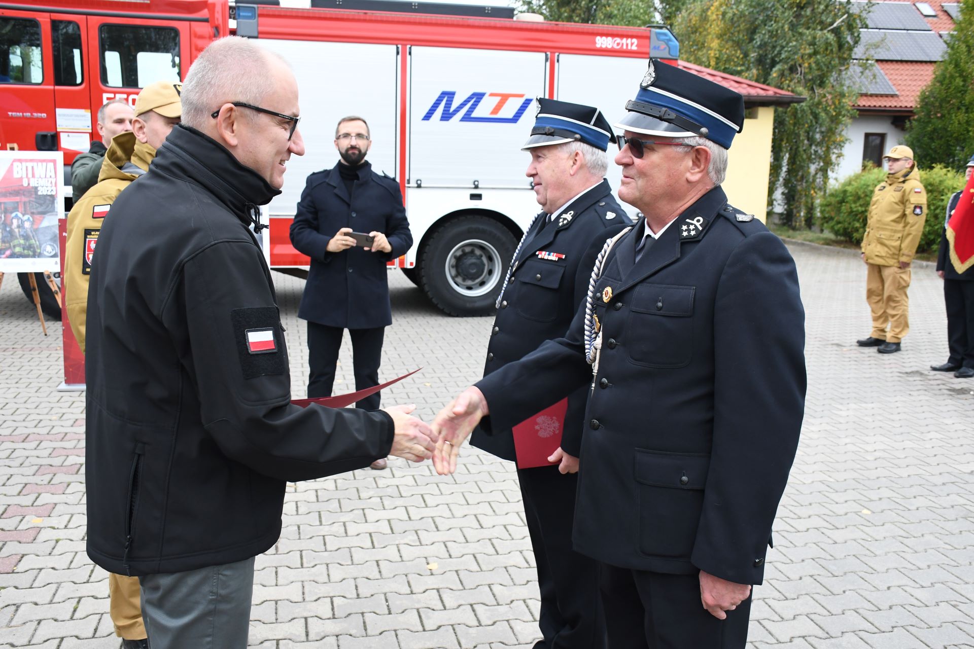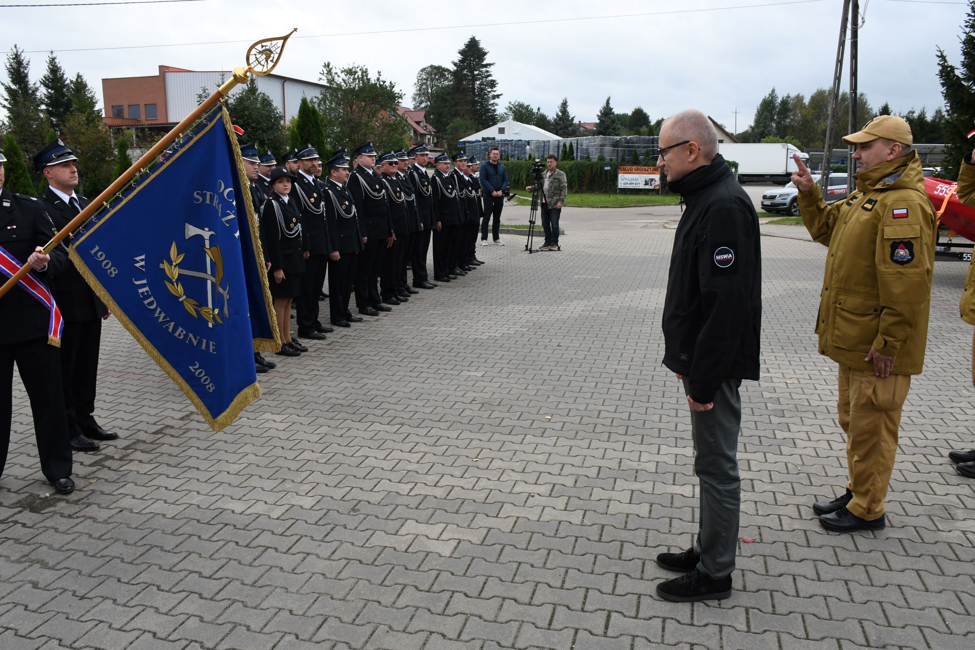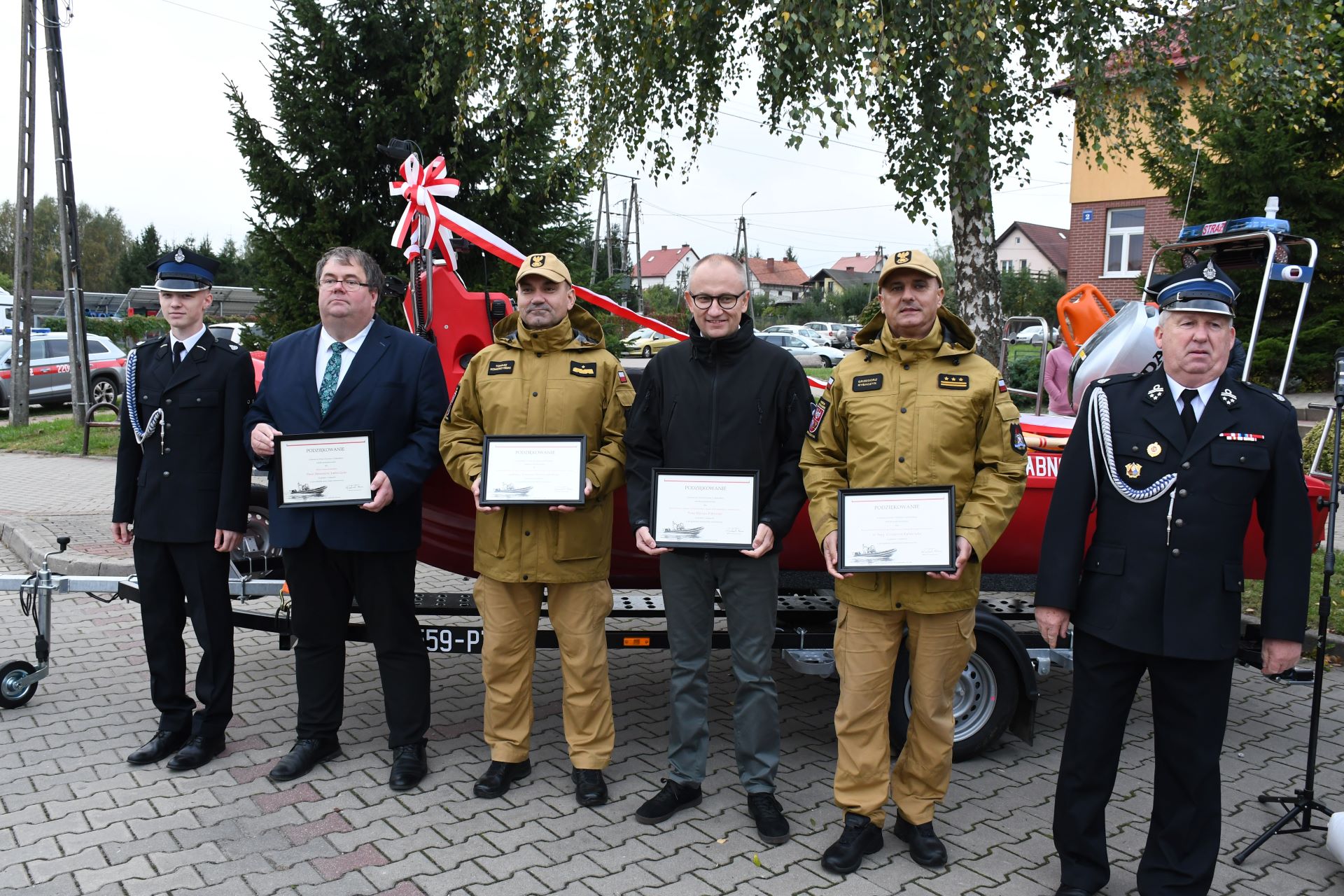 W piątkowe popołudnie 6 października na placu przy urzędzie gminy w Jedwabnie – pow. szczycieński odbyła się uroczysta zbiórka, z okazji oficjalnego przekazania do Ochotniczej Straży Pożarnej w Jedwabnie nowej, motorowej łodzi ratowniczej. Zgromadzonych na uroczystości przywitał Wójt Gminy Jedwabno Sławomir Ambroziak, a pośród nich obecni byli między innymi: Błażej Poboży Podsekretarz Stanu w Ministerstwie Spraw Wewnętrznych i Administracji, nadbryg. Tomasz Komoszyński Warmińsko-Mazurski Komendant Wojewódzki Państwowej Straży Pożarnej, a także st. bryg. Grzegorz Rybaczyk Komendant Powiatowy PSP w Szczytnie oraz strażacy ochotnicy i lokalne społeczeństwo. Nowa łódź ratownicza to było jedno z marzeń strażaków ochotników z Jedwabna. I dziś to marzenie się spełniło w postaci łodzi ratowniczej marki Kontra, której koszt zakupu wyniósł 124 tys. złotych. Zakup sfinansowano ze środków gminy w kwocie 74 tys. zł oraz dotacji rządowej w wysokości 50 tys. zł. Ponadto podczas uroczystości Wiceminister wraz z Komendantem Wojewódzkim PSP wręczyli promesy na zakup sprzętu pożarniczego w kwocie 20 tys. zł każda, które trafiły do OSP w Jedwabnie oraz OSP w Płozach.