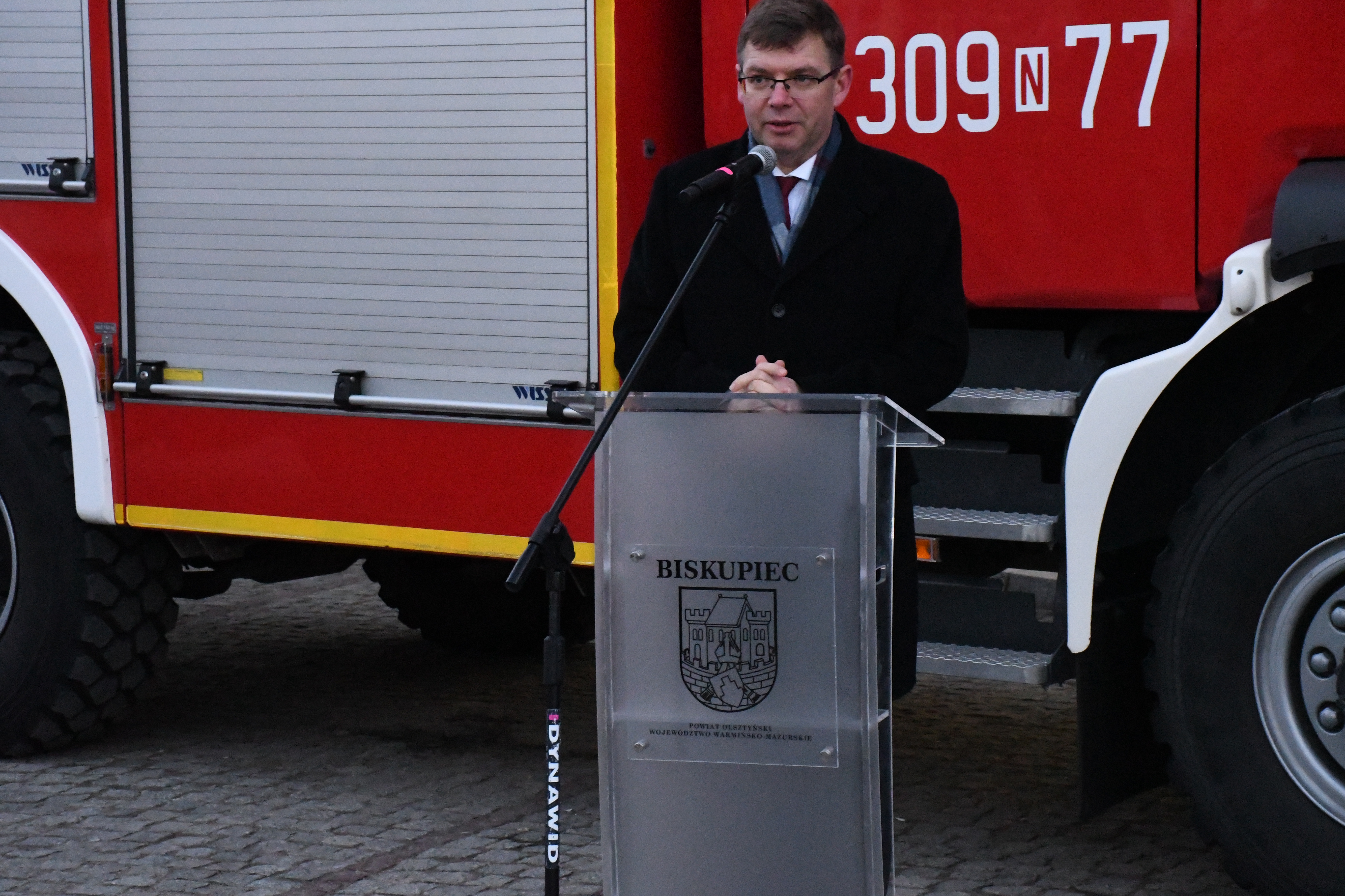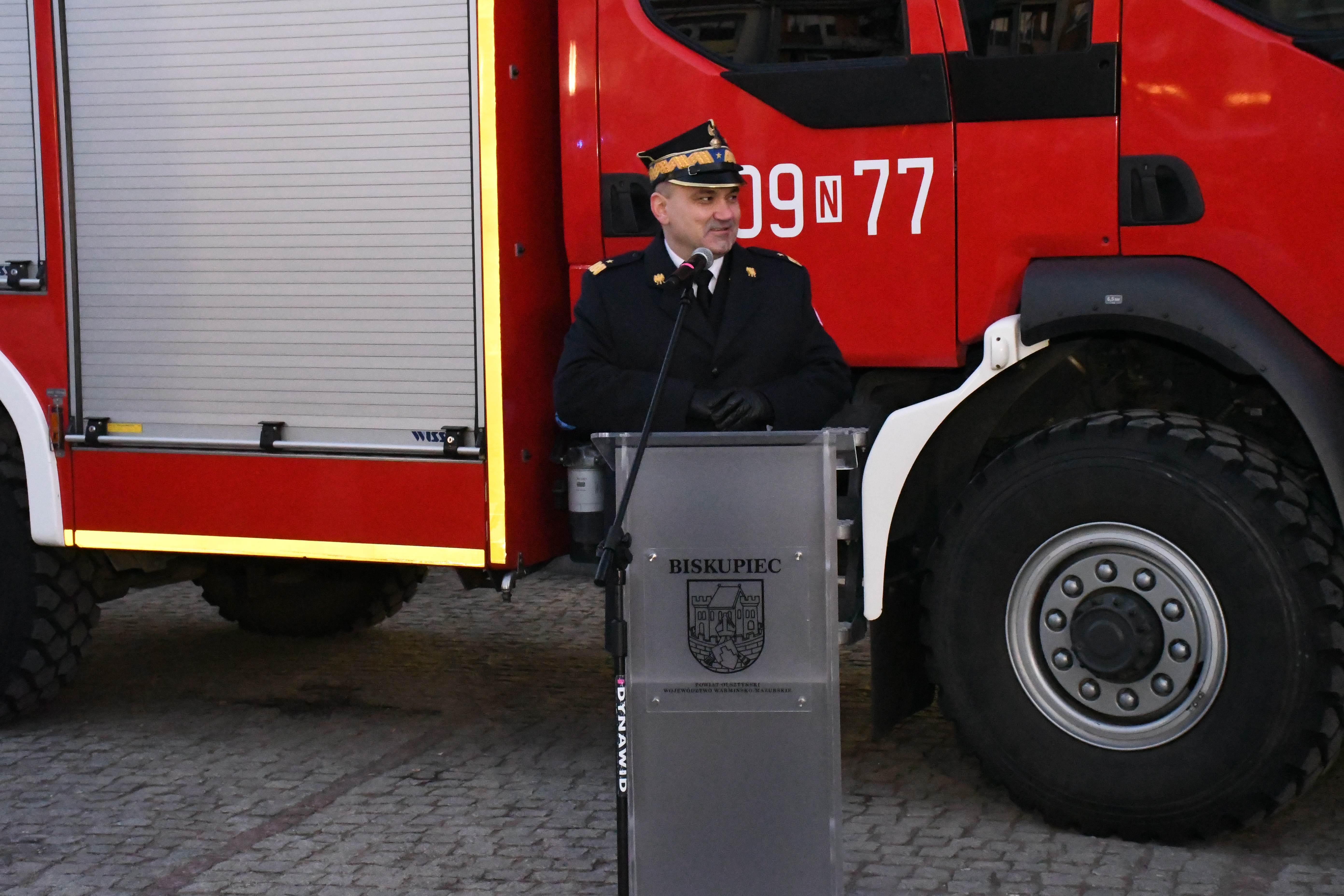 Do strażaków ochotników z Biskupca z zasobów Warmińsko-Mazurskiego Komendanta Wojewódzkiego PSP trafił ciężki samochód ratowniczo-gaśniczy o pojemności zbiornika na wodę 9,5 tys. litrów z 2005 roku. Pojazd przekazano podczas uroczystości, która odbyła się na Placu Wolności w Biskupcu.