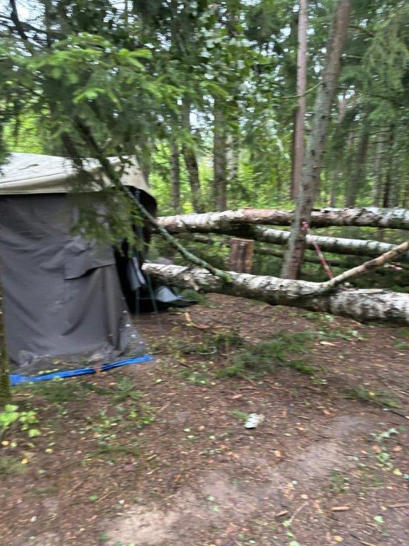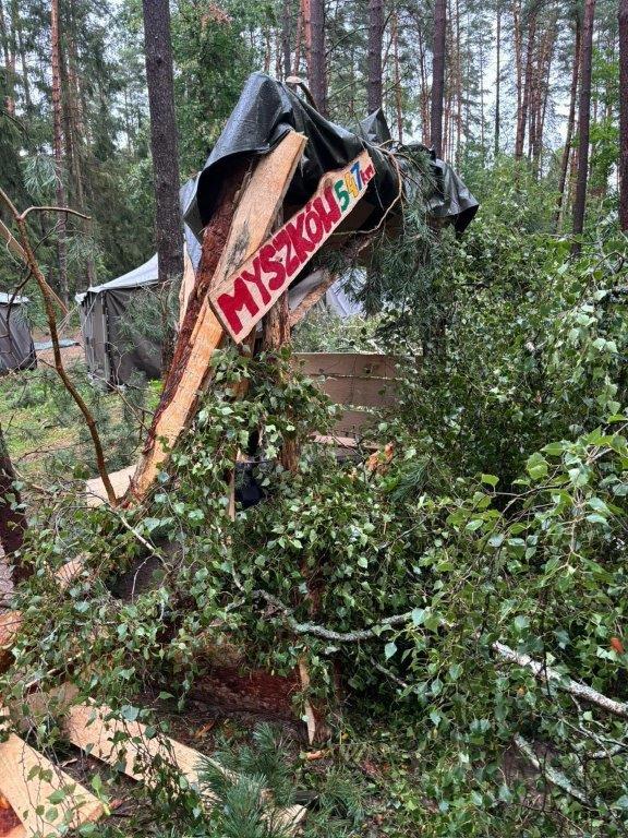 w miejscowości Przerwanki. Na miejsce natychmiast udał się zastęp OSP w Kutach, który przekazał, że w wyniku silnego wiatru jedno z obozowisk jest zniszczone. Komendant obozu zarządził ewakuację do wyznaczanego punkt i następnie do stołówki harcerskiej. Na terenie Bazy ZHP Cyranka znajdowało się w sumie 402 harcerzy. Podjęto decyzję o natychmiastowej ewakuacji dzieci do miejsc doraźnego schronienia, którą nadzorował i organizował d-ca JRG w Węgorzewie mł. bryg. Wojciech Melnik