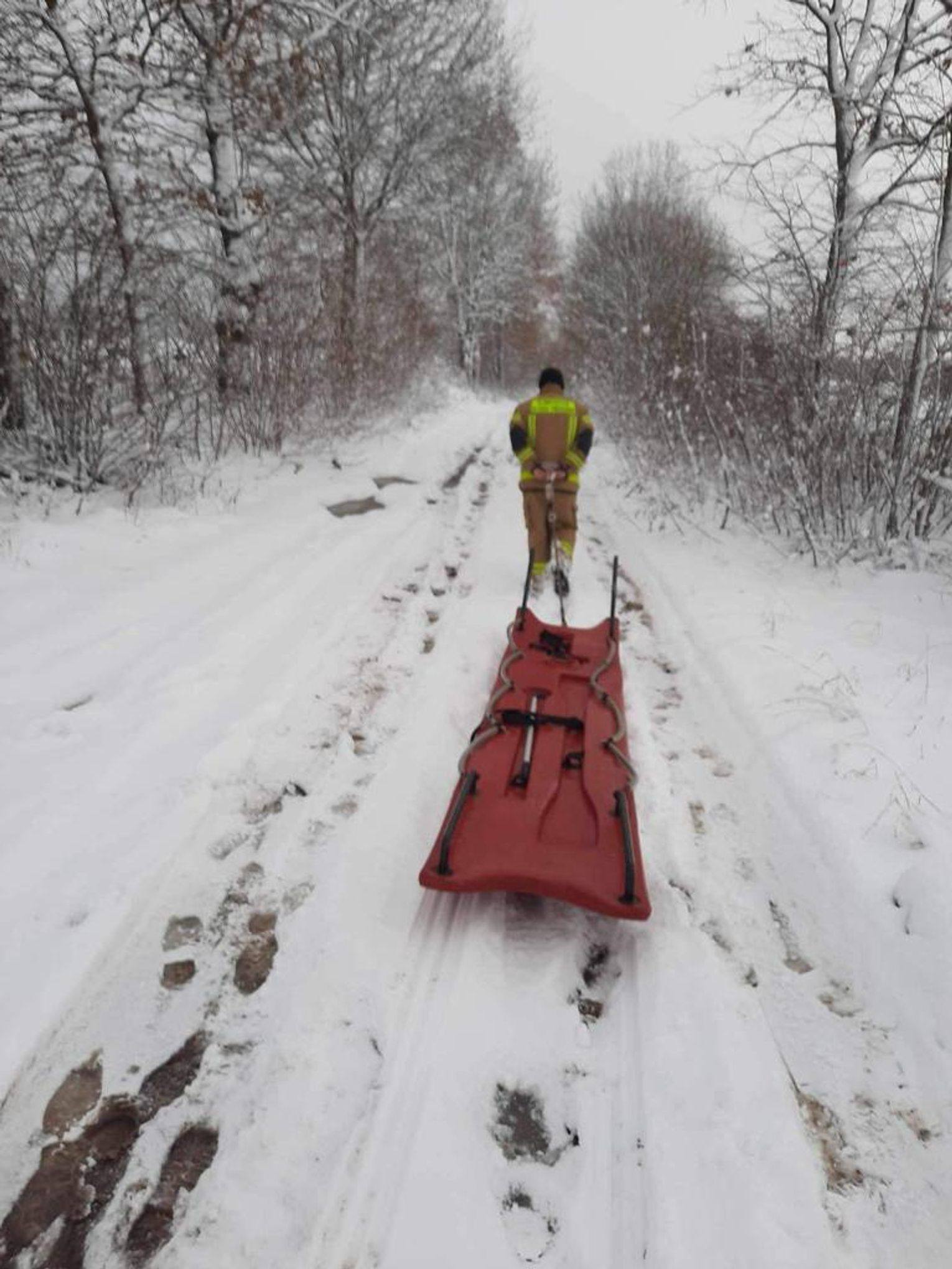 Tego samego dnia strażacy zostali wezwani do pomocy zespołowi Państwowego Ratownictwa Medycznego w pow. braniewskim. Do miejscowości Radziejewo – gm. Pieniężno wezwany został ambulans do chorego mężczyzny. Niestety pokrywa śnieżna i grząska droga uniemożliwiły dojazd karetki pogotowia do potrzebującego pomocy. Na miejsce wezwani zostali strażacy, którzy dysponują sprzętem pozwalającym na transport poszkodowanych osób, w tak niesprzyjającym terenie. Zastęp z Ochotniczej Straży Pożarnej z Pieniężna wykorzystując tak zwane ratownicze sanie lodowe, przetransportował kilkaset metrów chorego do ambulansu PRM. Podczas transportu mężczyzna był pod stałą opieką ratowników medycznych z PRM.