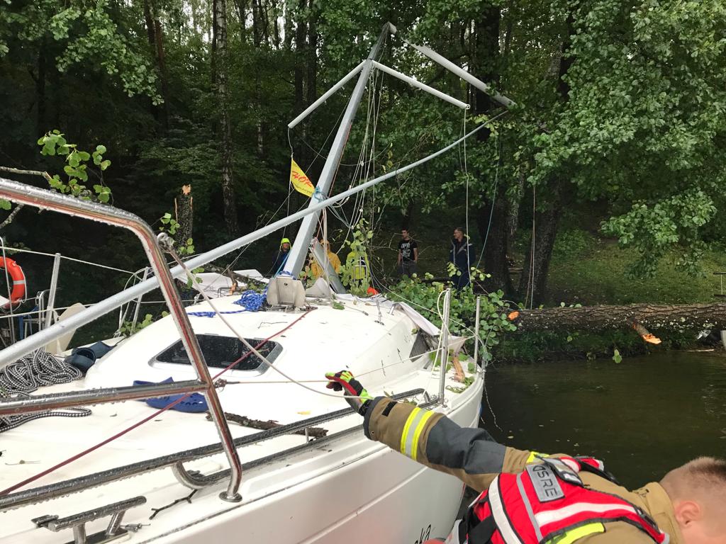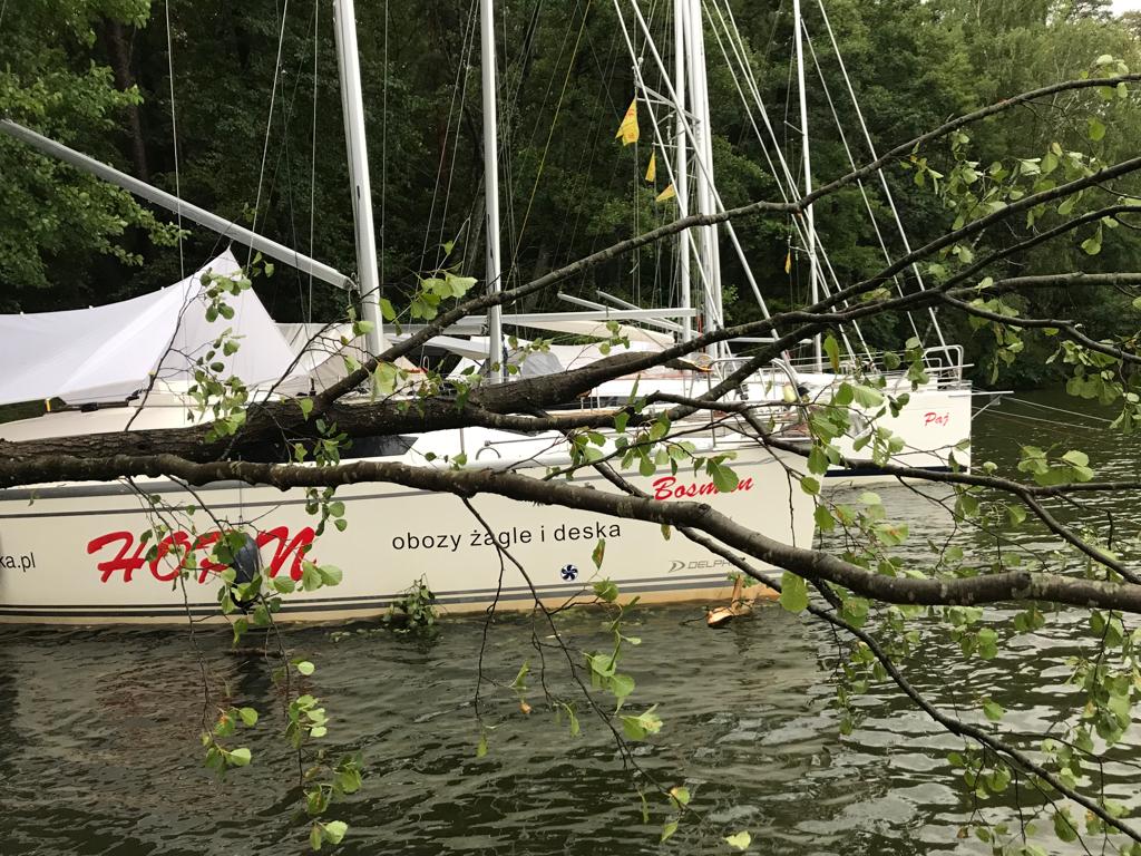 Do niebezpiecznej sytuacji doszło w Rucianem-Nidzie – pow. piski. Na przycumowany przy brzegu jacht, w którym znajdowało się pod opieką osoby dorosłej sześcioro niepełnoletnich osób, podmuch wiatru powalił drzewo. Łódź została poważnie uszkodzona. Na szczęście żeglarzom nic się nie stało. Wszyscy bezpiecznie zostali ewakuowani na brzeg.