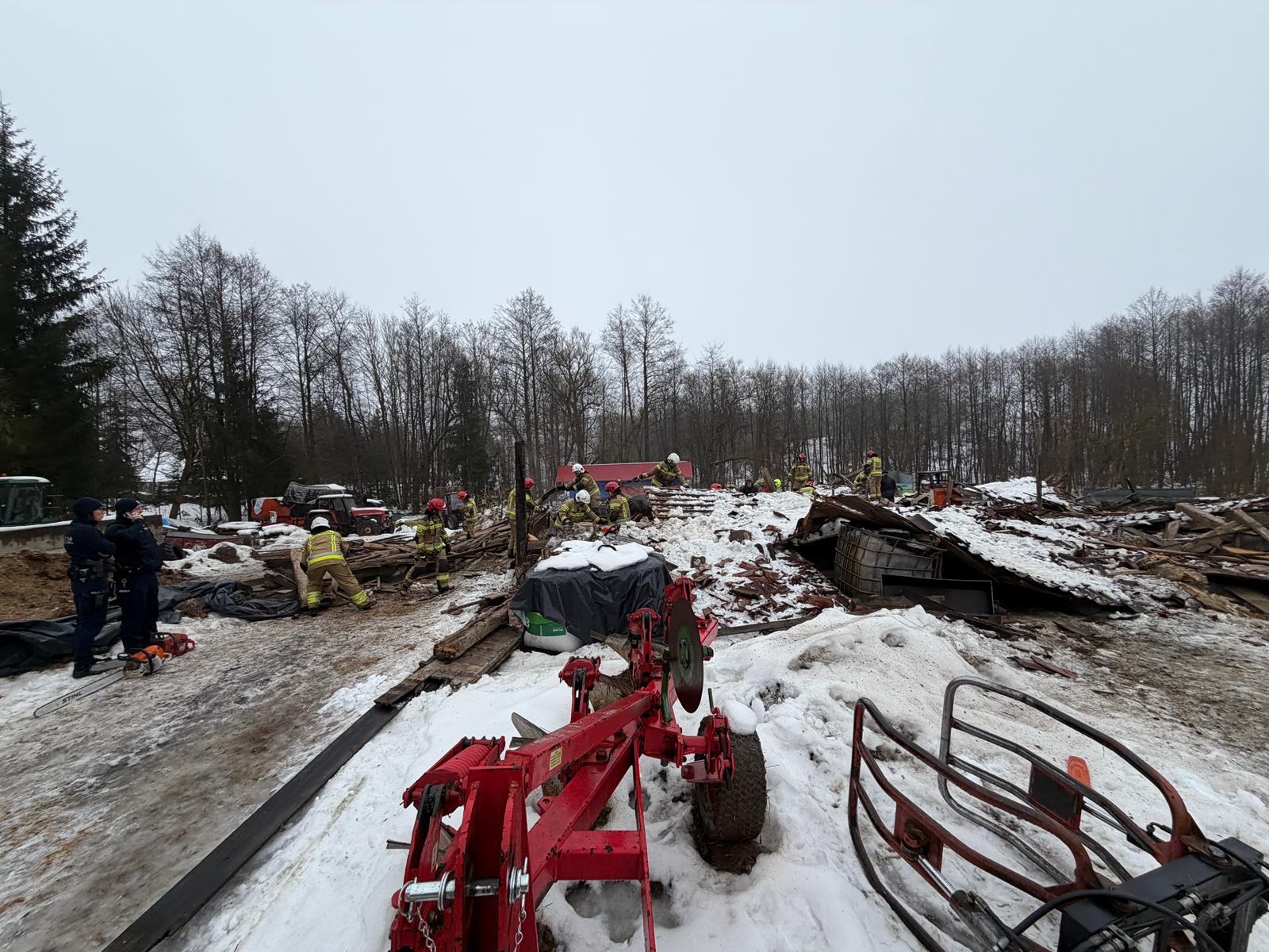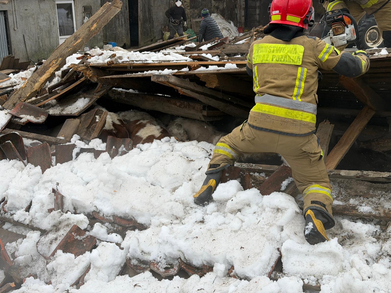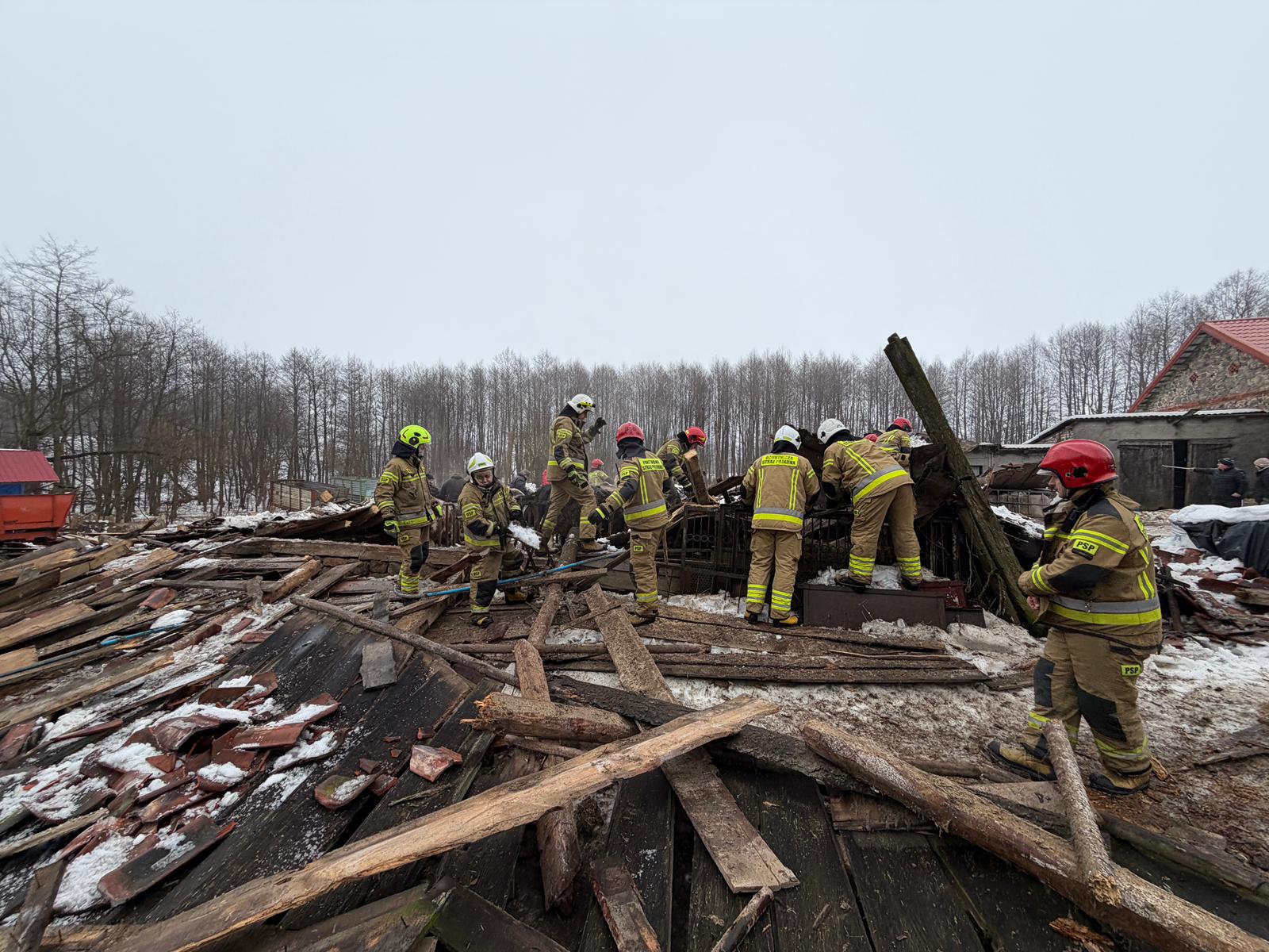 Kilka minut przed godziną dziewiątą w jednym z gospodarstw zawalił się dach na budynku gospodarskim, w którym przebywało 23 sztuki bydła. W wyniku zdarzenia zwierzęta zostały uwięzione pod konstrukcją dachu.
